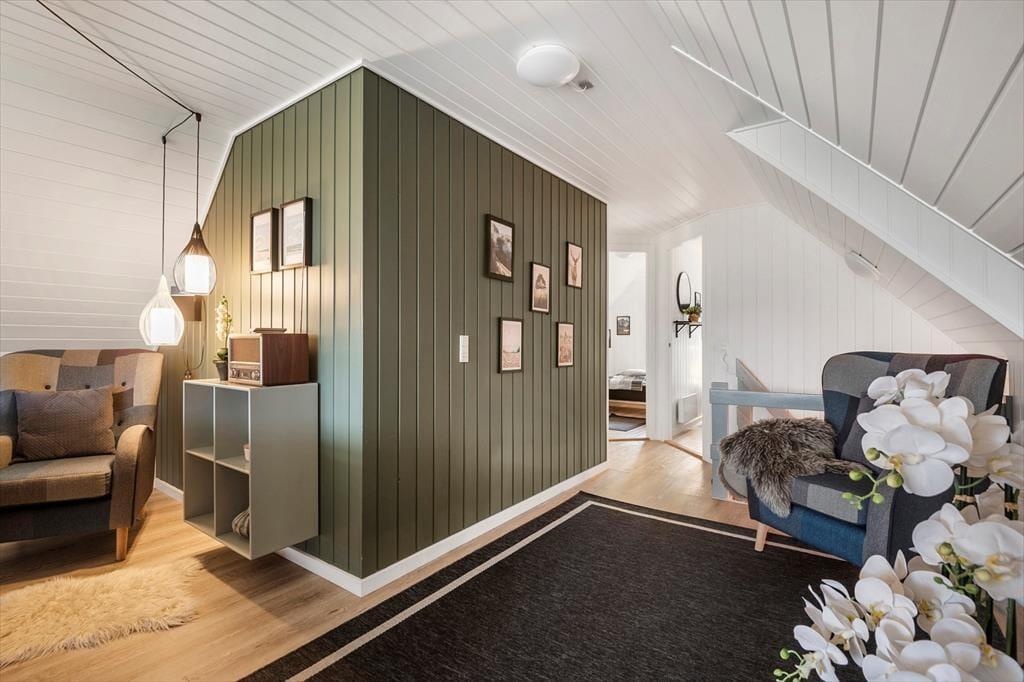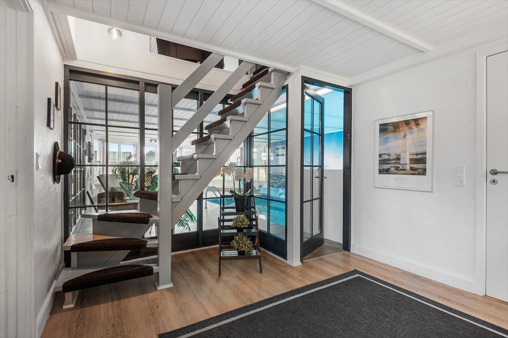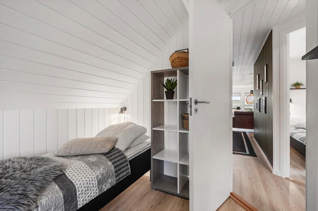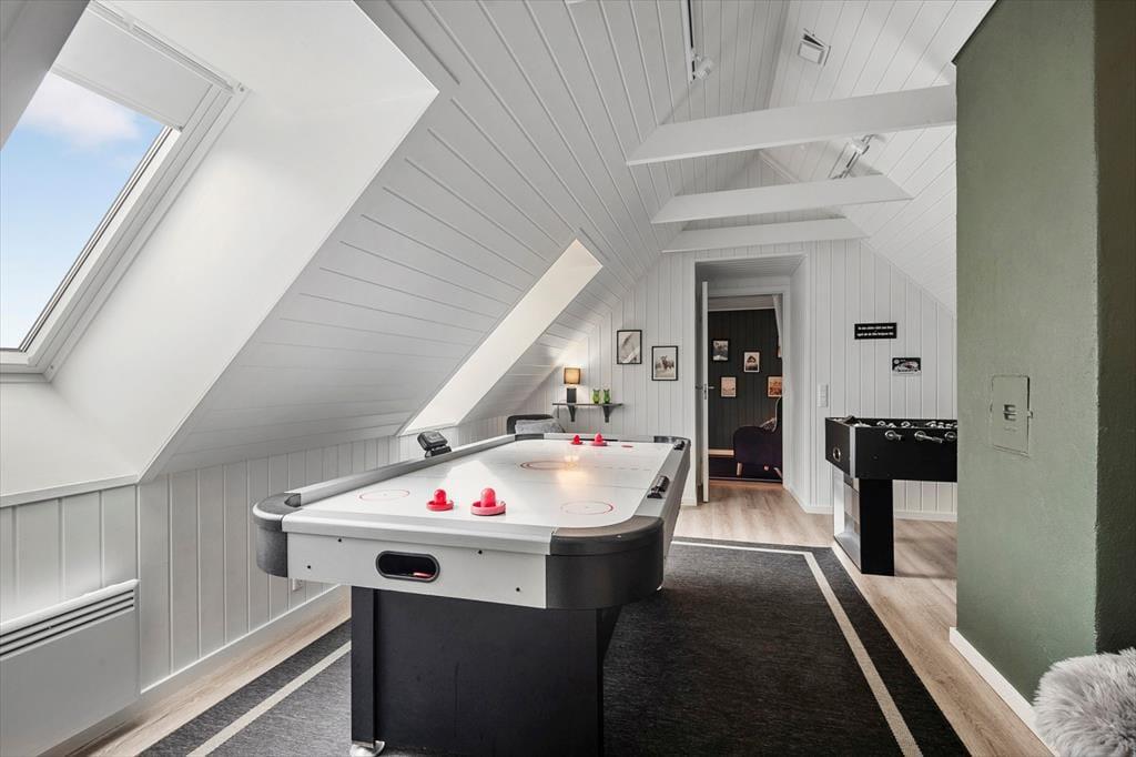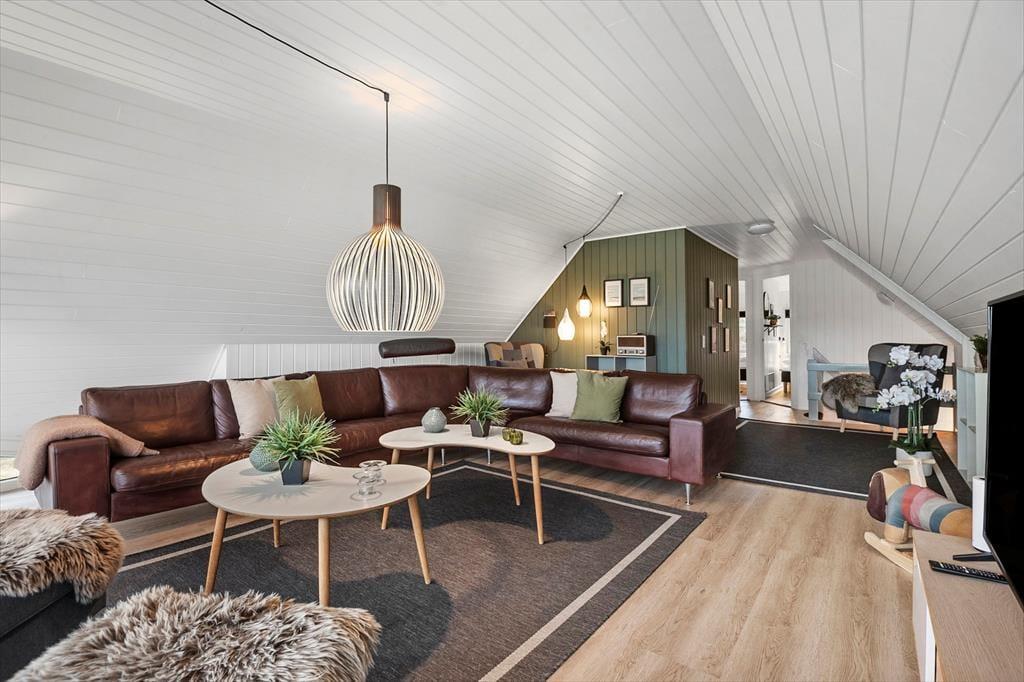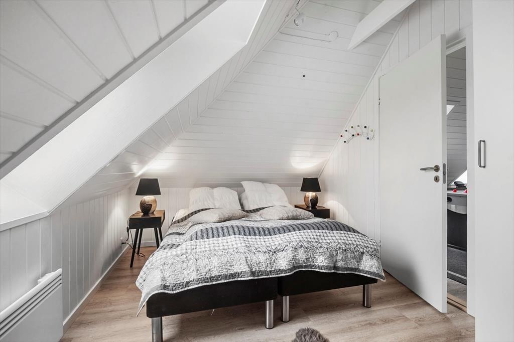 Inde i det stråtækte og særdeles velholdte sommerhus er atmosfæren lys og venlig – ikke bare i stueplan, men også på førstesalen. I alt på de to etager har I 250 m2 at brede jer på, og det betyder også, at 10 personer sagtens kan holde ferie sammen. Fire af sommerhusets fem soveværelser er placeret på førstesalen, der derudover byder på en skøn opholdsstue og et hyggeligt aktivitetsrum. Hvis I ikke bruger tiden heroppe på at spille bordfodbold og airhockey eller slappe af i sofaafdelingen, kan I samles i stueetagen – for eksempel til et lækkert måltid mad i spisestuen, der ligger i åben forbindelse med et veludstyret køkken. Et soveværelse og to badeværelser ligger også her i stueplan foruden poolafdelingen, hvor I kan benytte jer af saunaen, dampkabinen, spabadet og selve poolen.