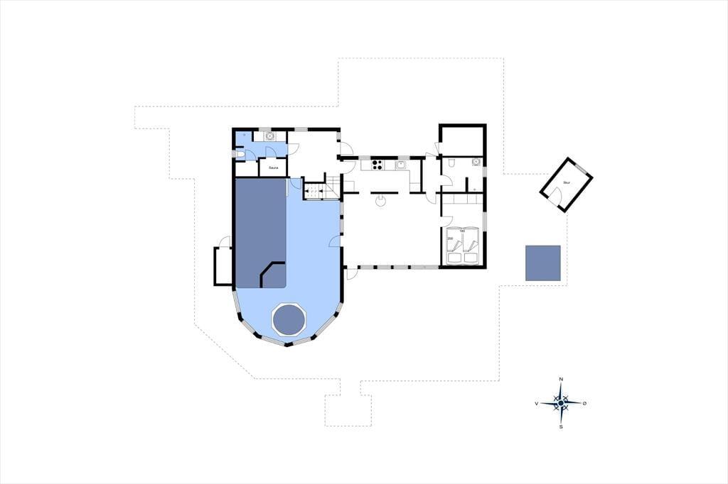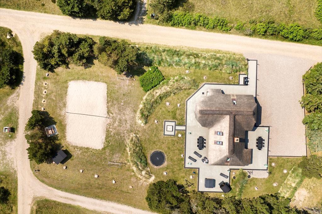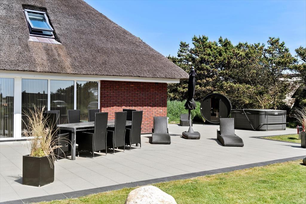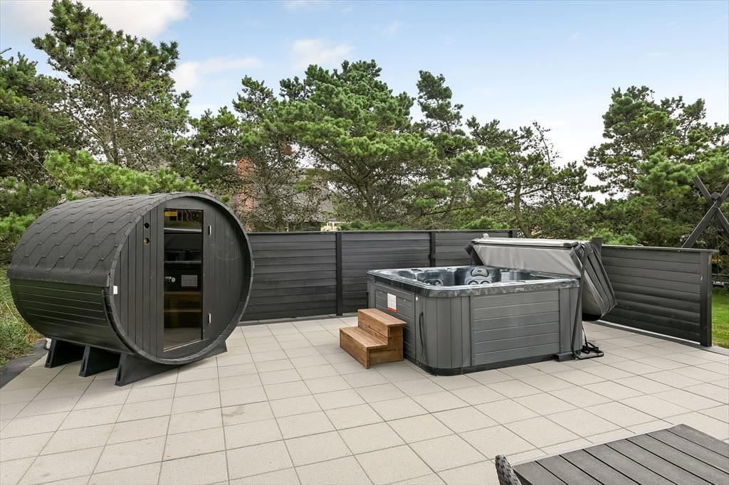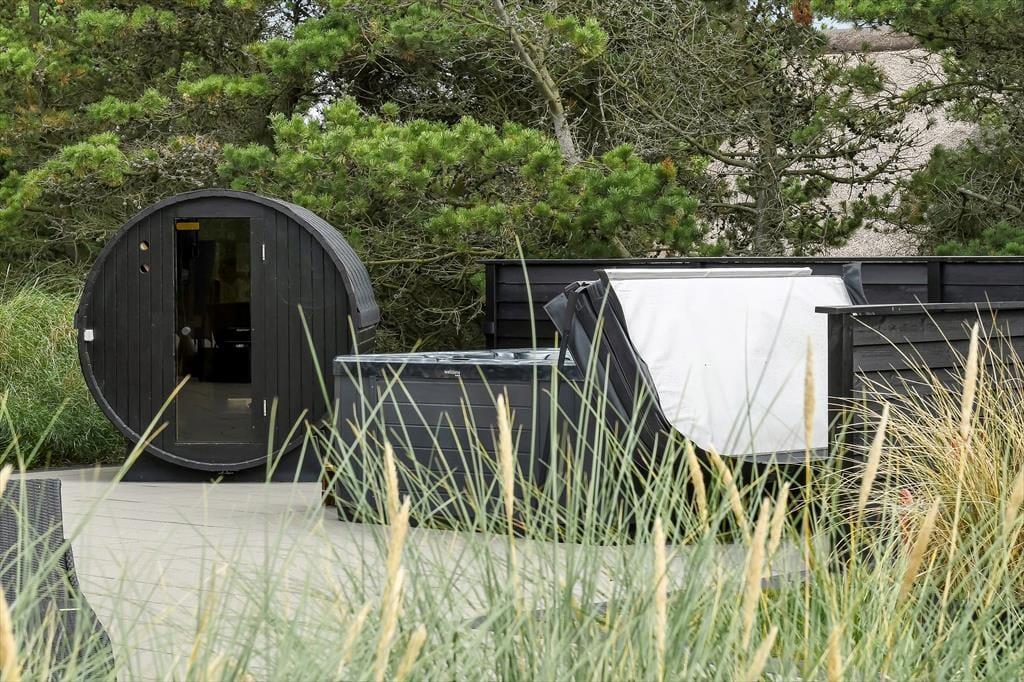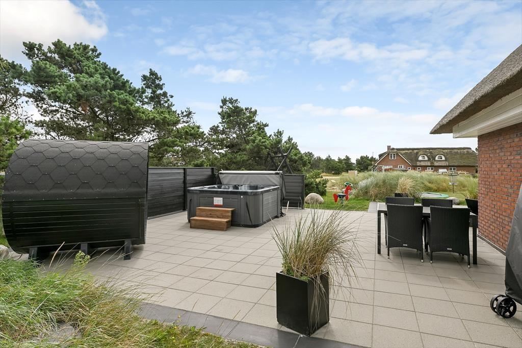 Luksustilværelsen kan også udspille sig i det fri på den store fliseterrasse, der breder sig rundt om huset. På det flotte opholdsareal kan I dække op til sommerfrokost eller tage en siesta i liggestolene, og vil I virkelig mærke feriefornemmelsen i hele kroppen, kan I lægge an til en wellness-stund i udespaen og i den flotte udesauna. Til børnene er der gynger, sandkasse og trampolin på den 2.618 m2 store grund.