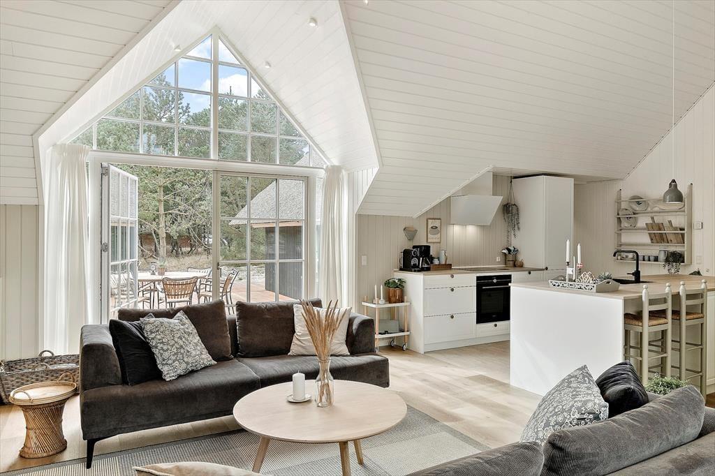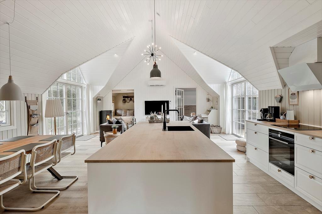 Sommerhuset har et elegant udseende med stråtag, sort træfacade og flotte terrasser. Inden døre er atmosfæren lys og let efter den grundige modernisering, og der er ikke en finger at sætte på indretningen, der er holdt i en gennemført smagfuld, klassisk stil. De fire flotte soveværelser ligger i husets vestlige ende sammen med to brusebadeværelser og et rummeligt bryggers med vaskemaskine og tørretumbler. Opholdsrummet, hvor stuen og køkkenet er forenet, ligger centralt i huset, så det er et naturligt samlingspunkt – og et skønt sted at nyde livet med lækre middage, hyggesnak i sofaafdelingen og måske ligefrem en middagslur i alkoven nær brændeovnen. Fra stuen kan I se ind i wellnessafdelingen, der er hyggeligt indrettet med loungemøbler ved siden af poolen. En sauna har I også adgang til foruden husets tredje badeværelse, der fremstår lige så lyst og velindrettet som resten af rummene.