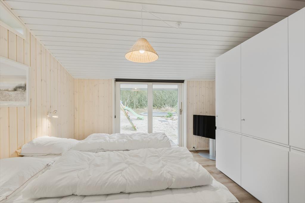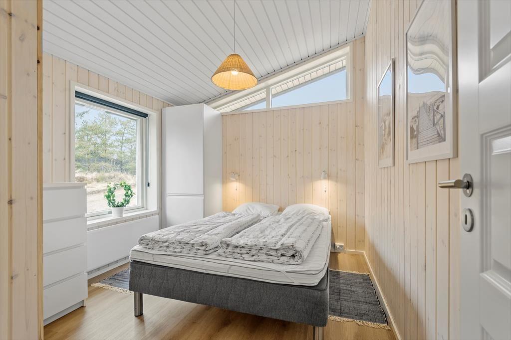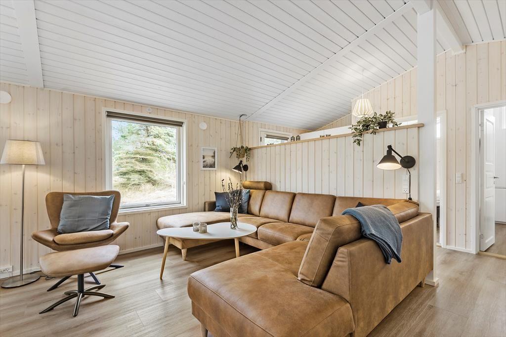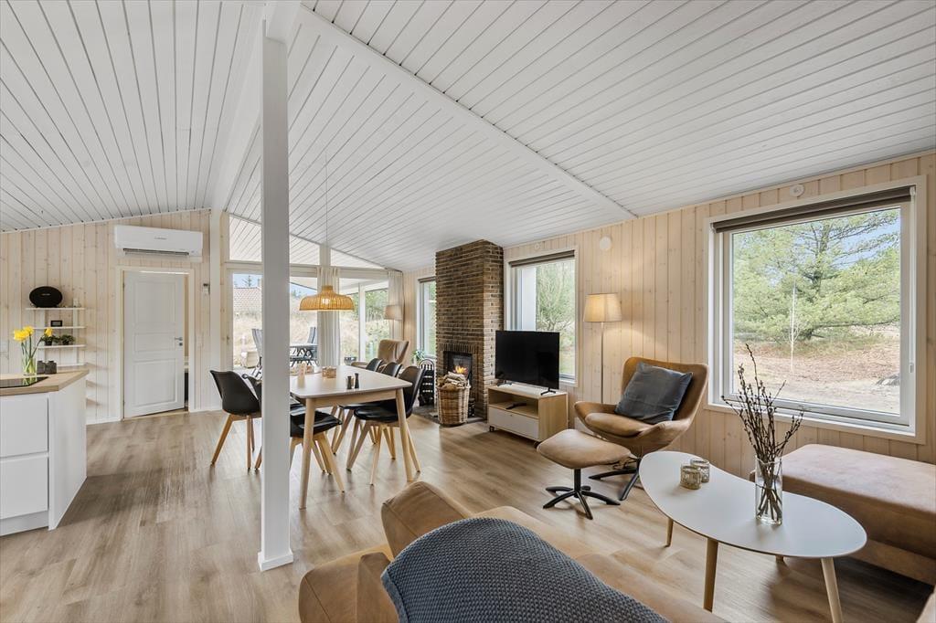 Sommerhuset er ikke bare blevet renoveret, men også tilbygget i 2023, så der nu er 102 flotte kvadratmeter at brede ferielivet ud på. Blandt andet kan I se frem til at kokkerere i et lækkert køkken med stilfuldt interiør og gode hvidevarer – og det er for øvrigt godt integreret med stuen, så I kan hyggesnakke med resten af selskabet, selvom der skal røres i gryderne. En af de klassiske detaljer, der er bevaret i stuen, er indbygningspejsen, så I kan nyde varmen og skæret fra flammerne, når I slapper af i sofaen. Fladskærms-tv’et står klar til at levere underholdningen, hvis ikke I bare laderne tankerne flyve, mens I kigger ud på naturgrunden gennem stuens store vinduer. De fire soveværelser, der alle er udstyret med dobbeltseng, er fordelt i begge ender af huset, og planløsningen fuldendes af et brusebadeværelse og et gæstetoilet.