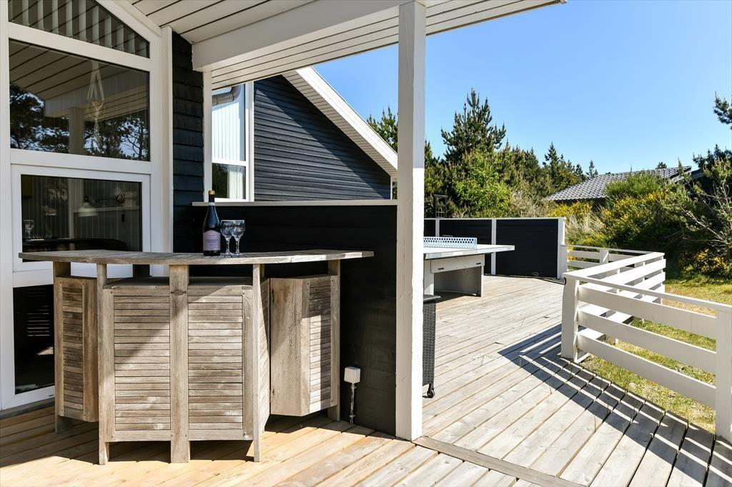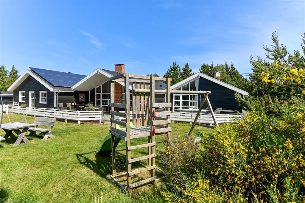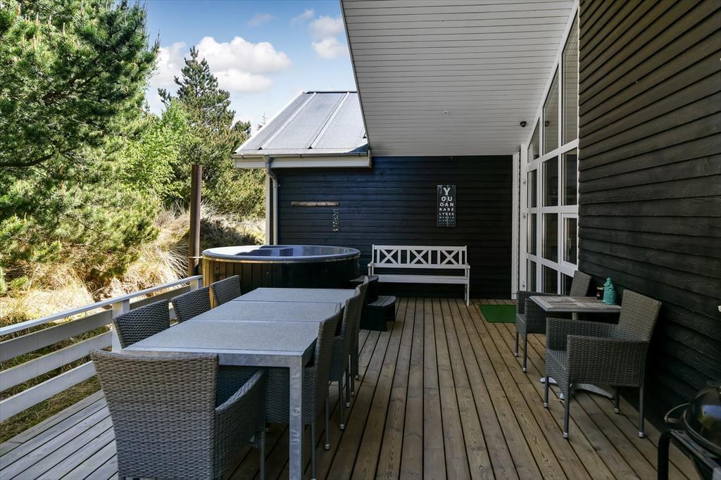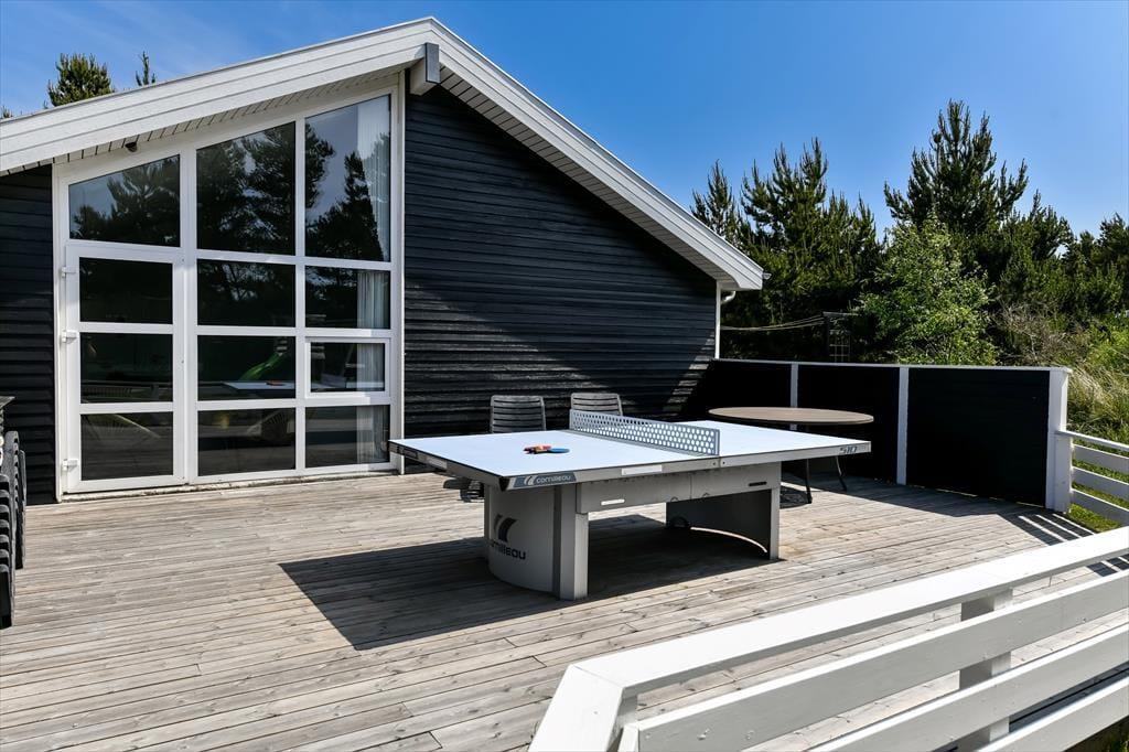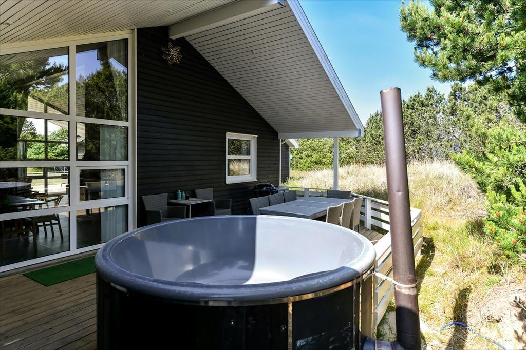 Den indendørs wellnessafdeling er fantastisk, men det er nu også fremragende at have et vildmarksbad ude på terrassen. Er det ikke tid til et bad under stjernehimlen, men derimod sjov og ballade, er der et bordtennisbord og fodboldmål i det fri – og derudover gynge, sandkasse og trampolin til de yngste feriegæster. Det sydvendte terrassemiljø skal nok blive et hit, når solen skinner, og takket være udekøkkenet bliver grillaftenerne endnu bedre. Huset er forsynet med solceller, der indgår i driften af huset, og dermed minimerer udgiften til el-forbrug.