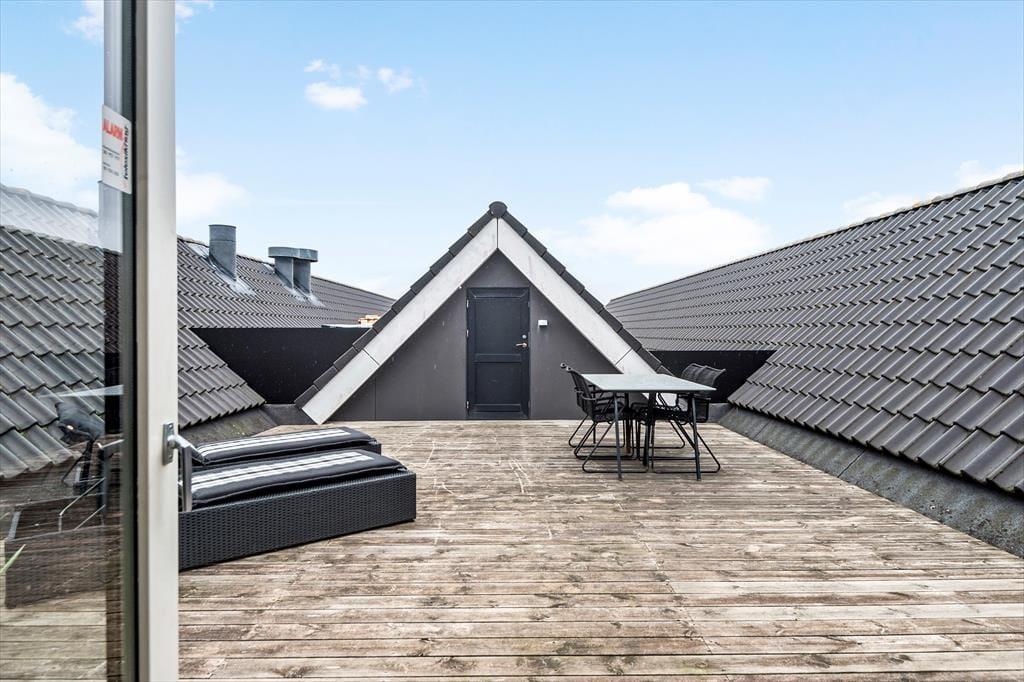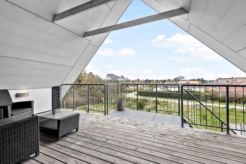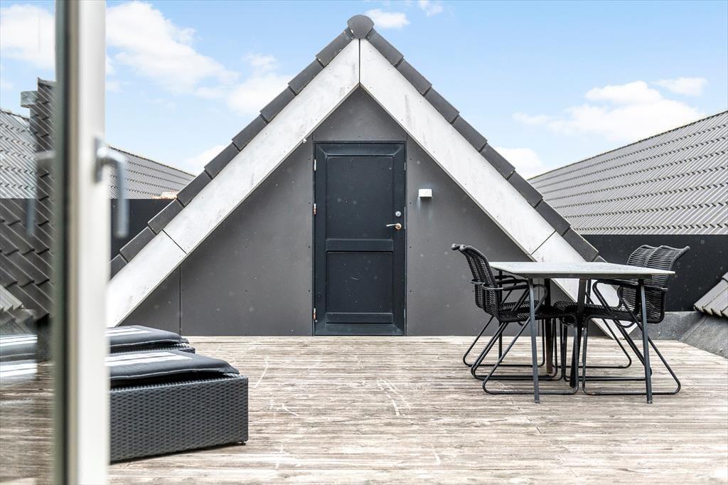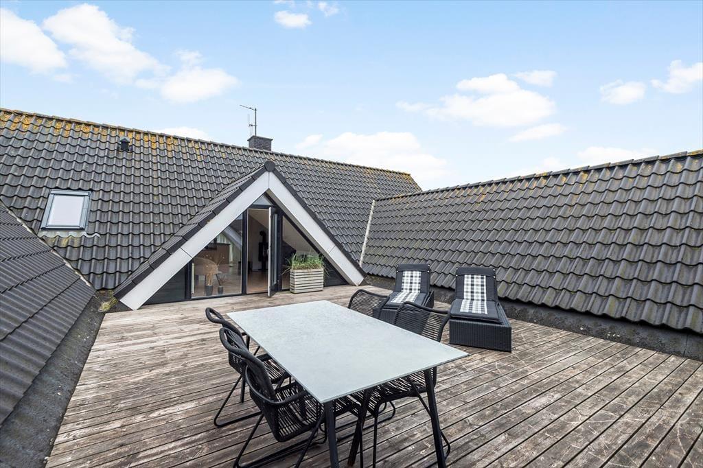 Den private tagterrasse er ferielejlighedens perle. Her kan I solbade ugeneret, nyde måltider under åben himmel og betragte stjernerne om aftenen. Tagterrassen er udstyret med komfortable havemøbler, så I kan slappe af i fulde drag. Uanset om I ønsker at læse en bog, nyde et glas vin eller bare nyde stilheden, er denne terrasse det perfekte sted. Lejligheden har også en lille terrasse i stueplan, hvor I kan sidde i skyggen på varme dage. Begge terrasser er skabt til at give jer en følelse af luksus og afslapning midt i den smukke, vestjyske natur.