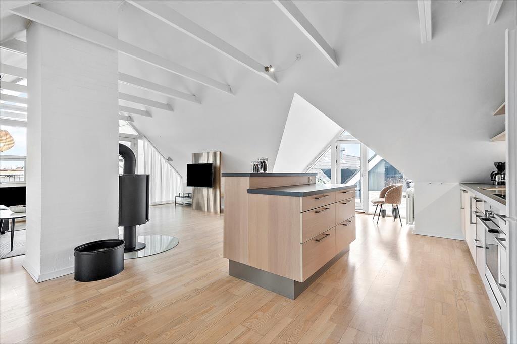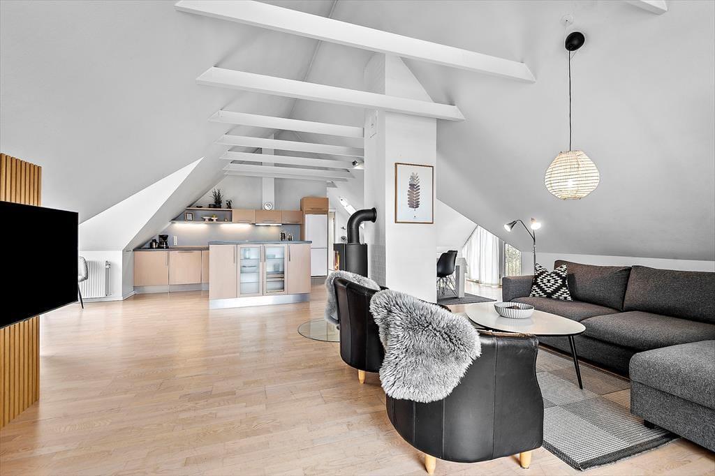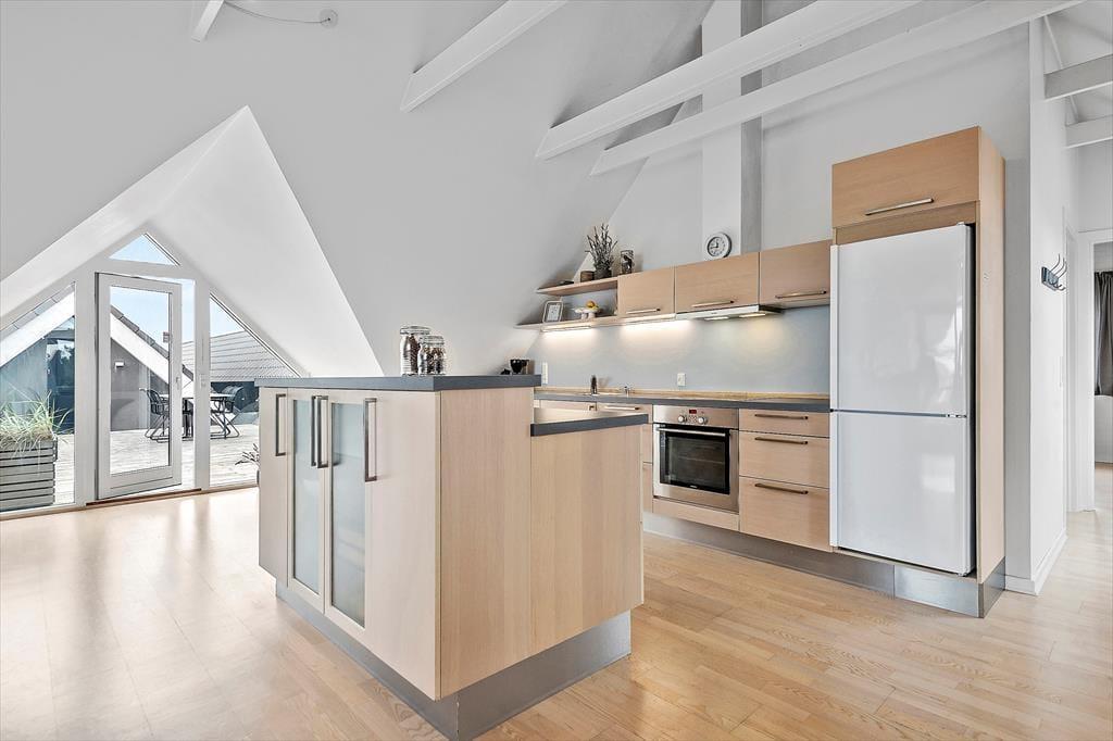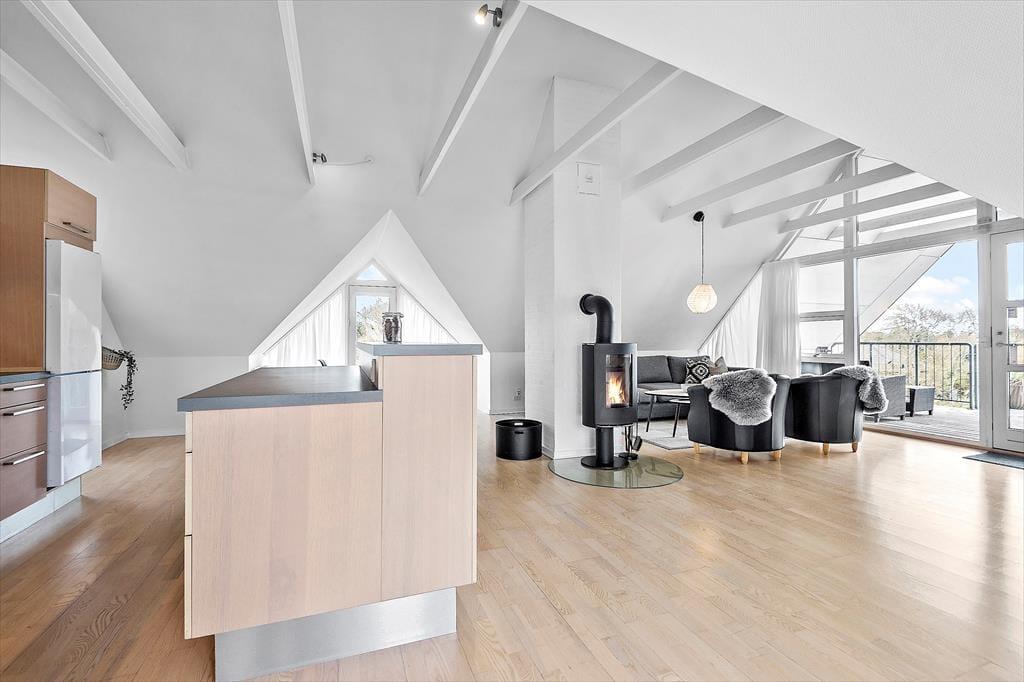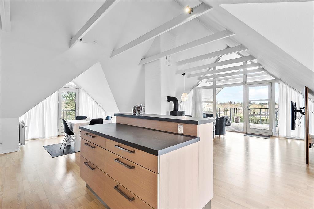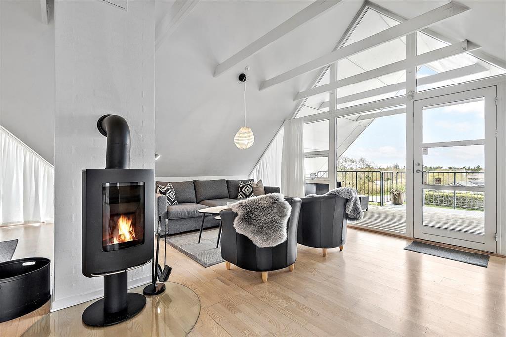 Den moderne ferielejlighed er perfekt til en romantisk ferie for to. Indretningen er elegant og nutidig med et lyst og åbent interiør, der skaber en indbydende atmosfære. Den hyggelige stue med brændeovn inviterer til afslapning foran de knitrende flammer, mens du nyder en god bog eller en film på TV'et. Køkkenet er fuldt udstyret og ligger i åben forbindelse med stuen, så I kan nyde hinandens selskab, selv når der kokkereres. Fra soveværelset er der direkte adgang til den private tagterrasse, hvor I kan nyde morgenkaffen med udsigt over Blåvand og mærke roen sænke sig.