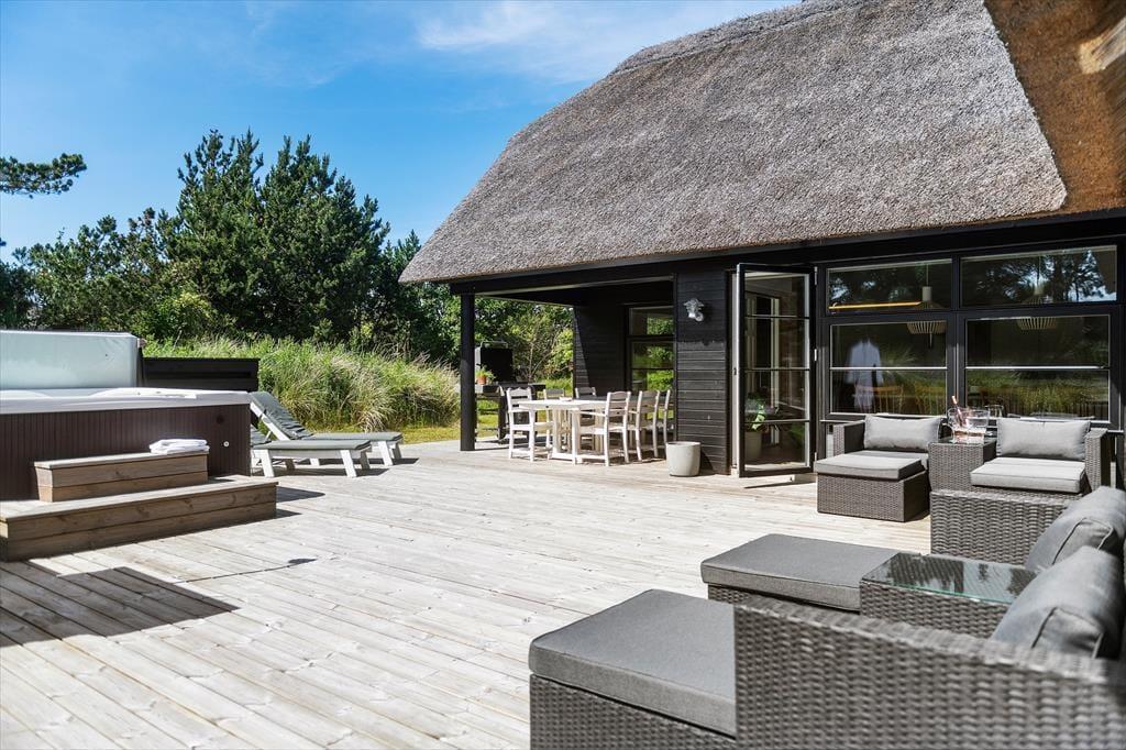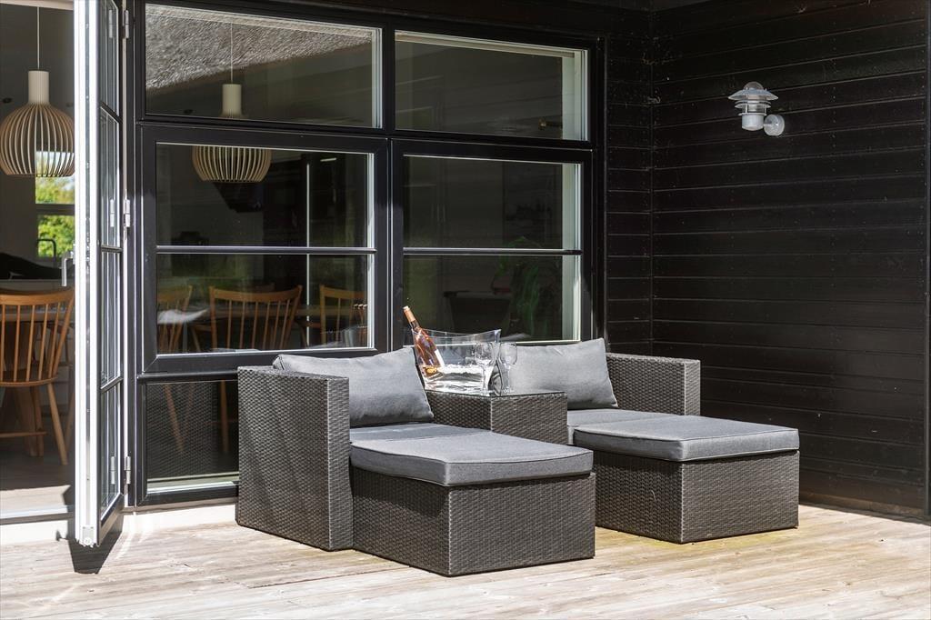 Sommerhusets terrasse er indbydende med en dejlig, og er samtidig perfekt til at slikke sol eller nyde en kølig drink. Der er indrettet flere siddegrupper, og på de lune sommeraftener kan du tænde op i grillen og tilberede et lækkert måltid, som kan nydes under åben himmel. Haven er omkranset af grøn beplantning, hvilket sikrer privatliv og ro. Når du har brug for en pause fra solen, kan du slappe af i en af havens hyggelige kroge, hvor du kan høre fuglene kvidre og mærke en let brise fra Vesterhavet.