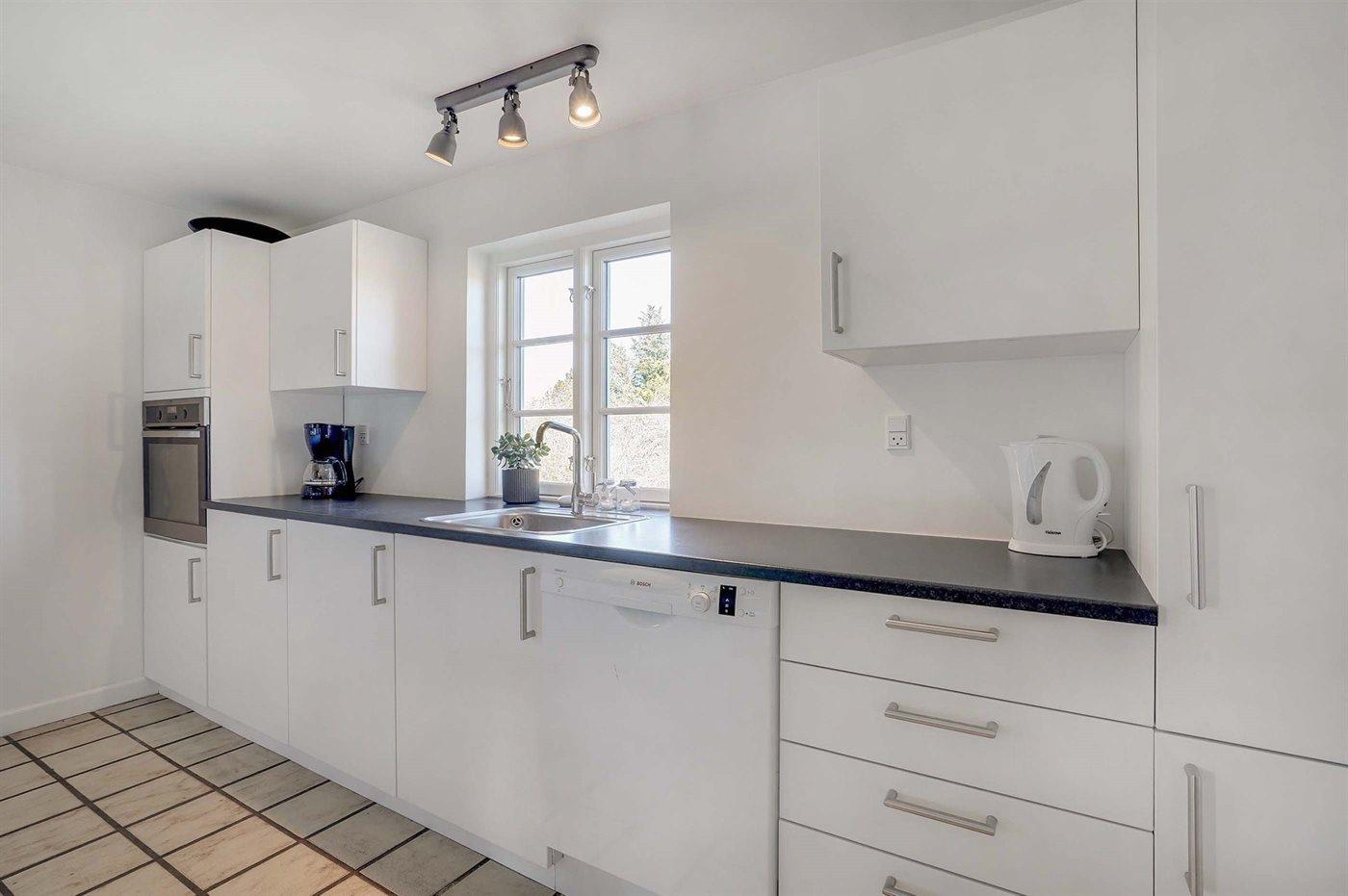 Køkkenet er udstyret med 1 køleskab. Der er 4 keramiske kogeplader, varmluftovn, mikrobølgeovn samt opvaskemaskine Der er gulvvarme i køkkenet.
