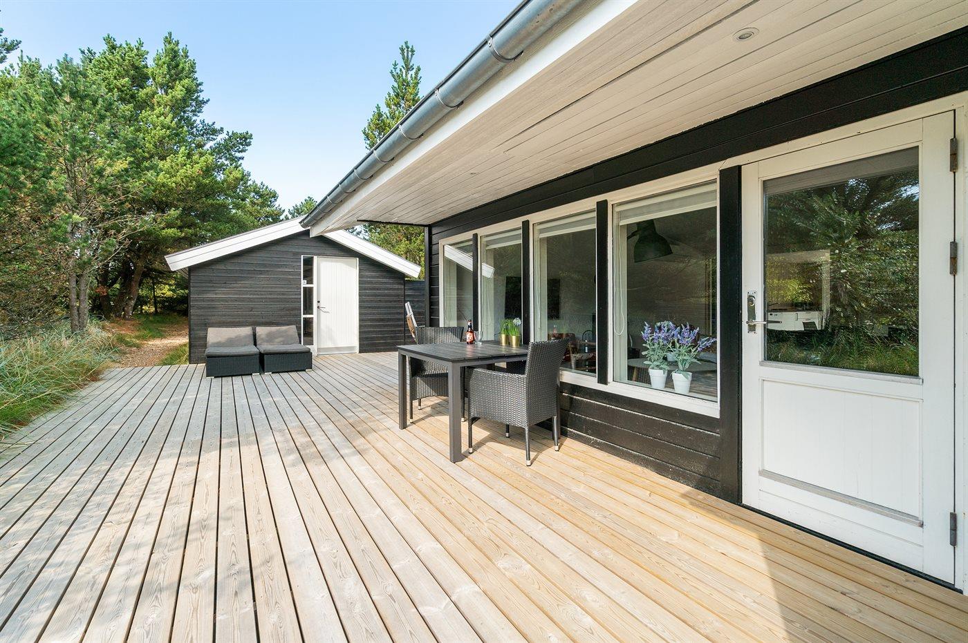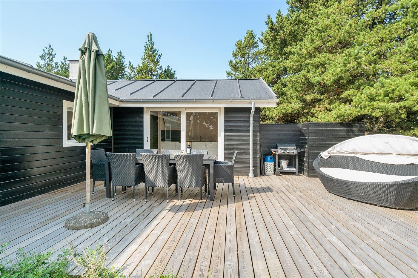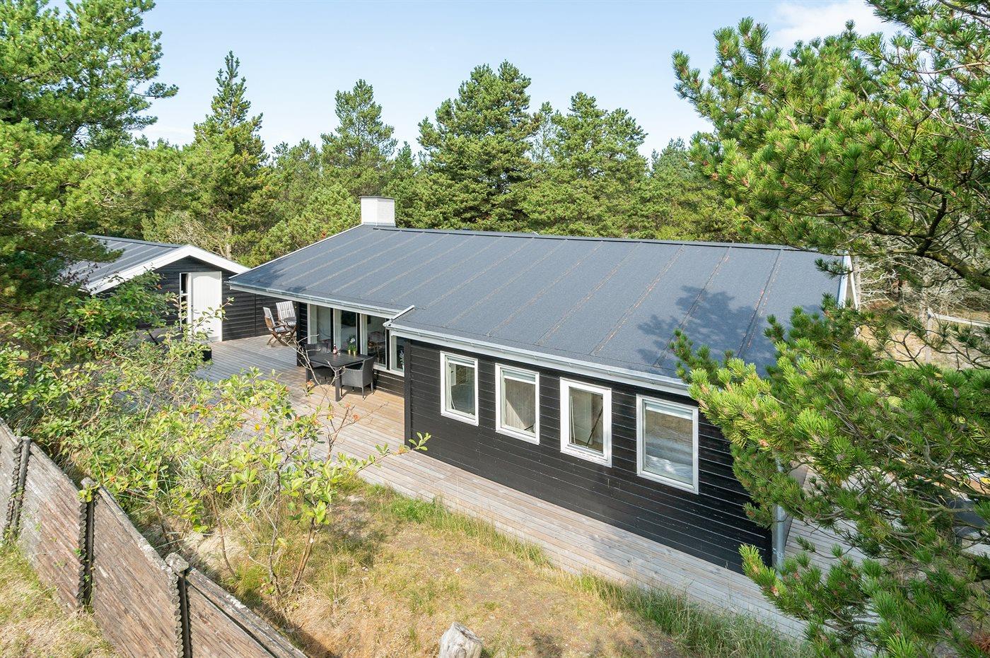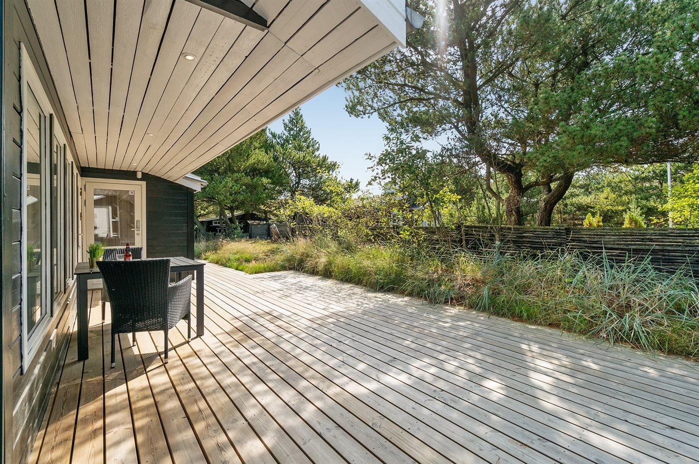 Ferieboligen er beliggende på en 2100 m² stor naturgrund. Der er 900 m til havet. Nærmeste forretning er beliggende i en afstand af 500 m. Til ferieboligen hører 125 m² terrasseareal. Desuden er der 8 m² overdækket terrasse. Gynge. Sandkasse. Trampolin. Grill til rådighed. Parkering ved ferieboligen.