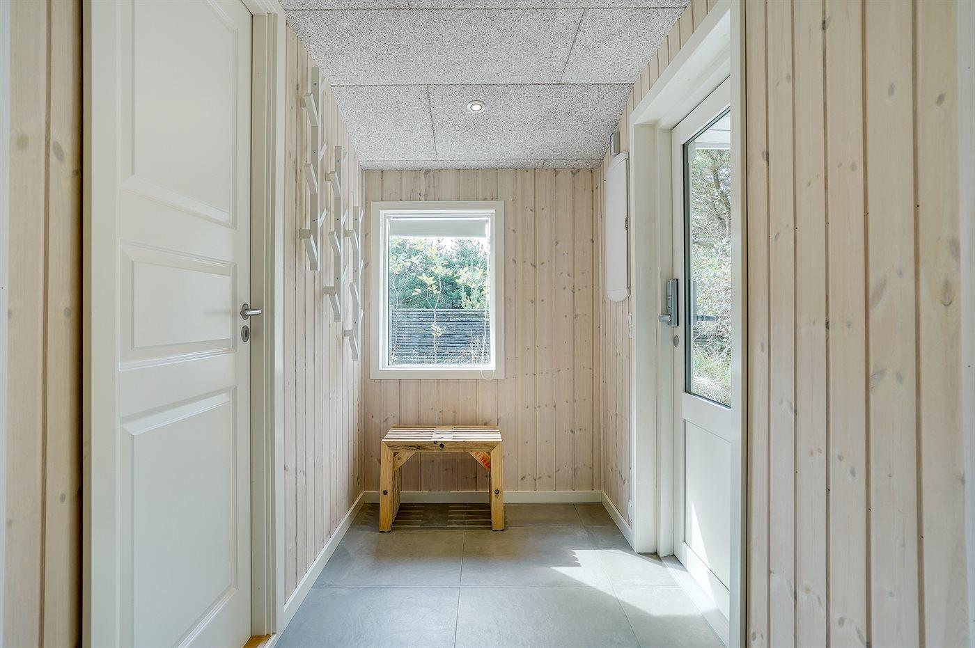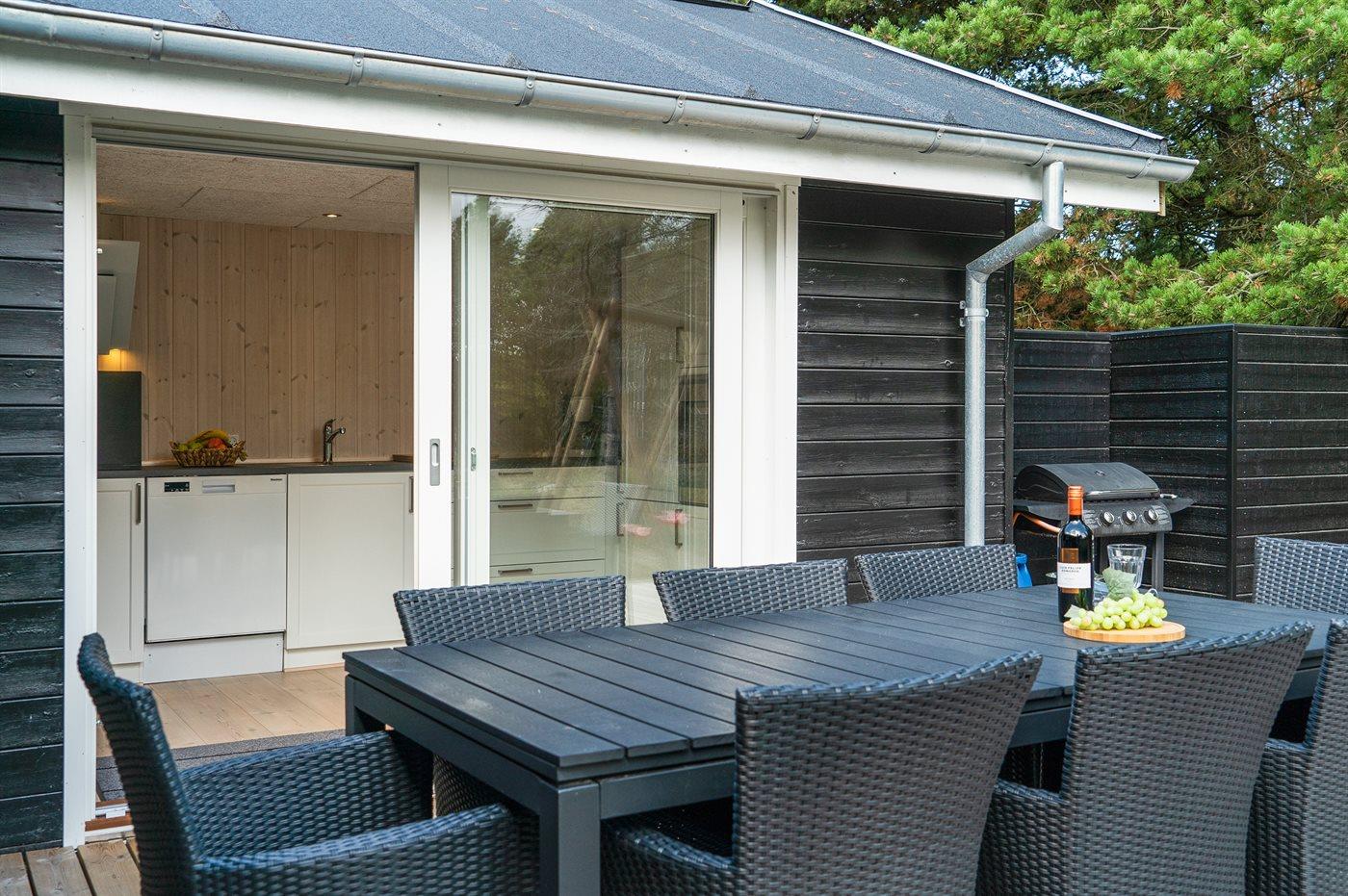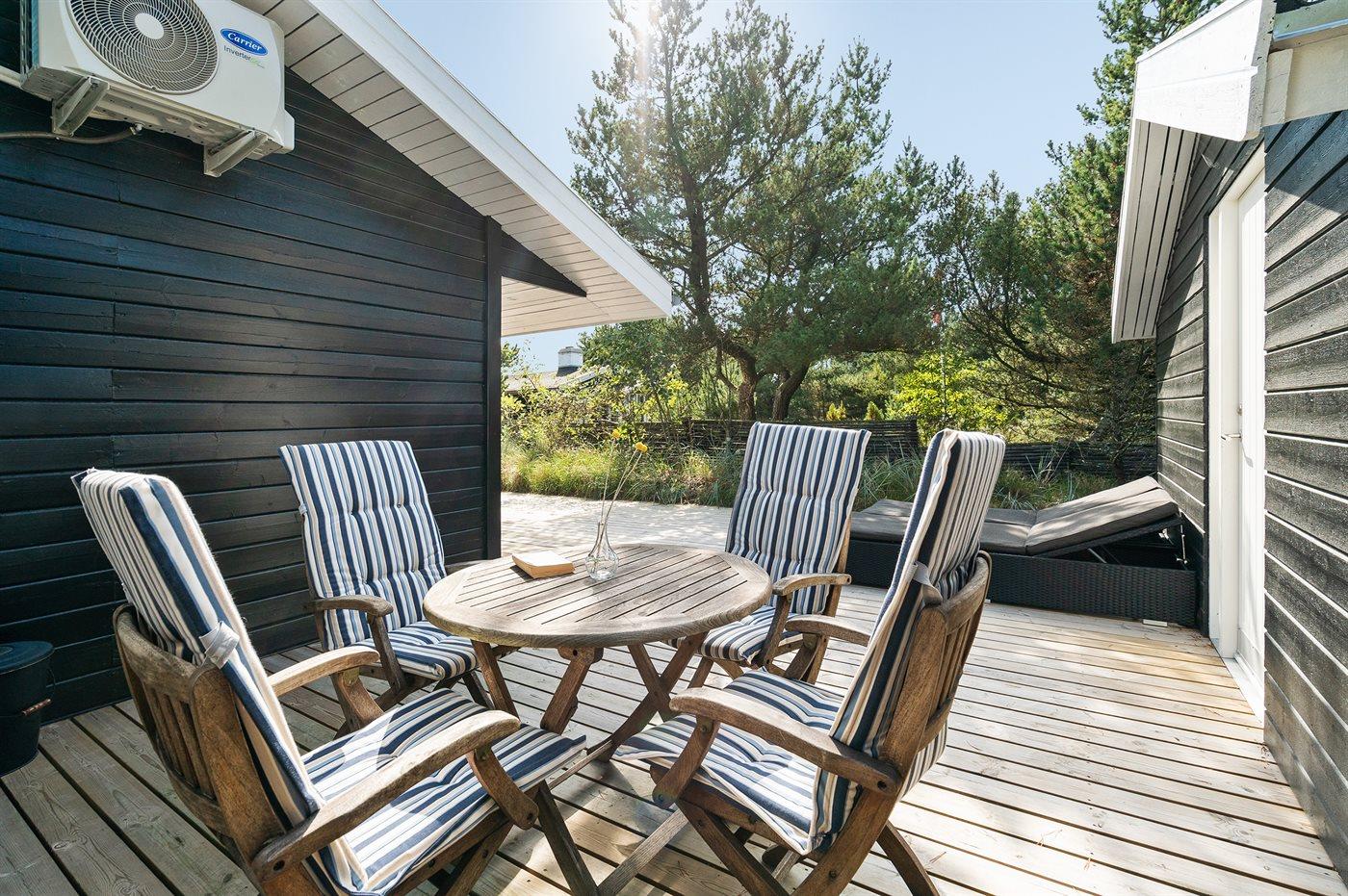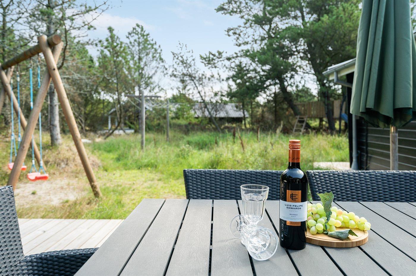 Ferieboligen er beliggende på en 2100 m² stor naturgrund. Der er 900 m til havet. Nærmeste forretning er beliggende i en afstand af 500 m. Til ferieboligen hører 125 m² terrasseareal. Desuden er der 8 m² overdækket terrasse. Gynge. Sandkasse. Trampolin. Grill til rådighed. Parkering ved ferieboligen.