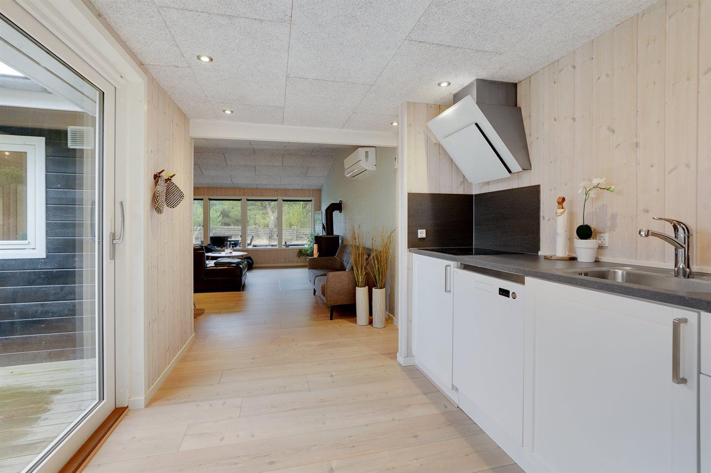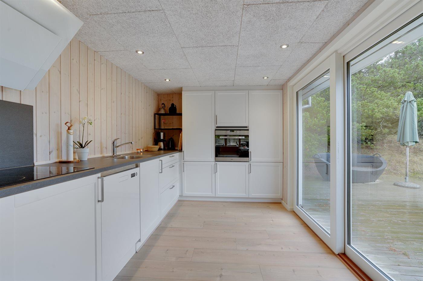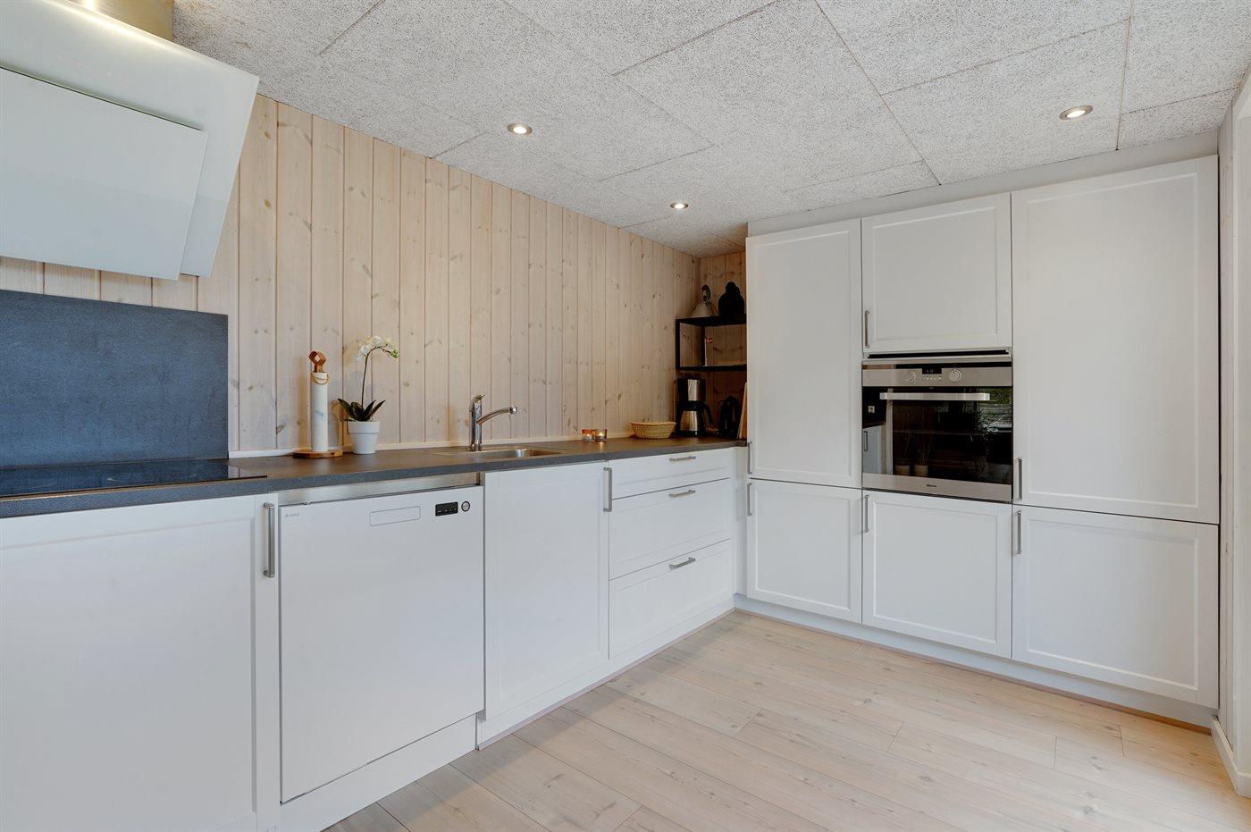 Køkkenet er udstyret med 1 køleskab. Der er 4 keramiske kogeplader, varmluftovn, mikrobølgeovn samt opvaskemaskine.