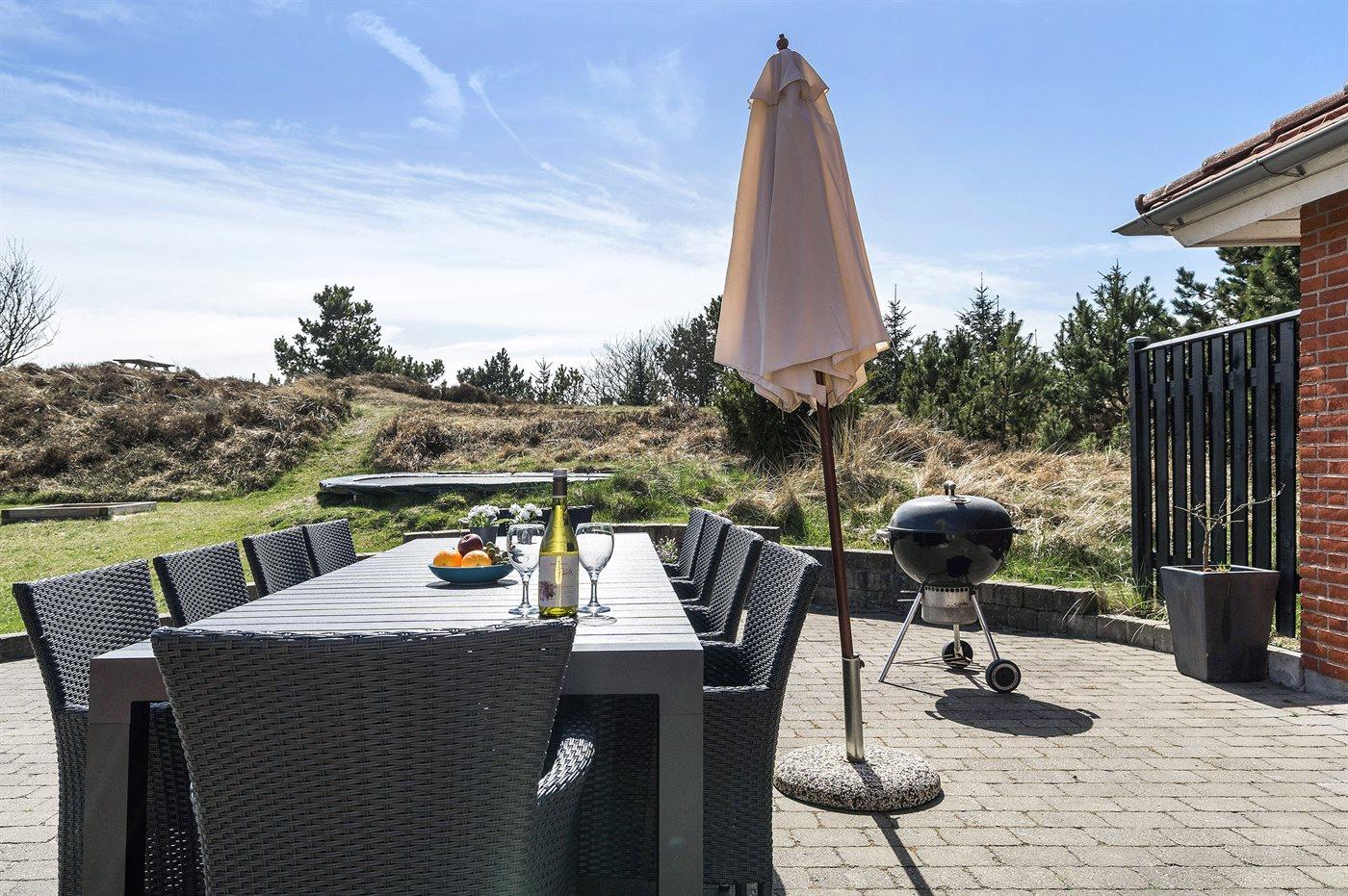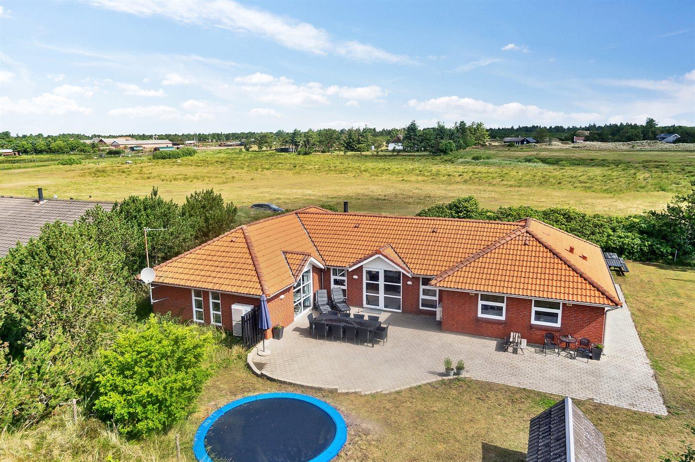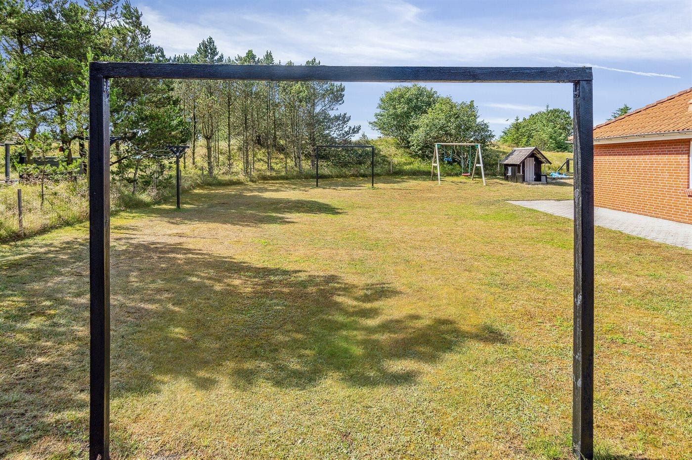 Ferieboligen er beliggende på en 2380 m² stor naturgrund. Grunden er indhegnet. Der er 800 m til havet. Nærmeste forretning er beliggende i en afstand af 2000 m. Til ferieboligen hører 48 m² terrasseareal. Gynge. Sandkasse. Legehus. Trampolin. Fodboldmål. Grill til rådighed. Parkering ved ferieboligen.