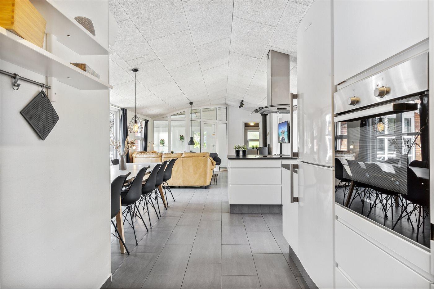 Køkkenet er udstyret med 1 køleskab. Der er 4 keramiske kogeplader, varmluftovn, mikrobølgeovn samt opvaskemaskine Der er gulvvarme i køkkenet.