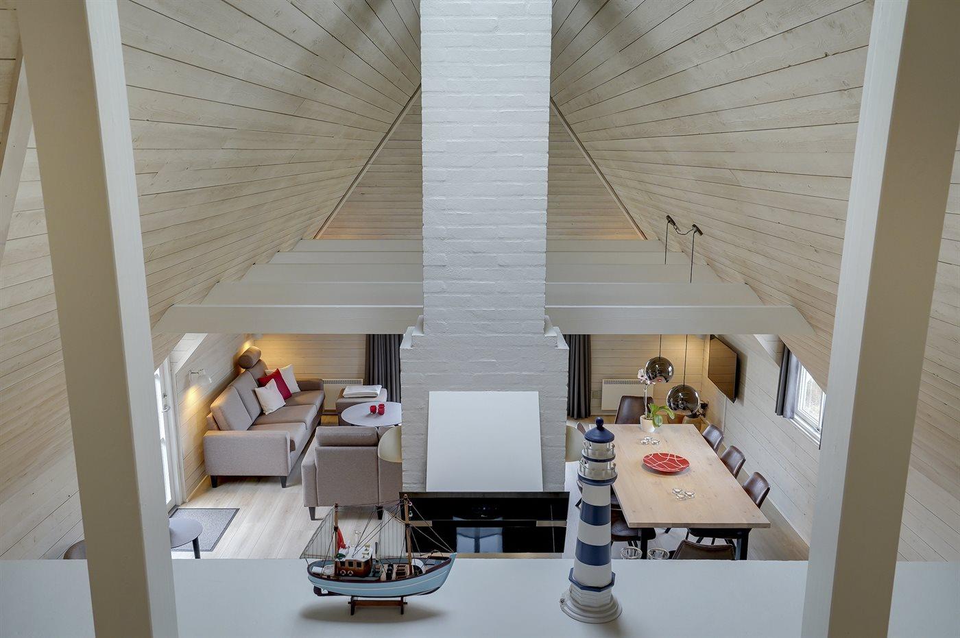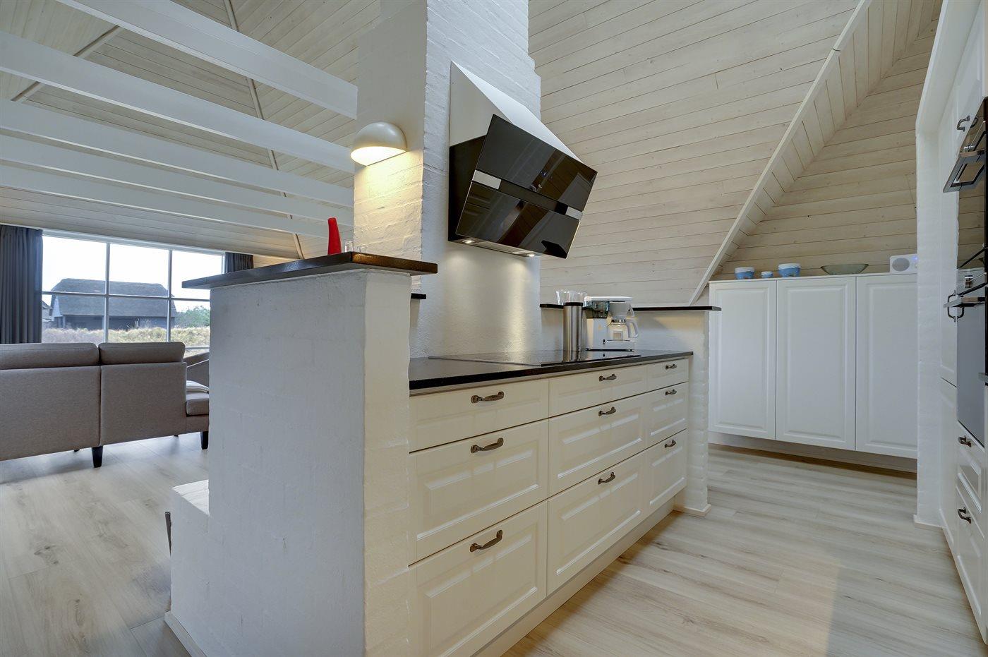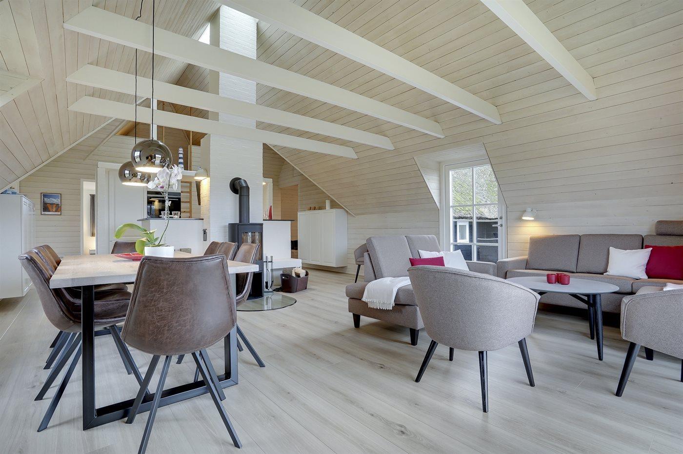 Entreen er lys og rummelig. Det flotte og moderne køkken er kombineret med spise-/opholdsstuen og bl.a. udstyret med integreret opvaskemaskine og køleskab. Sorte polerede granitbordplader, 4 induktionskogeplader, varmluftsovn og combi ovn med mikrobølgeovn. I den lyse, moderne og smagfuldt møblerede spise-/opholdsstue med direkte udgang til en 30 m2 stor terrasse med havemøbler, finder I TV, DAB-radio og brændeovn. Der er mindst 4 danske kanaler. 1-3 svenske kanaler. 1-3 norske kanaler. Mindst 4 tyske kanaler. Der er trådløst internetforbindelse til rådighed.