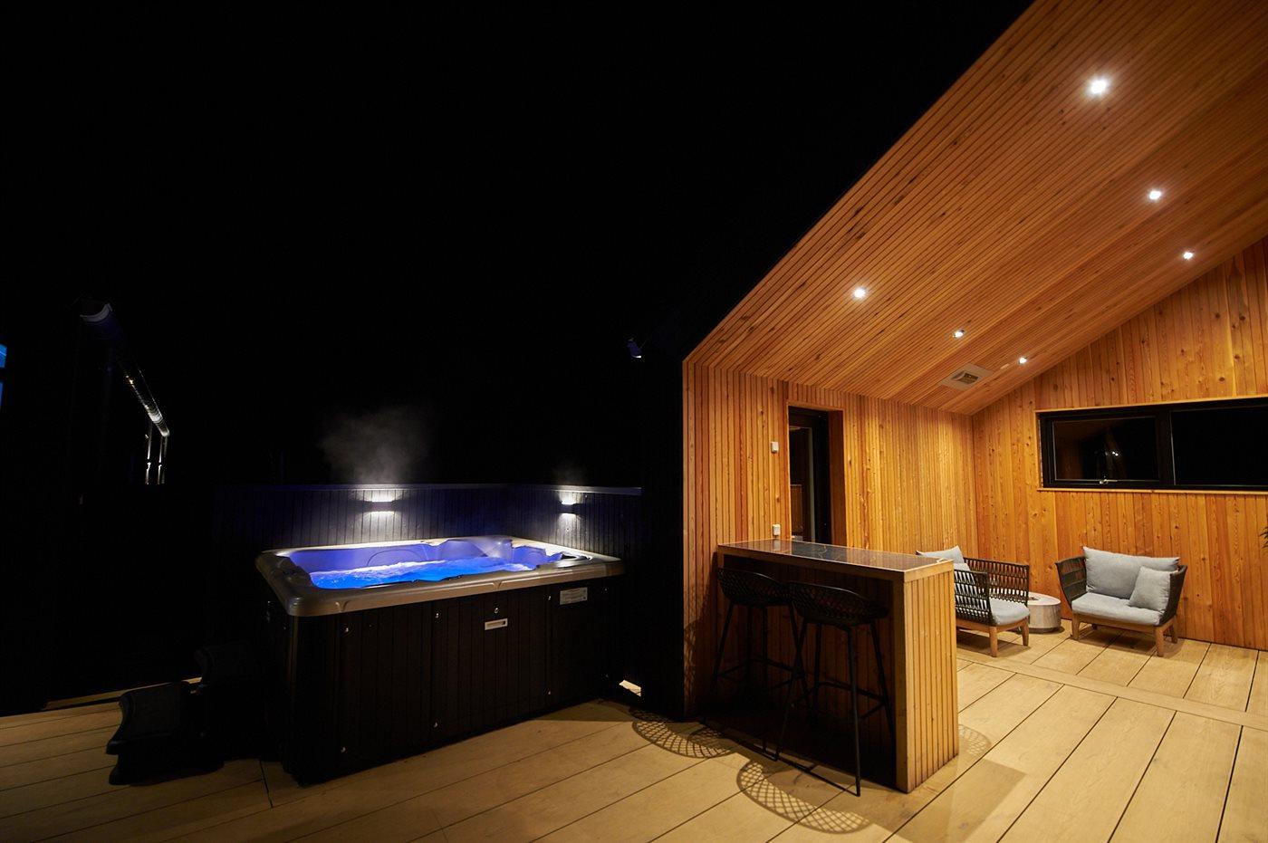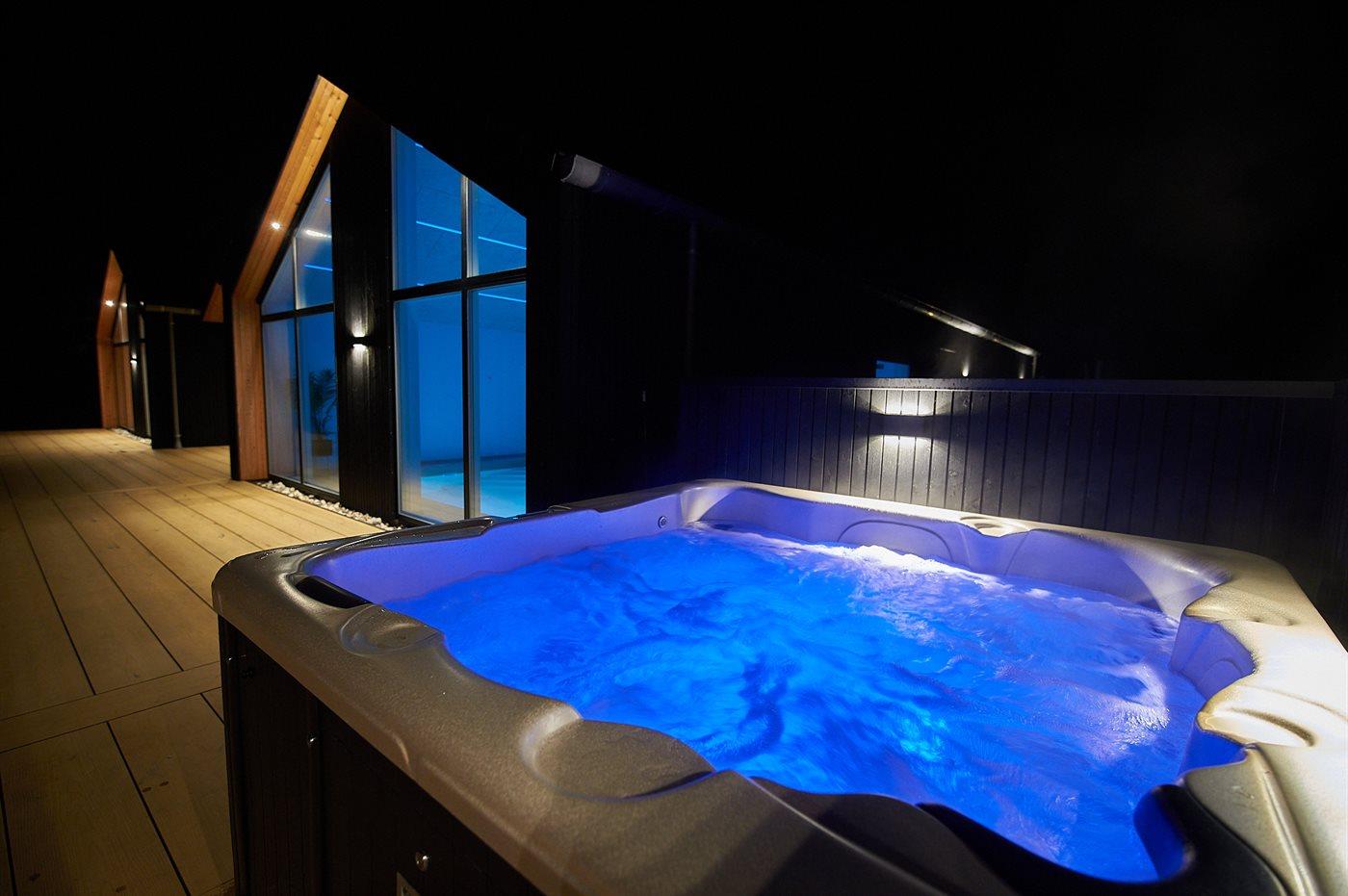 Der er mulighed for afslapning i indendørs spa til 6 personer. Der er mulighed for afslapning i udendørs standvandsspa til 6 personer.