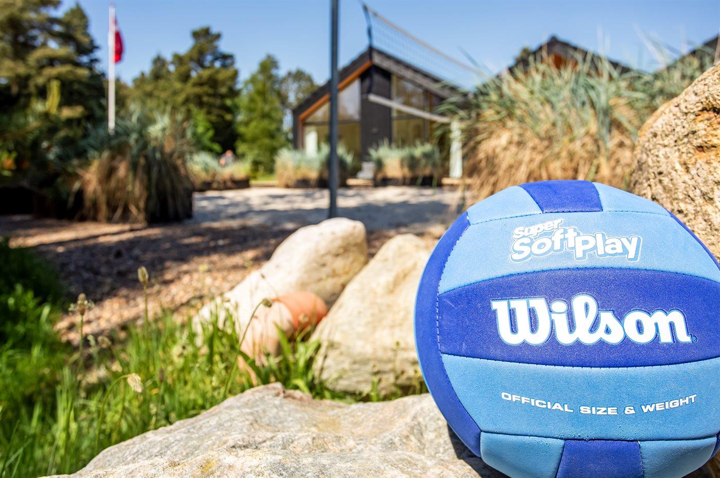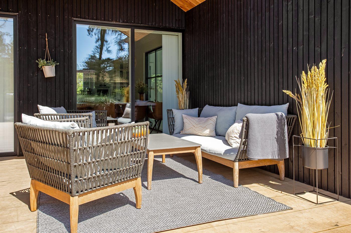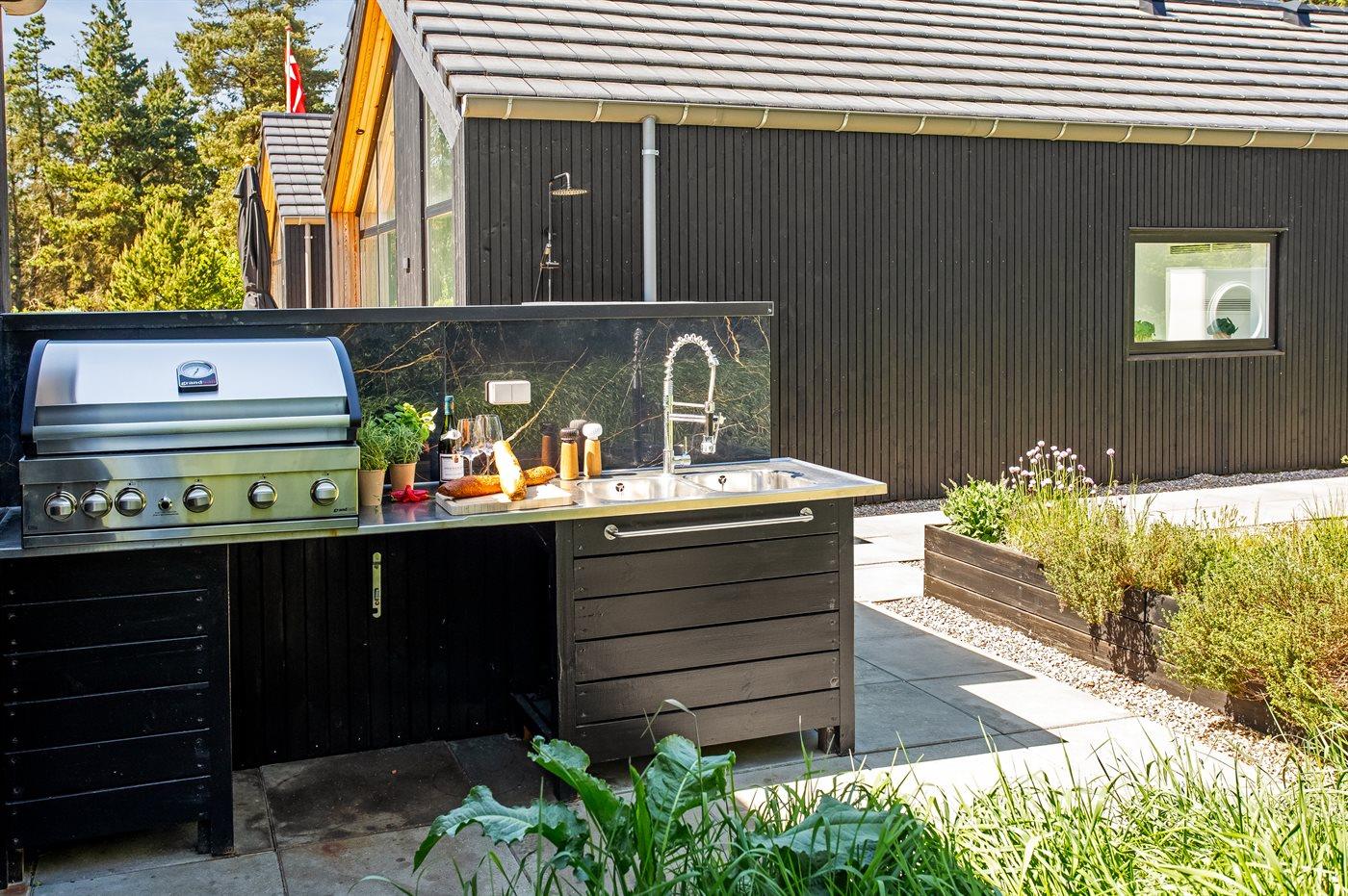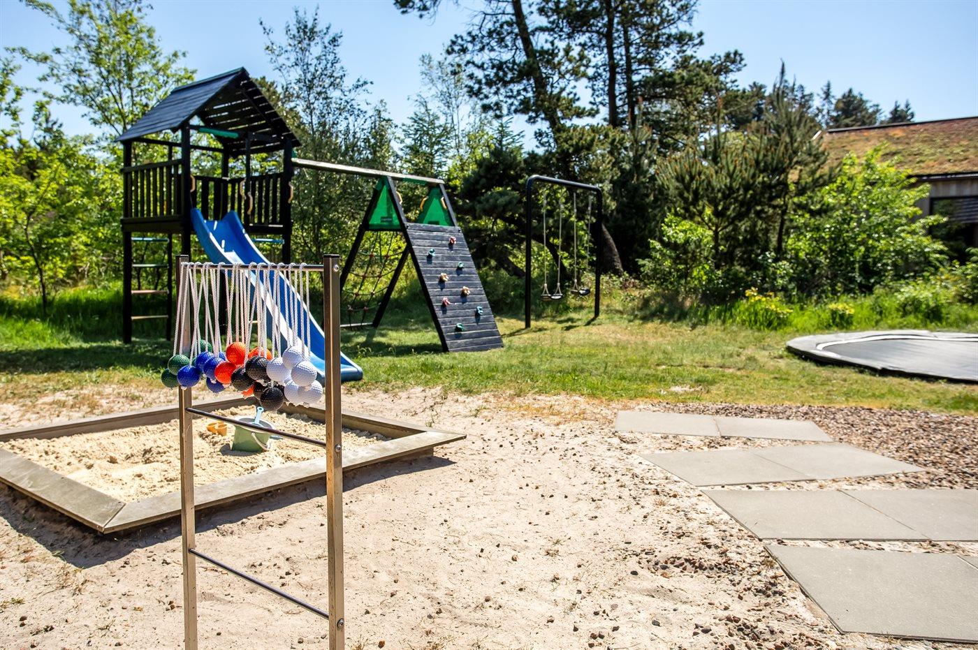 Ferieboligen er beliggende på en 2900 m² stor naturgrund. Der er 1400 m til havet. Nærmeste forretning er beliggende i en afstand af 1400 m. Til ferieboligen hører 200 m² terrasseareal. Desuden er der 54 m² overdækket terrasse. Gynge. Sandkasse. Trampolin. Legetårn. Rutchebane. Beachvolley. Badminton. Petanque. Bålsted. På lune aftener sørger en udendørs pejs for hyggelig stemning. Desuden 4 stk. 2000 W terrassevarmere til rådighed. Der er mulighed for at tilberede maden udendørs i udekøkkenet (i perioden november til og med februar er der lukket for vandet). Der er 2 grill til rådighed. (Gas). Der er installeret stik til opladning af elbil. Parkering ved ferieboligen.