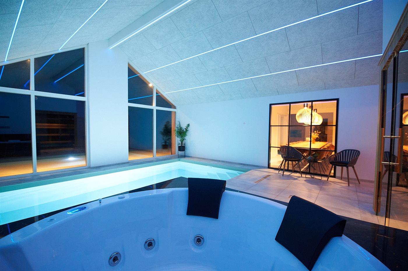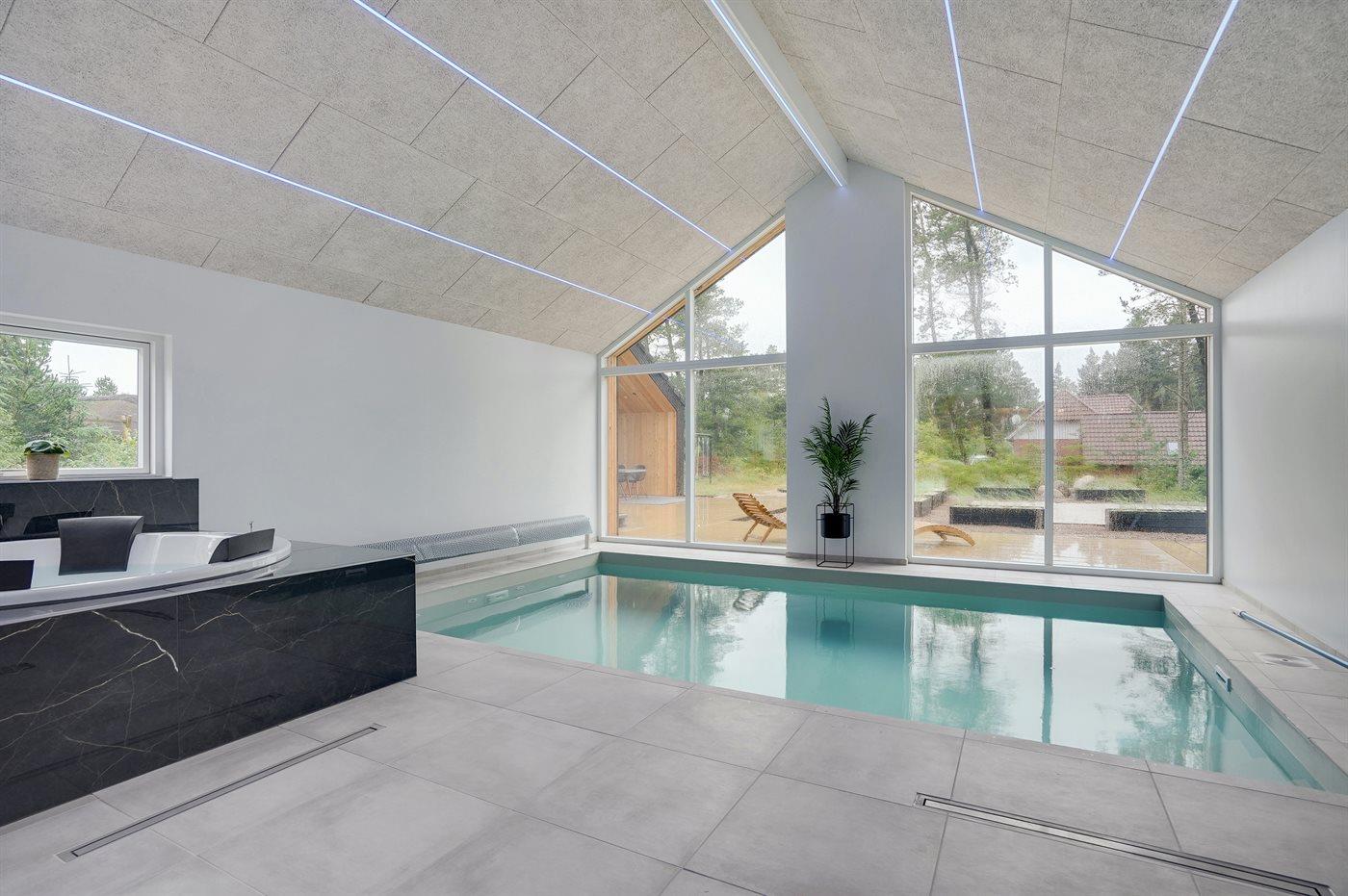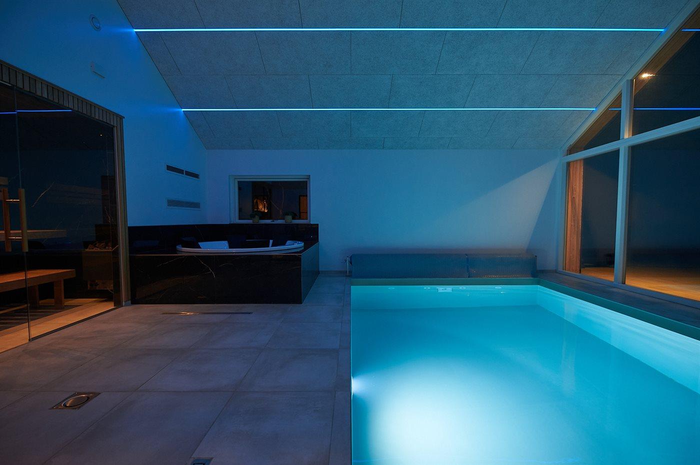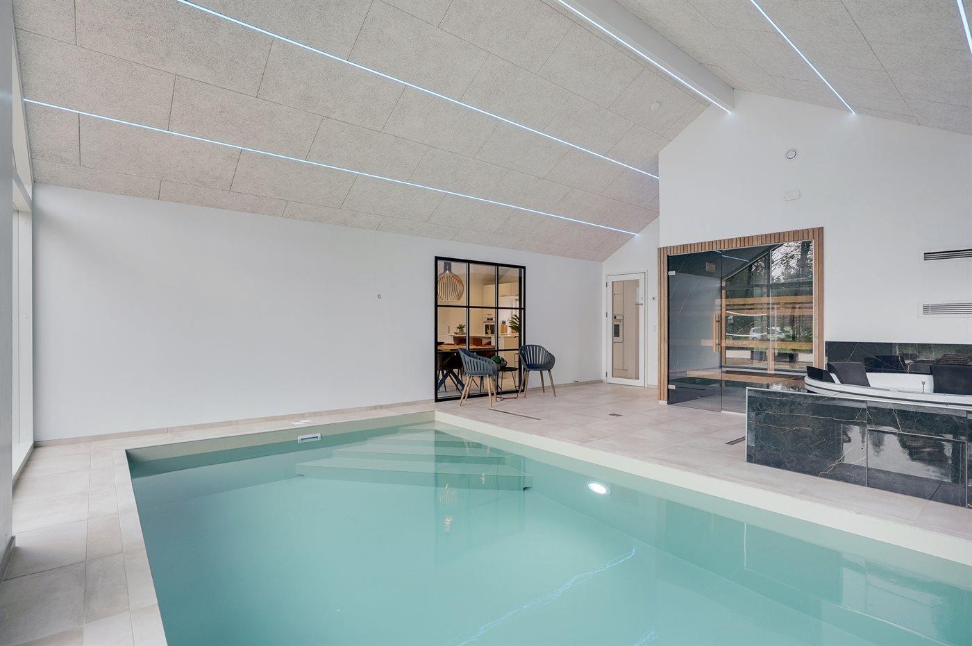 I den indendørs swimmingpool er der mulighed for leg og hyggeligt samvær. Swimmingpoolen måler op til 3,5 m i bredden, 5,5 m i længden og den er op til 1,45 m dyb. Vandet er mellem 24 og 28° C varmt. Swimmingpoolen har modstrømsanlæg. Der er gulvvarme i swimmingpoolområdet.