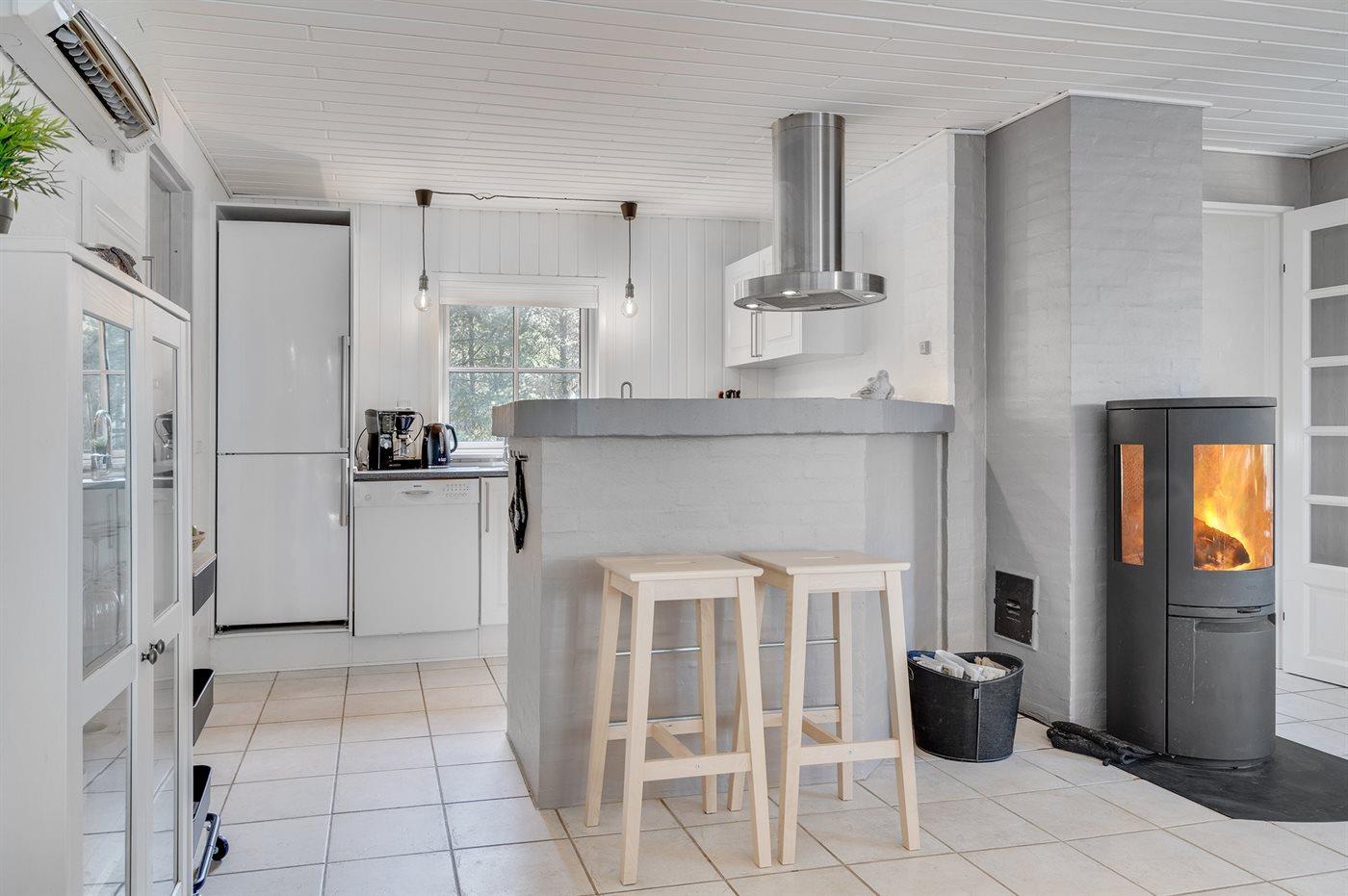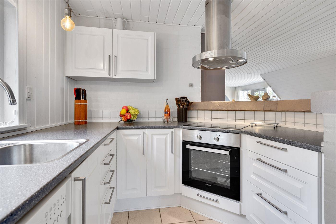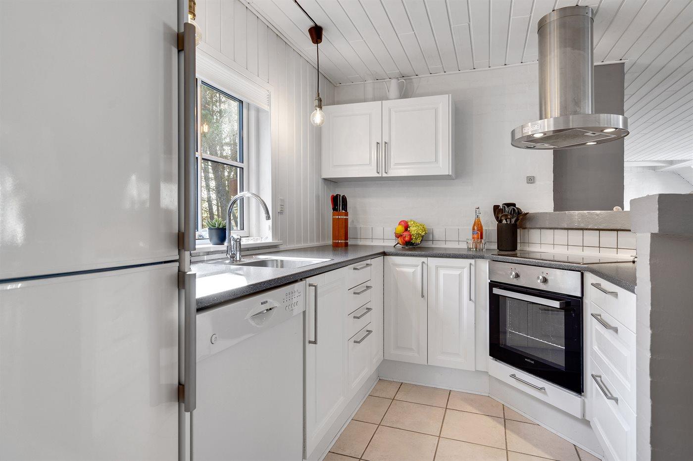Køkkenet er udstyret med 1 køleskab. Der er 4 keramiske kogeplader, varmluftovn, mikrobølgeovn samt opvaskemaskine.