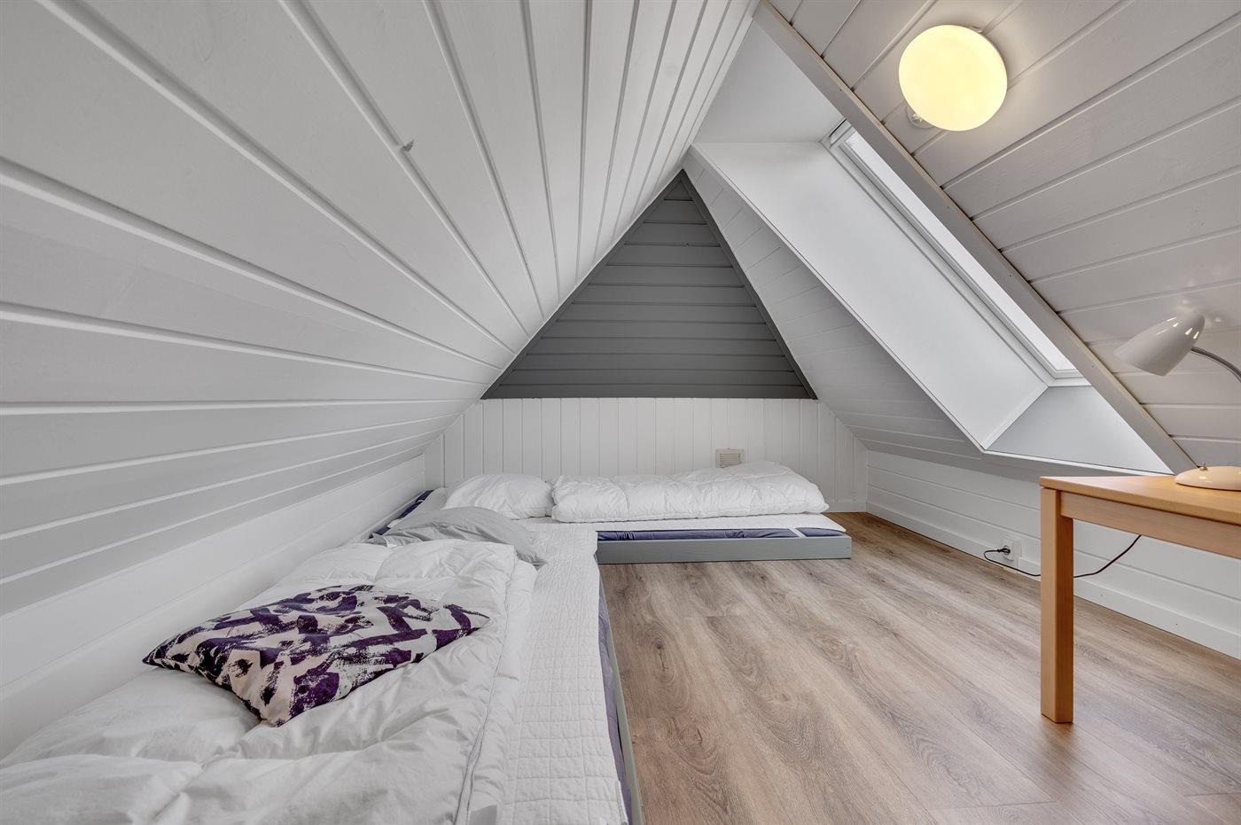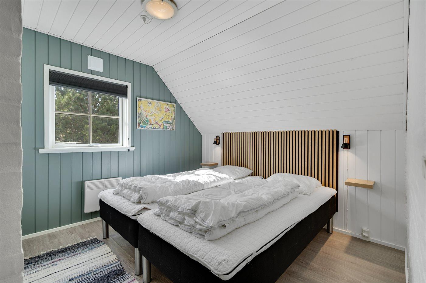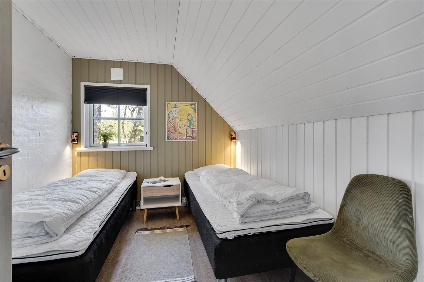 Der er i alt 4 soveværelser. Sovepladserne fordeler sig på: 6 sovepladser i dobbeltsenge. 2 sovepladser i enkeltsenge. 2 sovepladser på madrasser. 2 af disse sovepladser befinder sig på husets hems. Derudover er der 1 stk. barneseng.