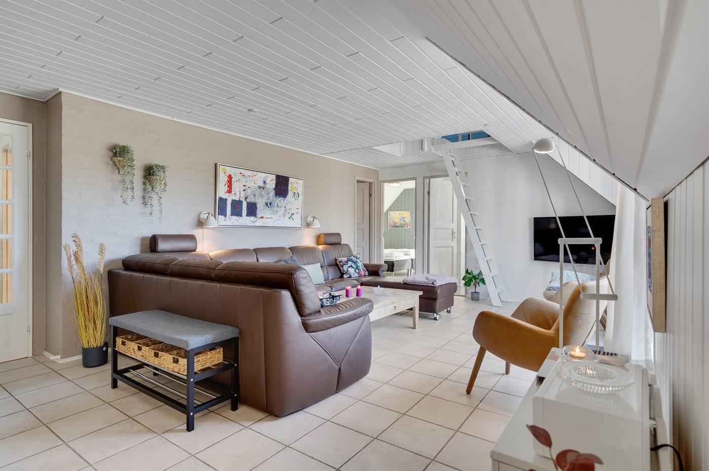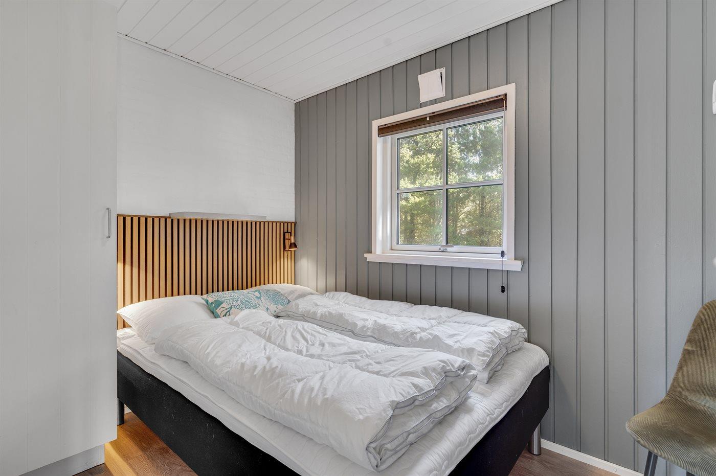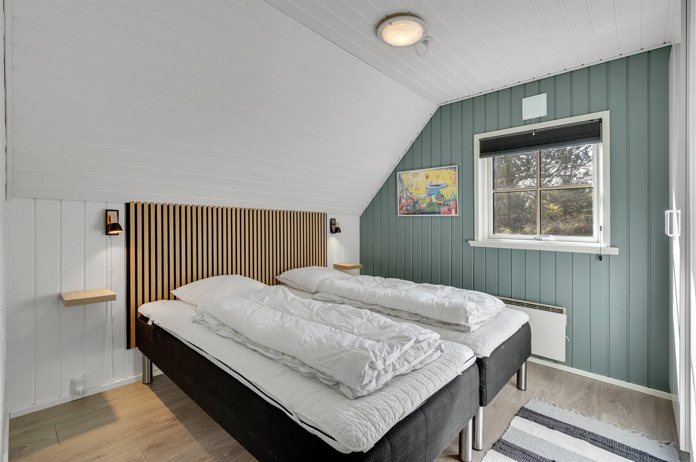 Der er i alt 4 soveværelser. Sovepladserne fordeler sig på: 6 sovepladser i dobbeltsenge. 2 sovepladser i enkeltsenge. 2 sovepladser på madrasser. 2 af disse sovepladser befinder sig på husets hems. Derudover er der 1 stk. barneseng.