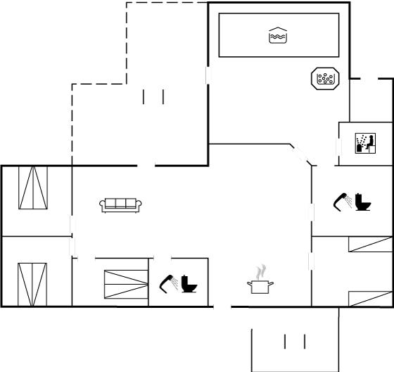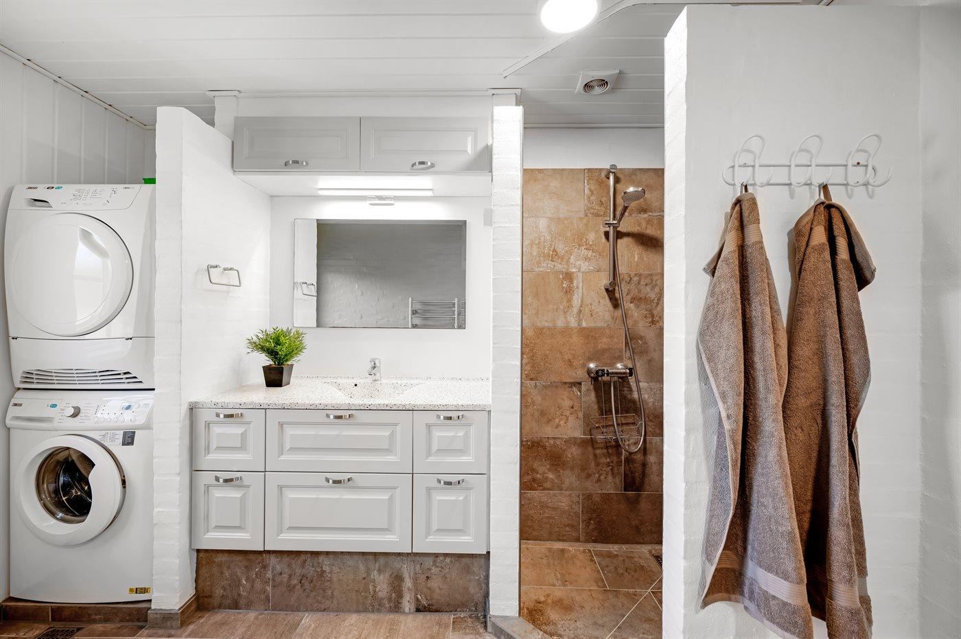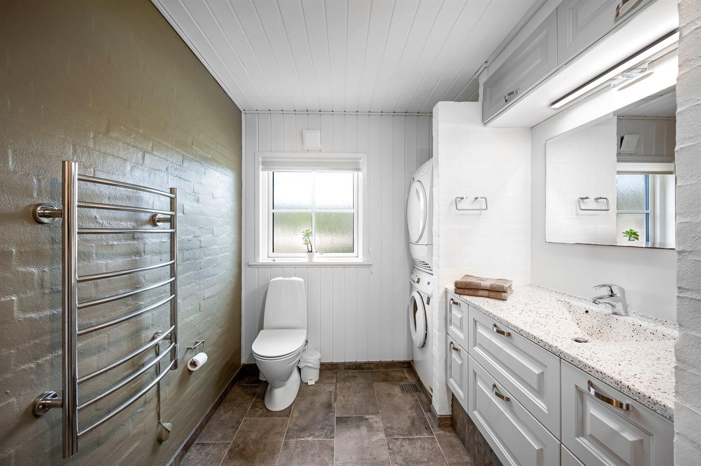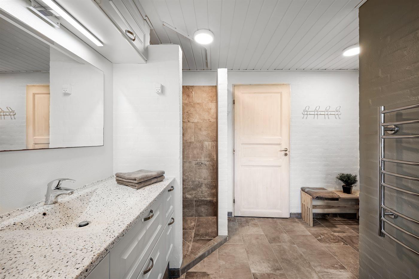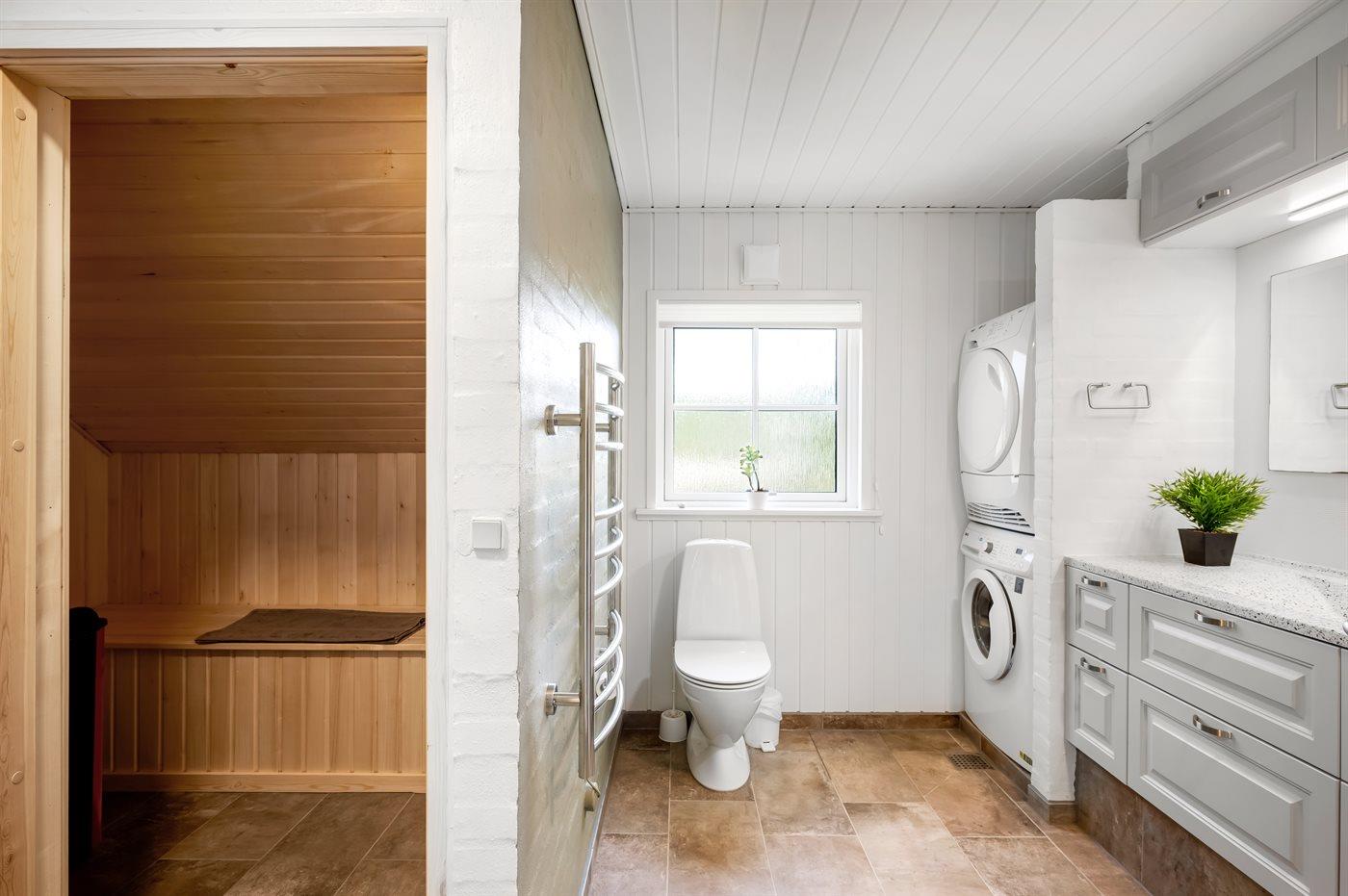 Der er 2 badeværelser med bruseniche og 2 toiletter. Der er gulvvarme på 2 badeværelser. I saunaen er der mulighed for afslapning.