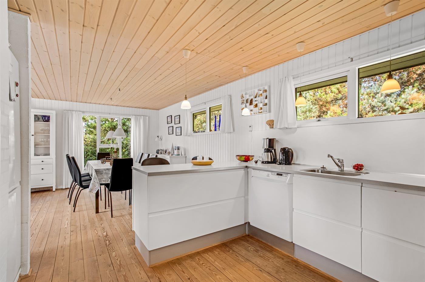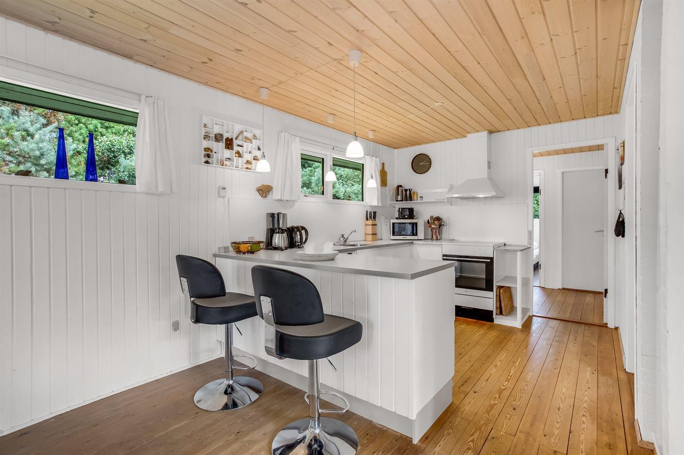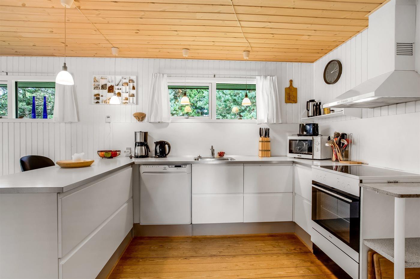 Køkkenet er udstyret med 1 køleskab. Der er 4 keramiske kogeplader, varmluftovn, mikrobølgeovn samt opvaskemaskine.