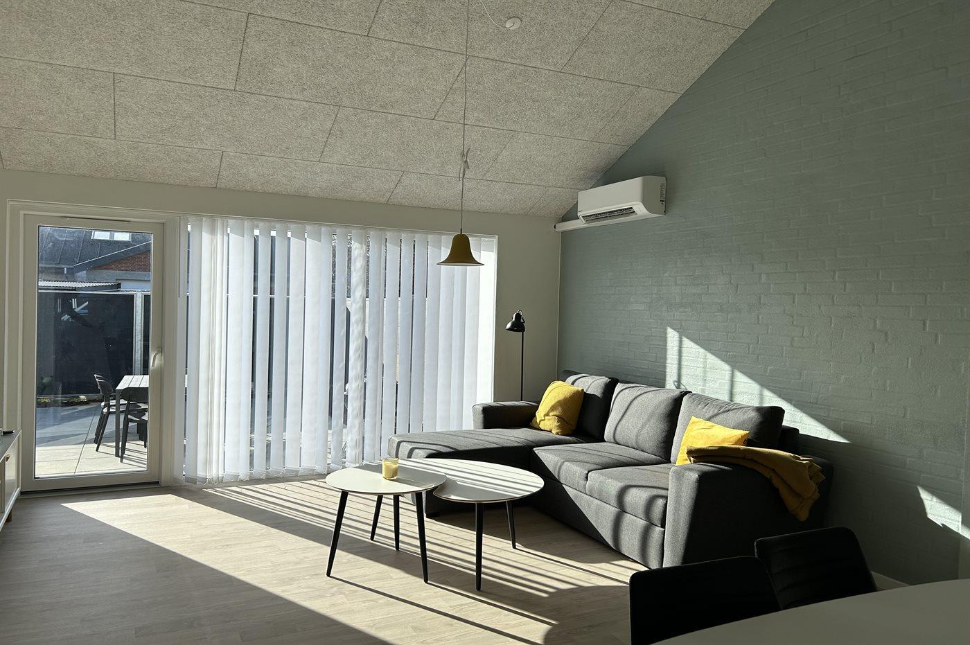 Moderne ferielejlighed i Blåvand med terrasse, varmepumpe og tæt på butik og legeplads.