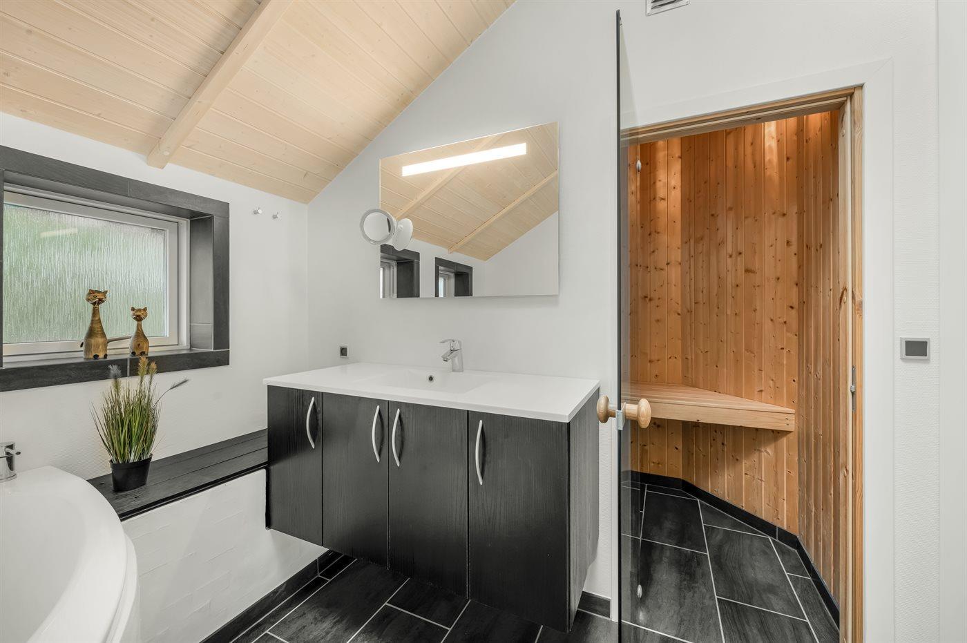 Der er 2 badeværelser med bruseniche og 2 toiletter. Der er gulvvarme på 2 badeværelser. I saunaen er der mulighed for afslapning.