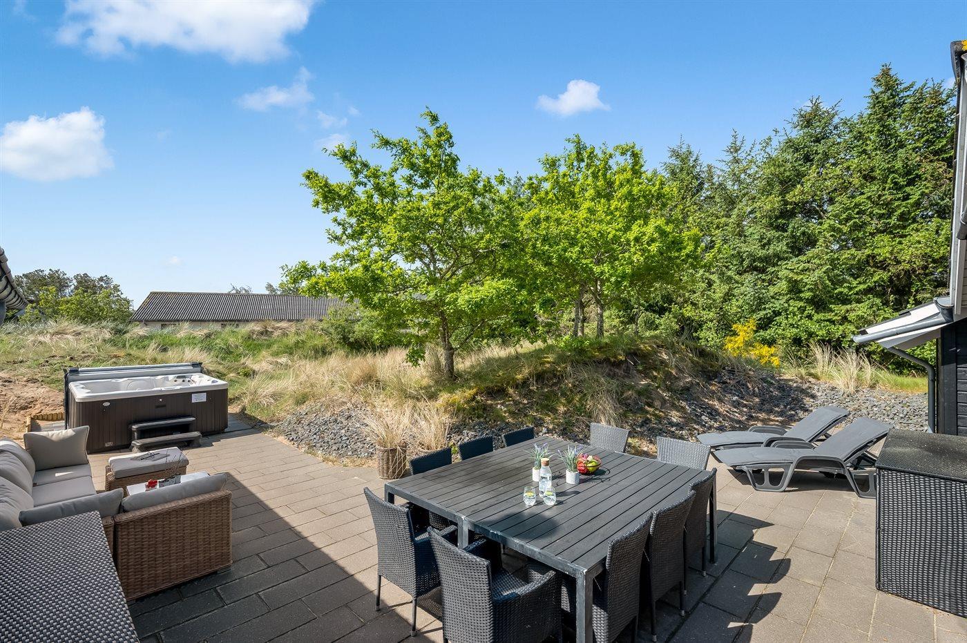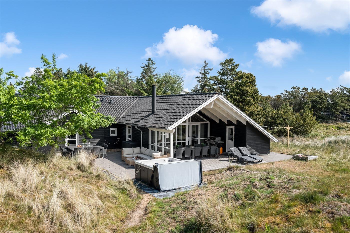 Velholdt sommerhus i Blåvand med aktivitetsrum, spa og elbil-ladestander tæt på strand og by.