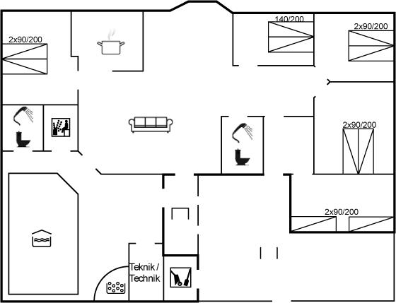Der er i alt 5 soveværelser. Sovepladserne fordeler sig på: 8 sovepladser i dobbeltsenge. 2 sovepladser i enkeltsenge. Derudover er der 1 stk. barneseng.