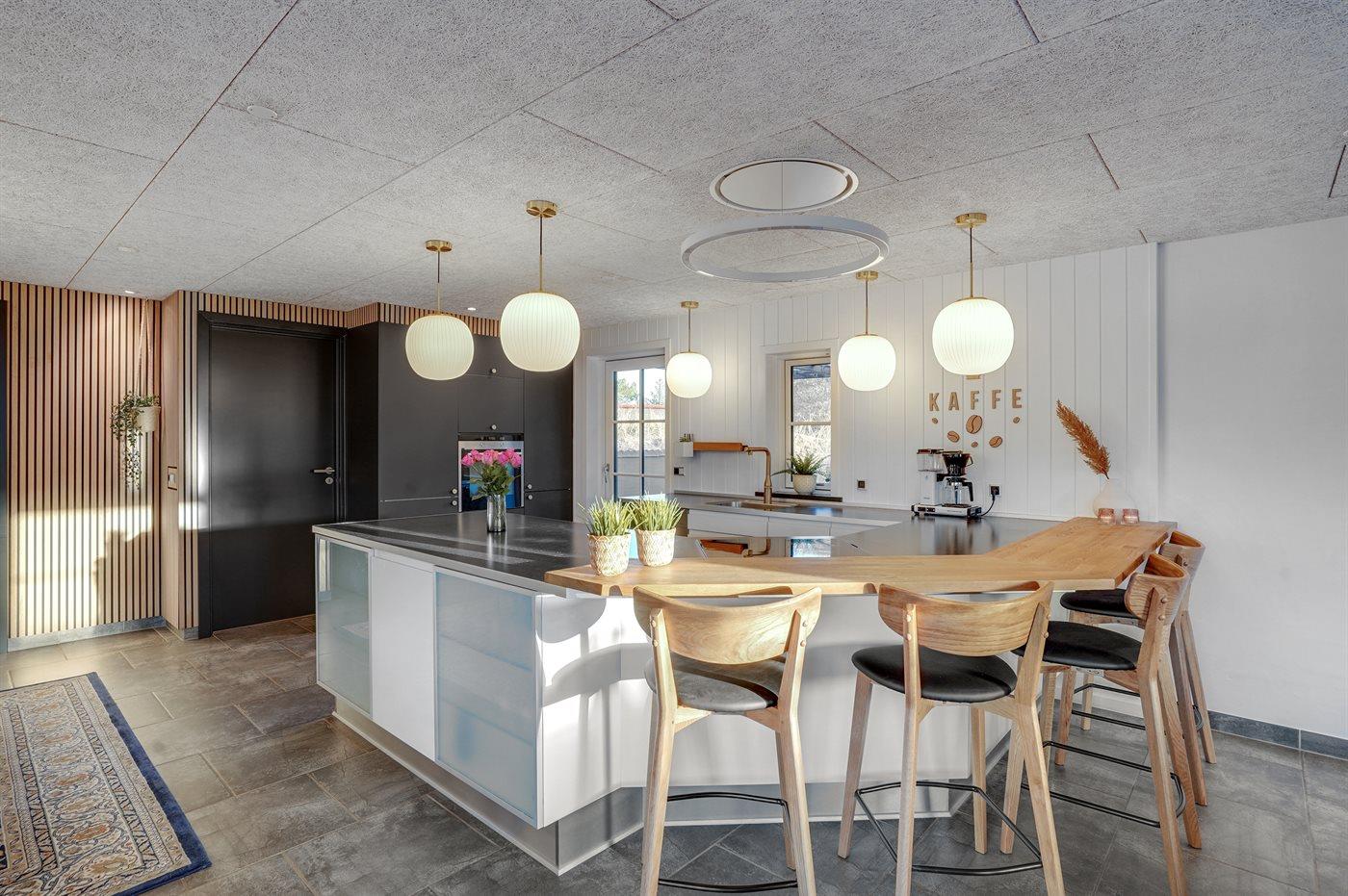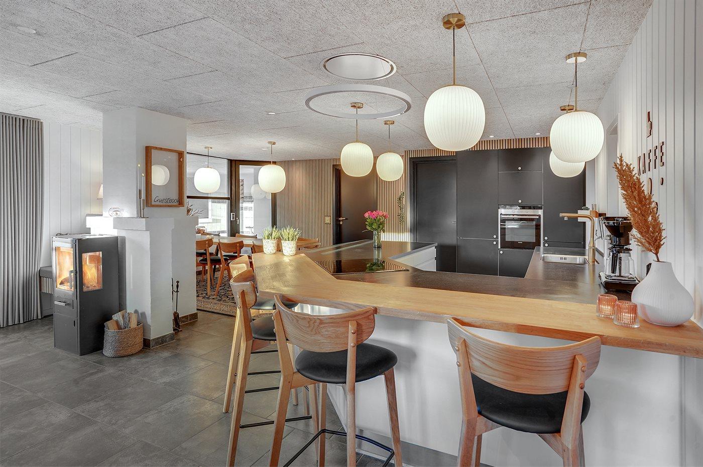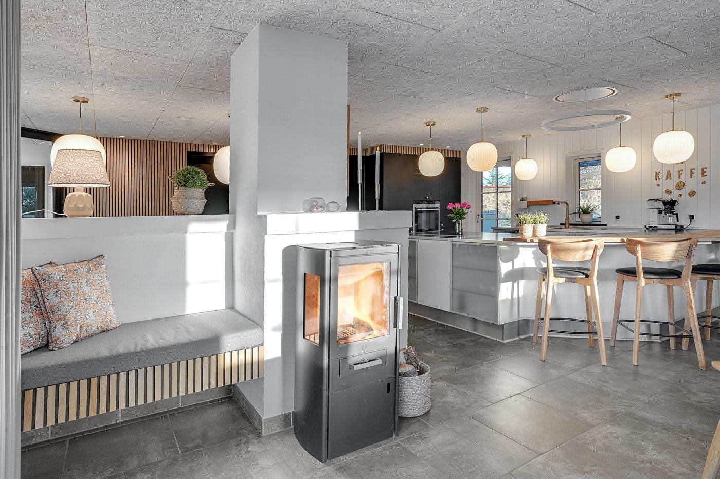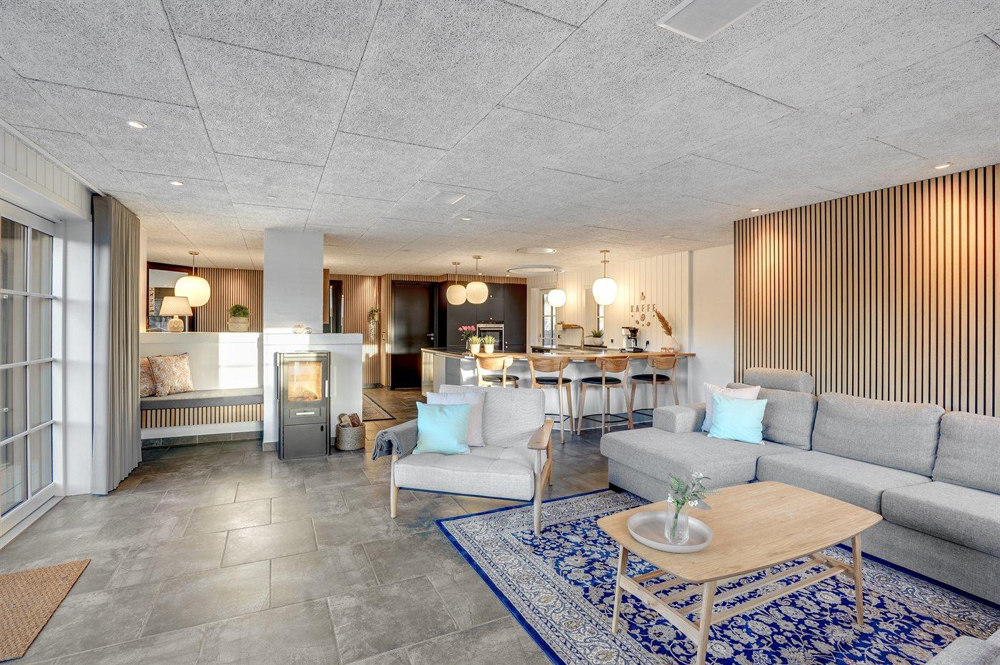 Husets midtpunkt er det åbne køkken, som ligger i forbindelse med en smuk opholdsstue, hvor der er plads til at være sammen med familie og venner.