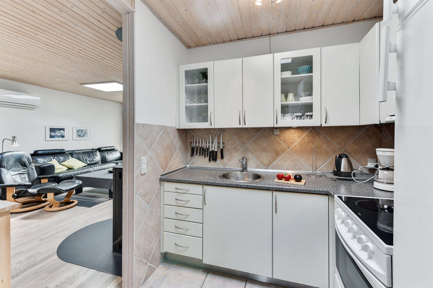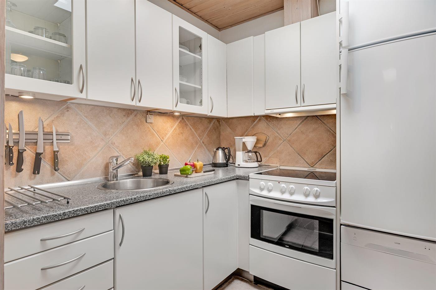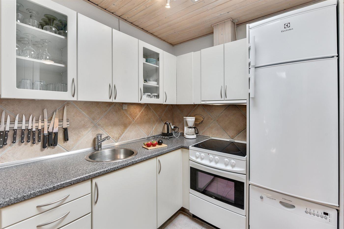 Køkkenet er udstyret med 1 køleskab. Der er 4 keramiske kogeplader, varmluftovn, mikrobølgeovn samt opvaskemaskine.