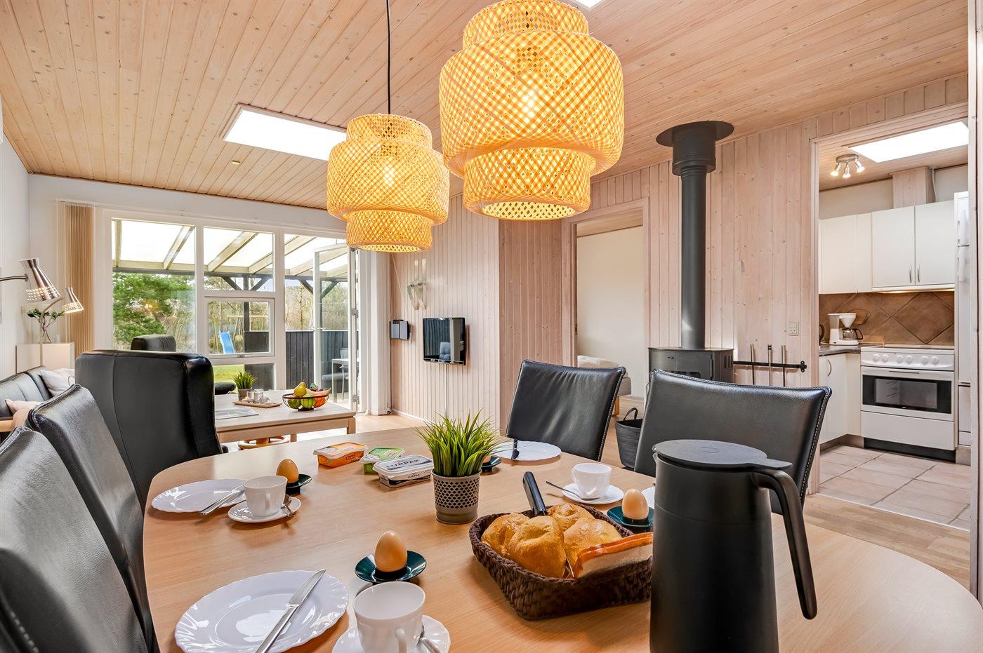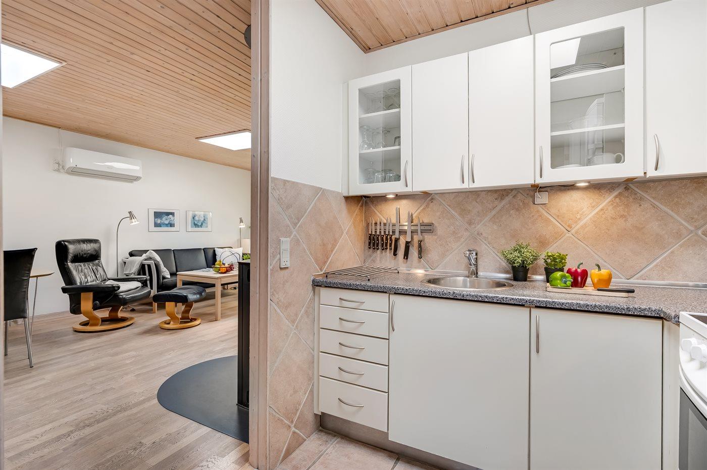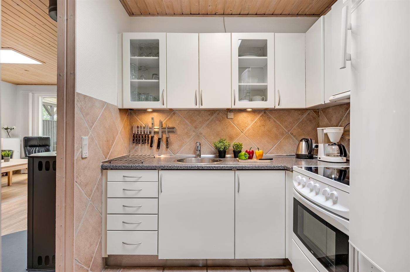 Køkkenet er udstyret med 1 køleskab. Der er 4 keramiske kogeplader, varmluftovn, mikrobølgeovn samt opvaskemaskine.