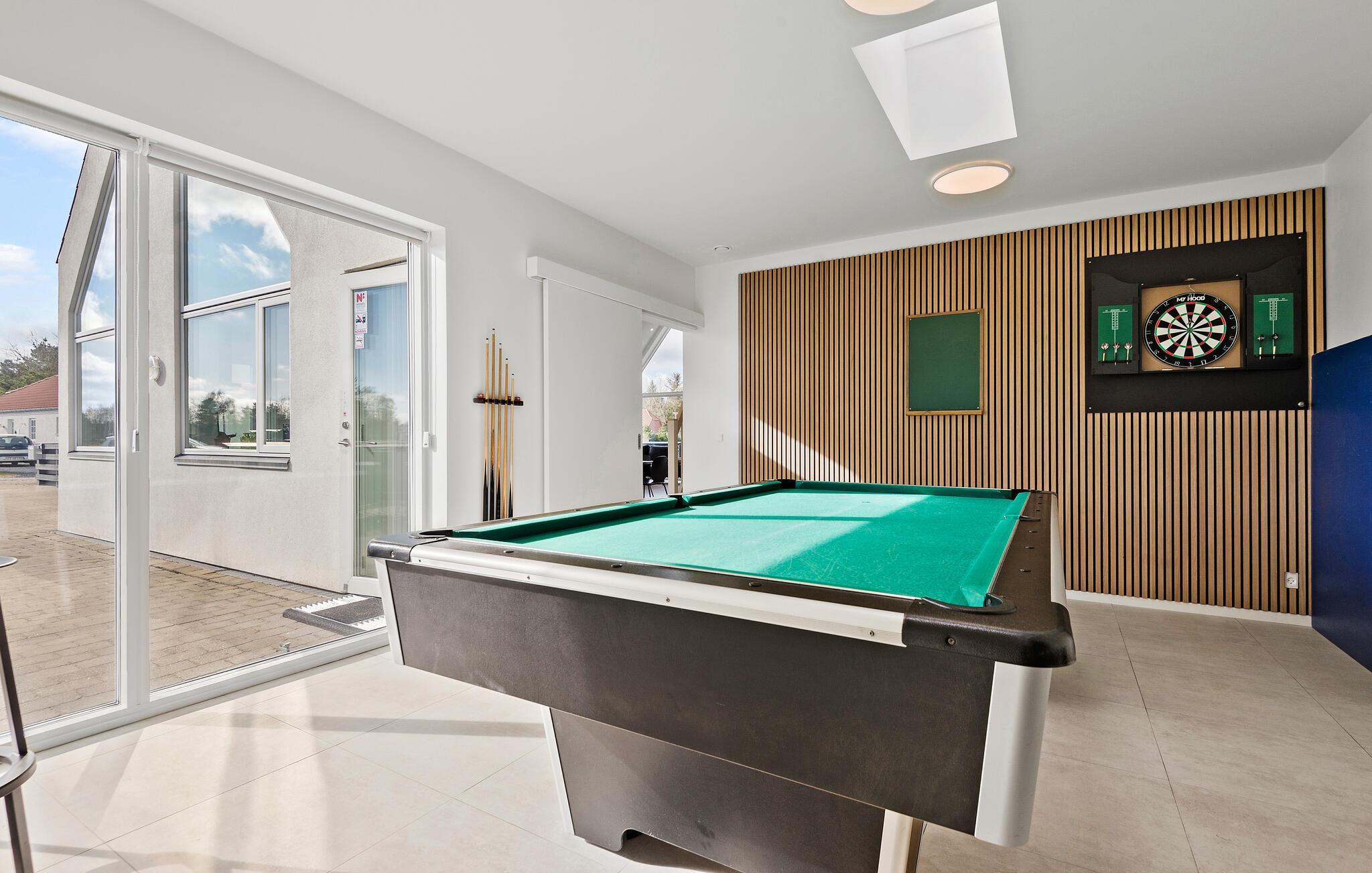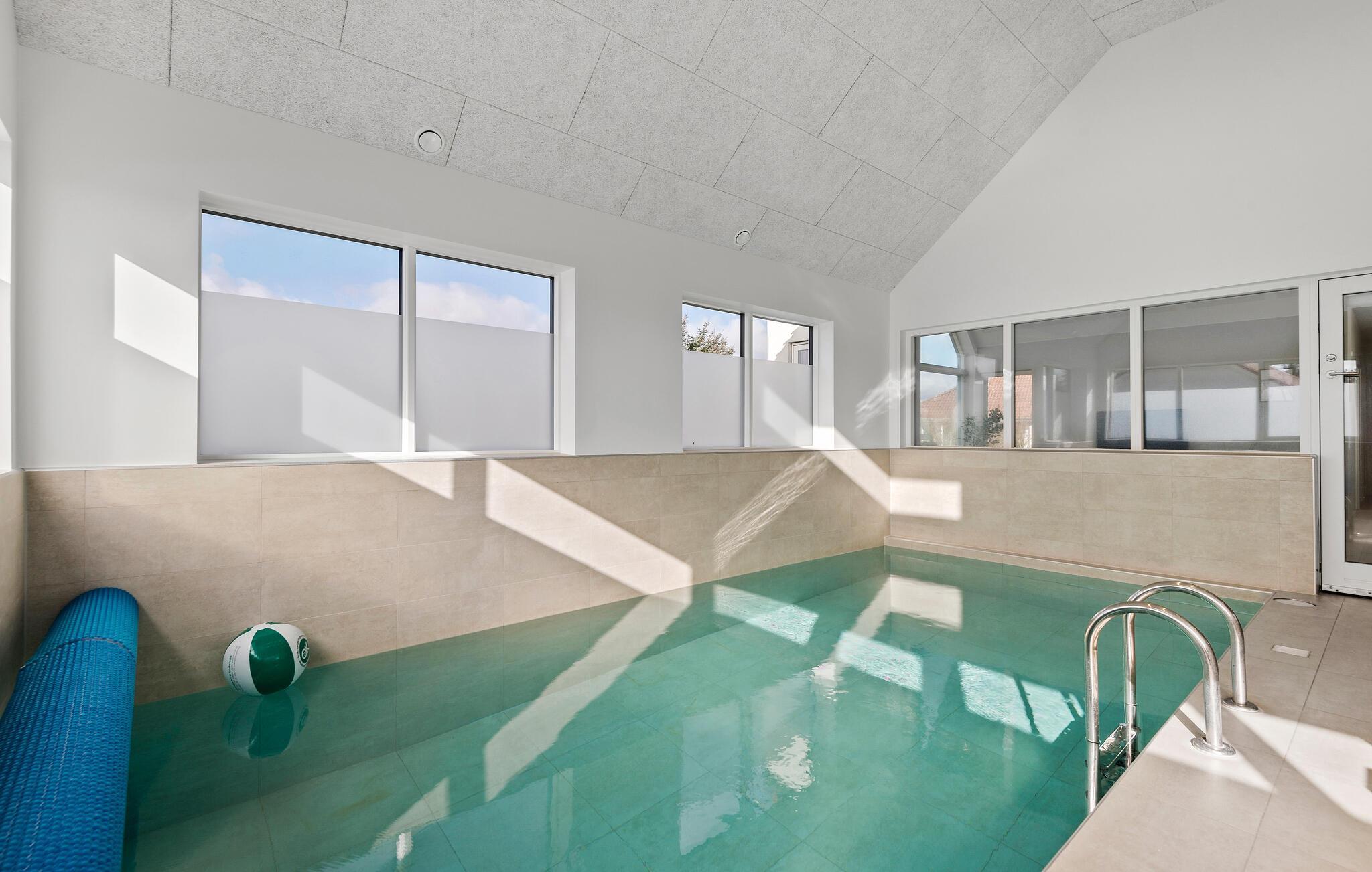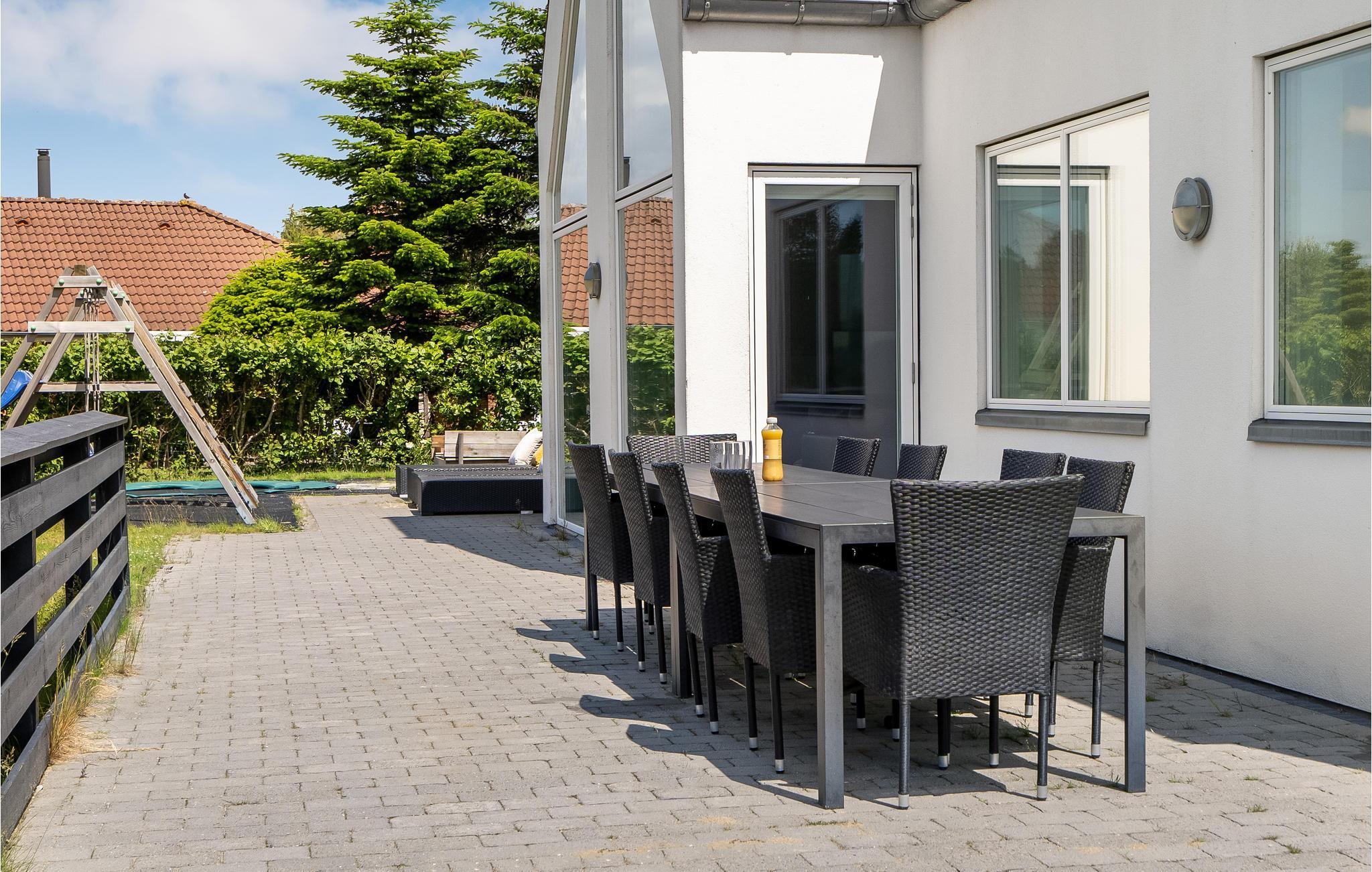 Hold en fantastisk ferie i dette pragtfulde og moderne feriehus på 210 m², med god plads til 16 personer. Huset ligger på en stor naturgrund med 230 m² terrasse og med gynger og trampolin. Huset er indrettet i en flot og moderne stil, med masser af lysindfald. Indbydende køkken med loft til kip i åben forbindelse med den smagfulde stue og spisestue samt kig til det lækre wellnessrum med en dejlig swimmingpool og sauna samt det store varmtvandsbassin, hvor der nemt kan sidde op til ti personer. Der er tre gode badeværelser, alle med toilet og brusebad. Huset råder også over et fint aktivitetsrum med pool- og billardbord og bordtennisbord, her er masser af muligheder for sjove aktiviteter og leg, både inden- og udendørs. Ikke langt fra huset ligger en golfbane, bowlingbane og en af Danmarks skønneste sandstrande, ved det fredede naturområde Skallingen.