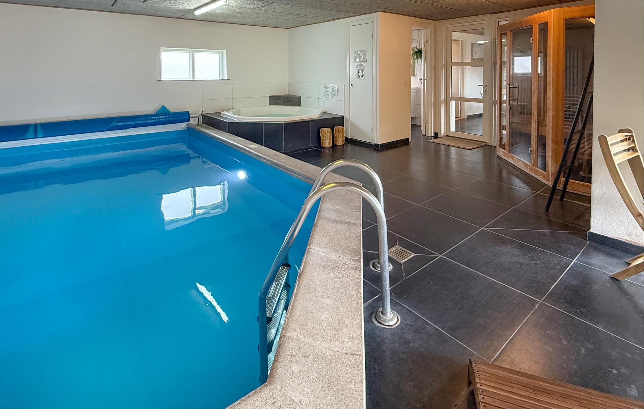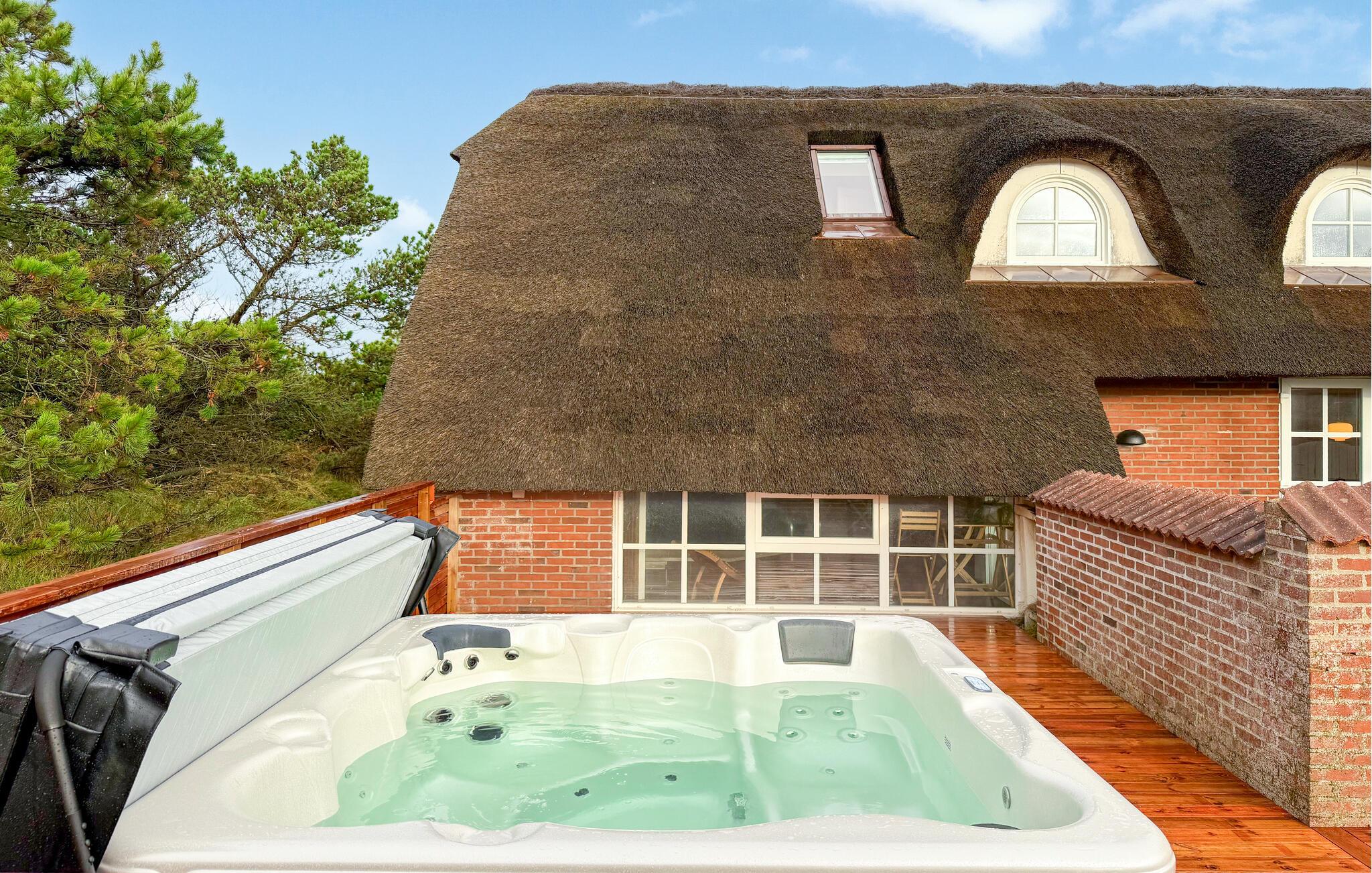 Stråtækt feriehus i Blåvand med havudsigt, pool, spa og aktivitetsrum nær strand og by.