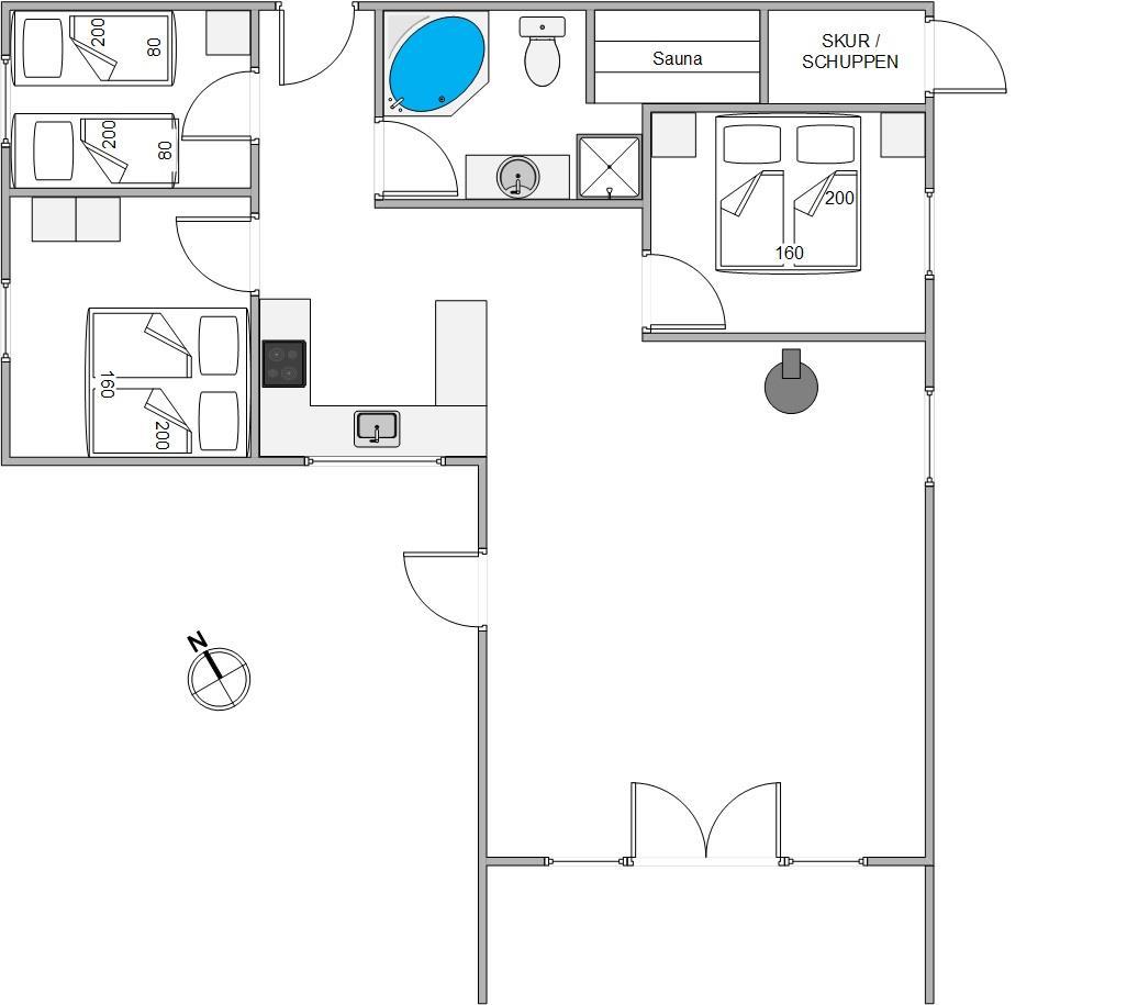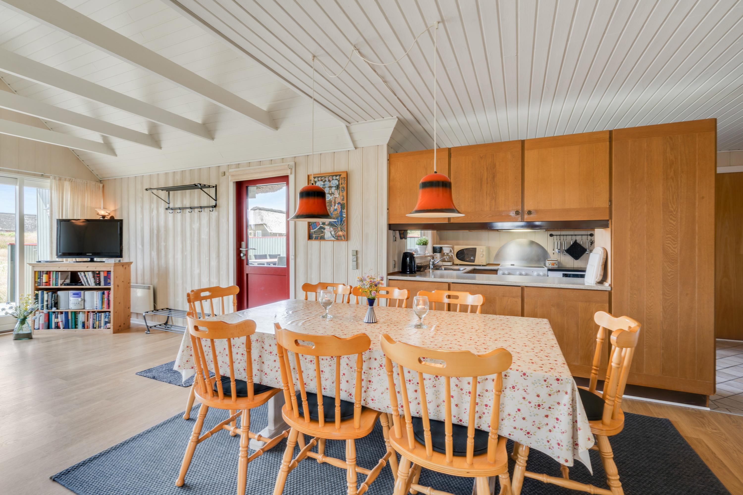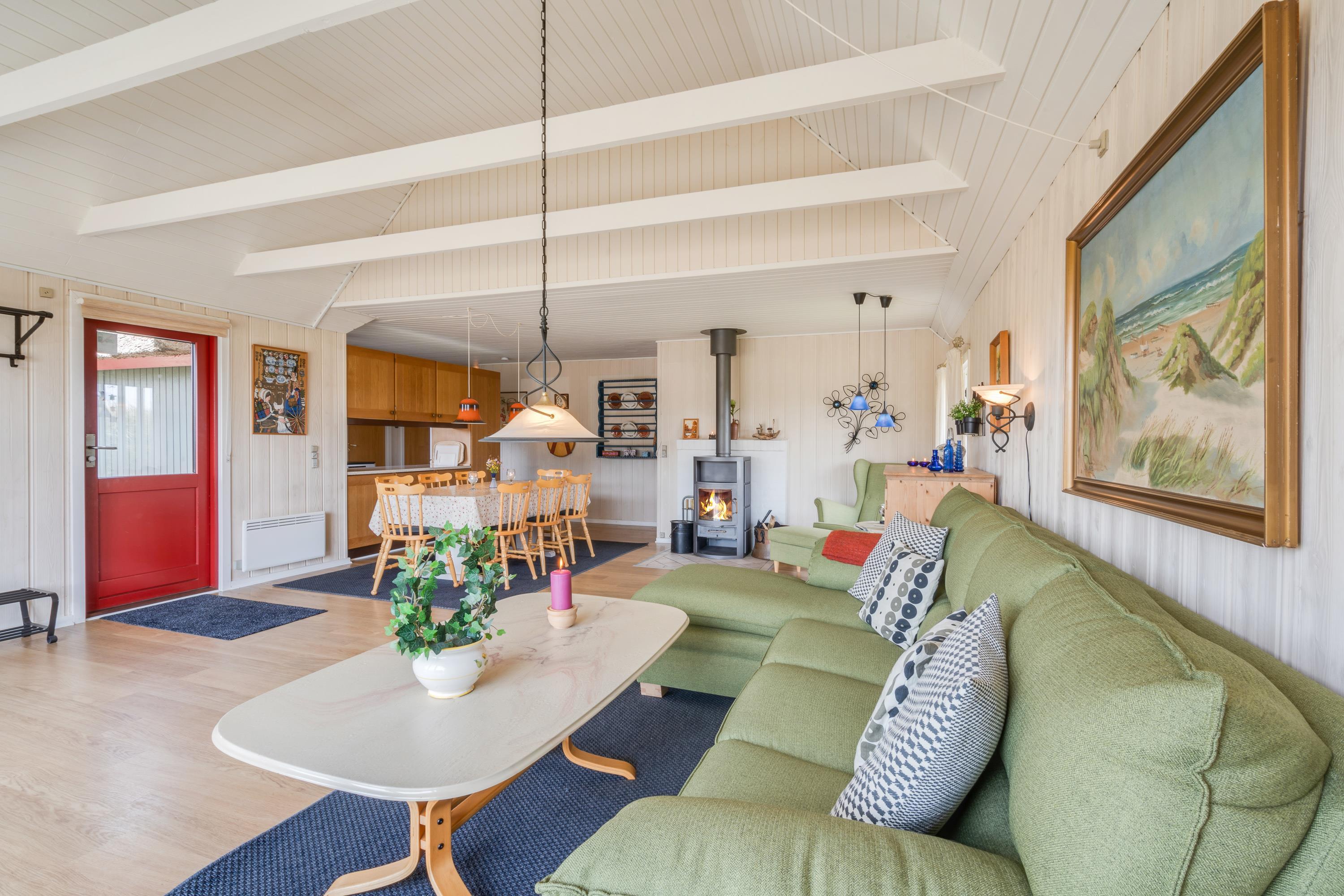 I sommerhuset er rammerne desuden sat for en hyggelig ferie i familiens tegn. Her kommer I utvivlsomt til at tilbringe mange hyggelige feriestunder foran brændeovnen i alrummet, hvor køkken, stue og spisestue er i åben forbindelse.