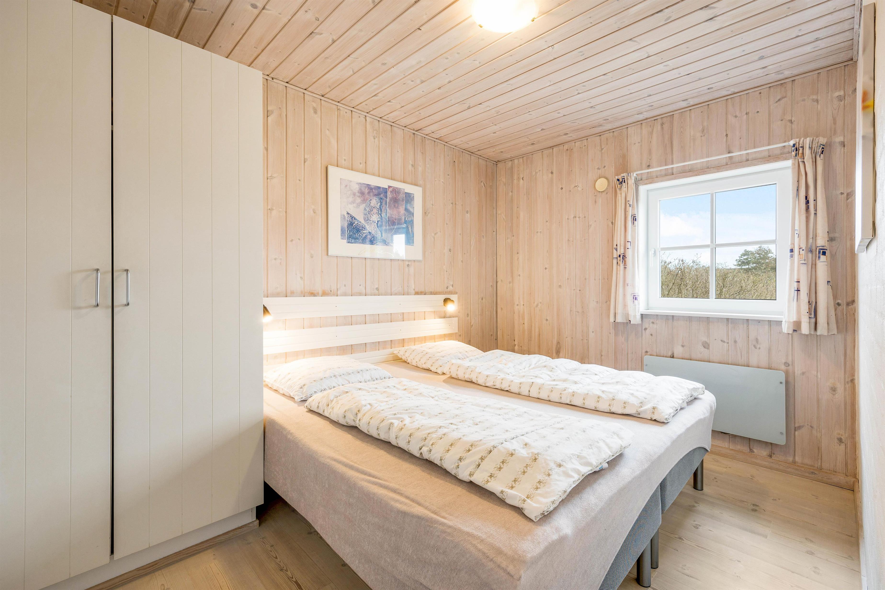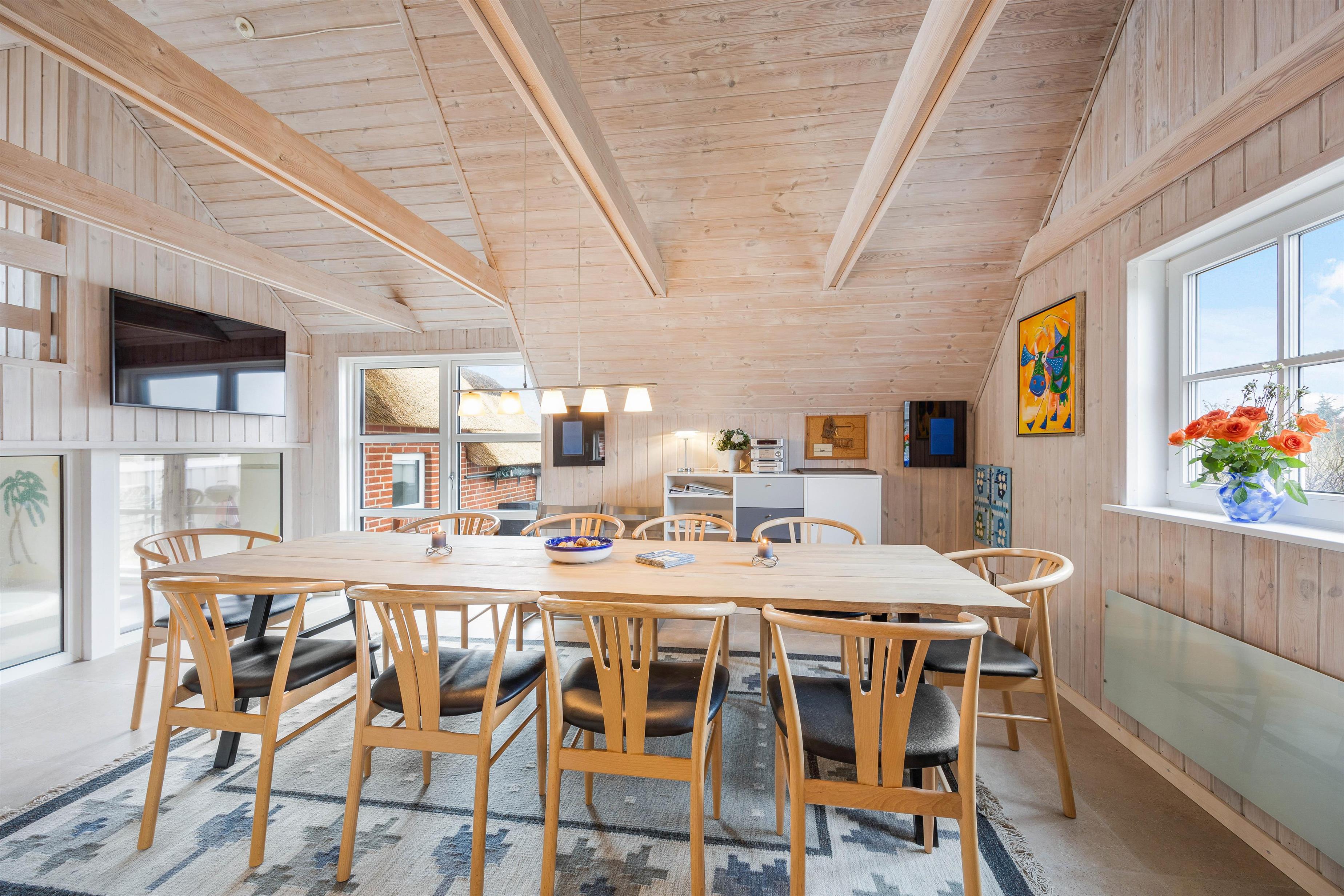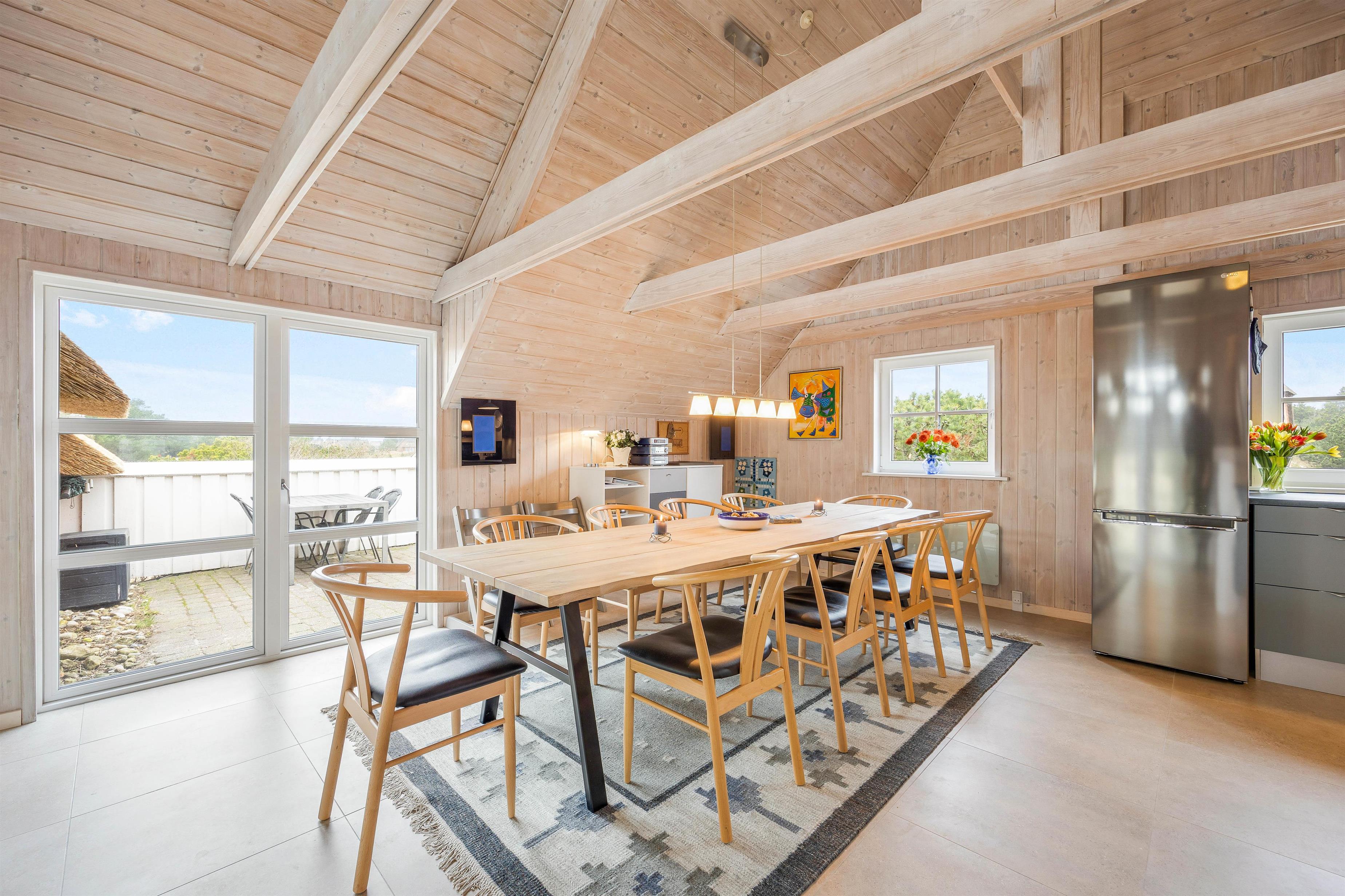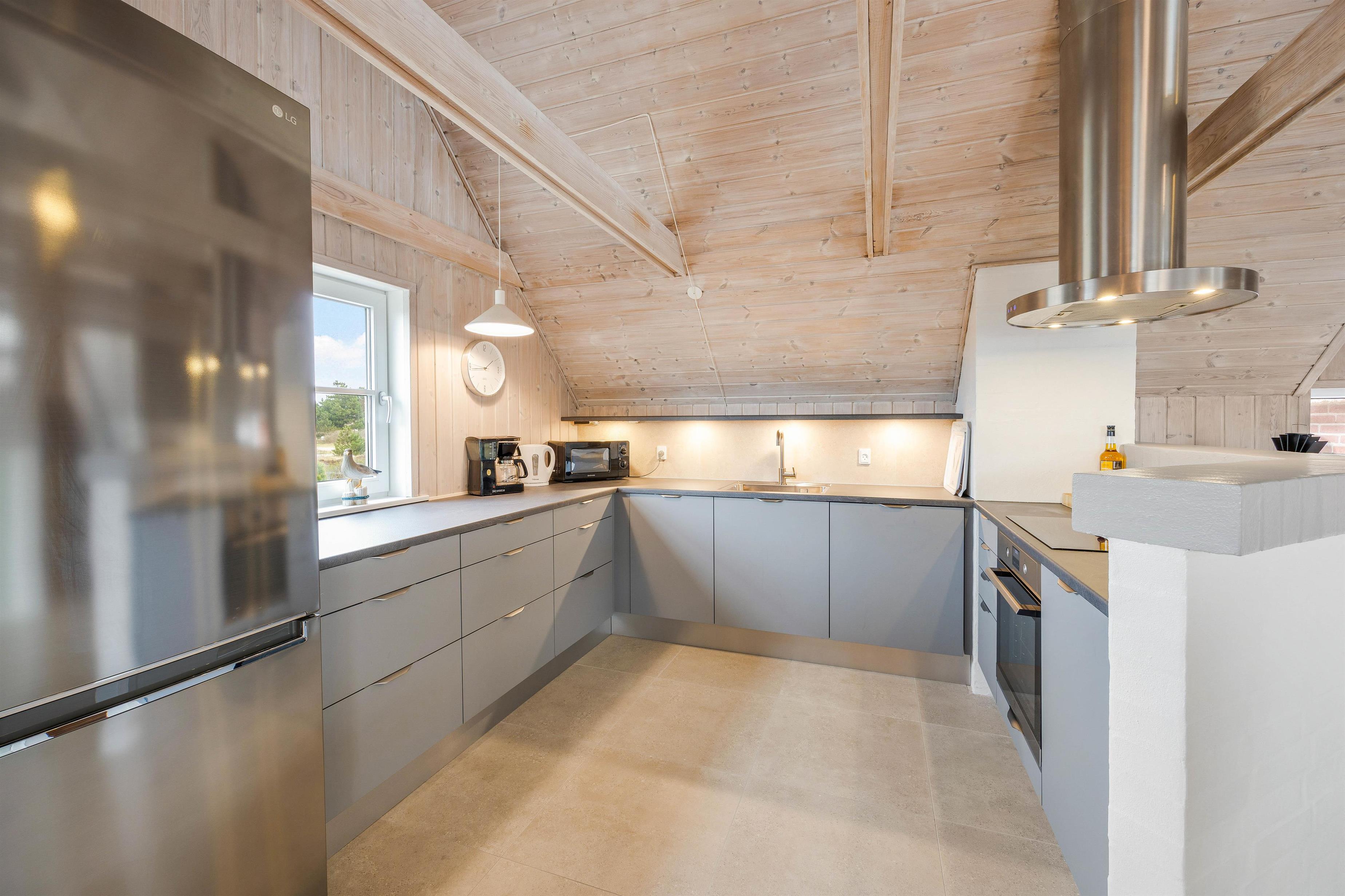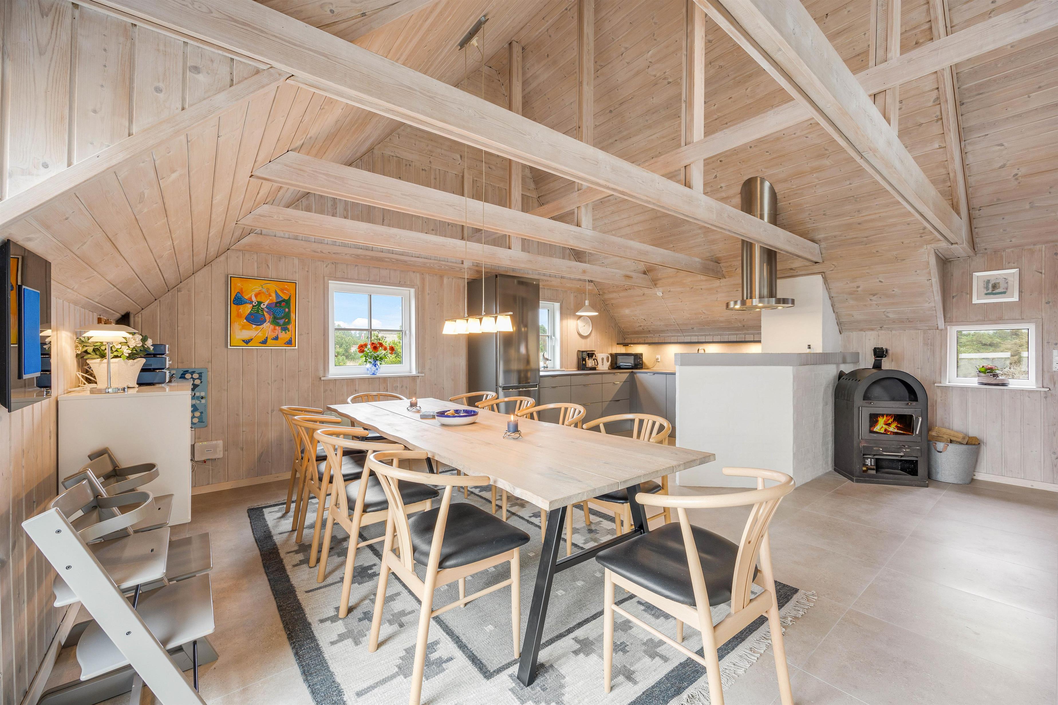 Det i 2023 renoverede feriehus er udført i 2 plan, med en lys og let indretning. Samlingspunktet i feriehuset er det rummelige alrum med kig til pool rummet, der ligger et niveau lavere. Alrummet indeholder spiseplads samt et stilfuldt køkken med opvaskemaskine og induktionskomfur. Her kan I hygge jer sammen omkring madlavning eller et brætspil ved spisebordet, imens familiens vandhunde hygger sig i poolen. I alrummet befinder husets brændeovn sig, som sørger for en hyggelig stemning. Derudover er der gulvvarme i hele alrummet.