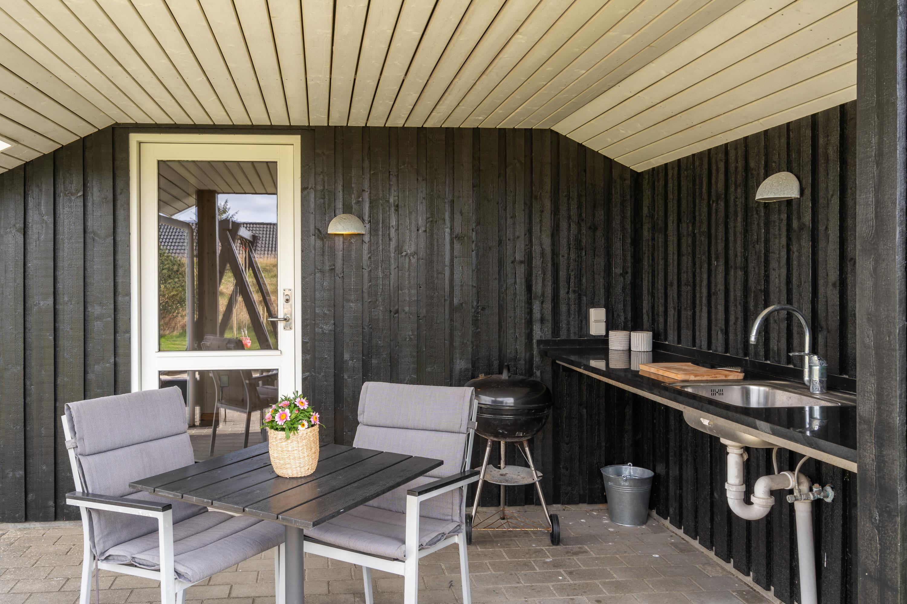 Sommerhuset har et dejligt overdækket udekøkken, hvor I både kan klargøre og grille aftensmaden.