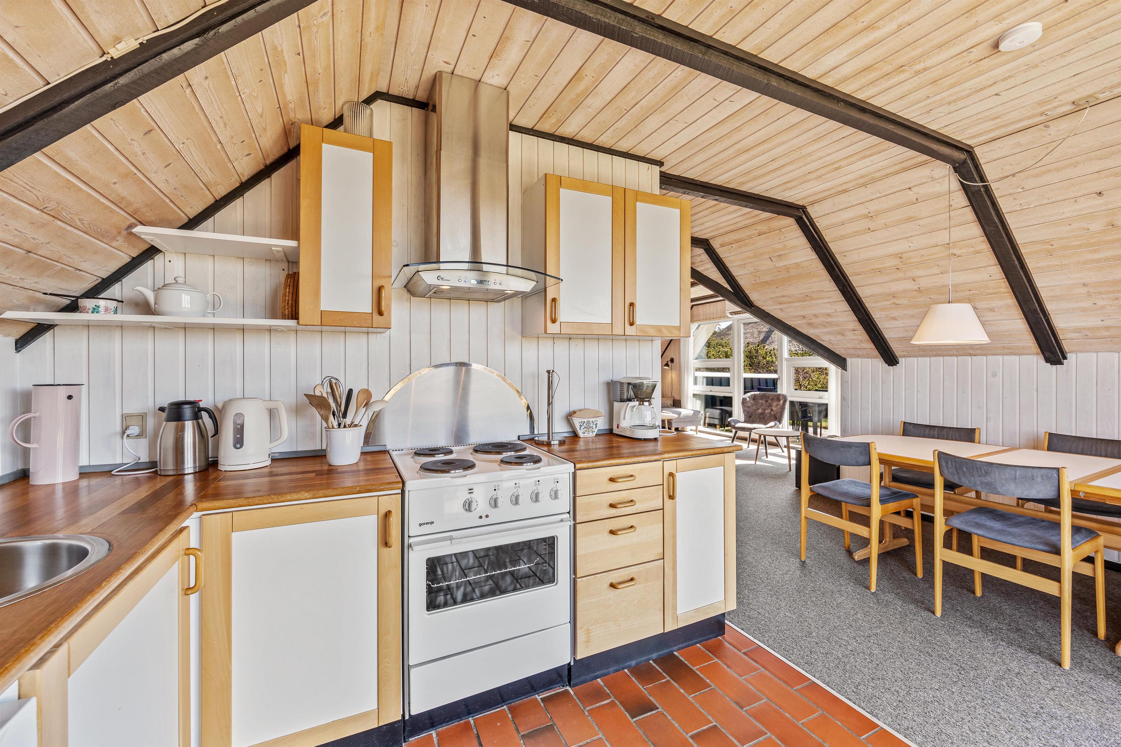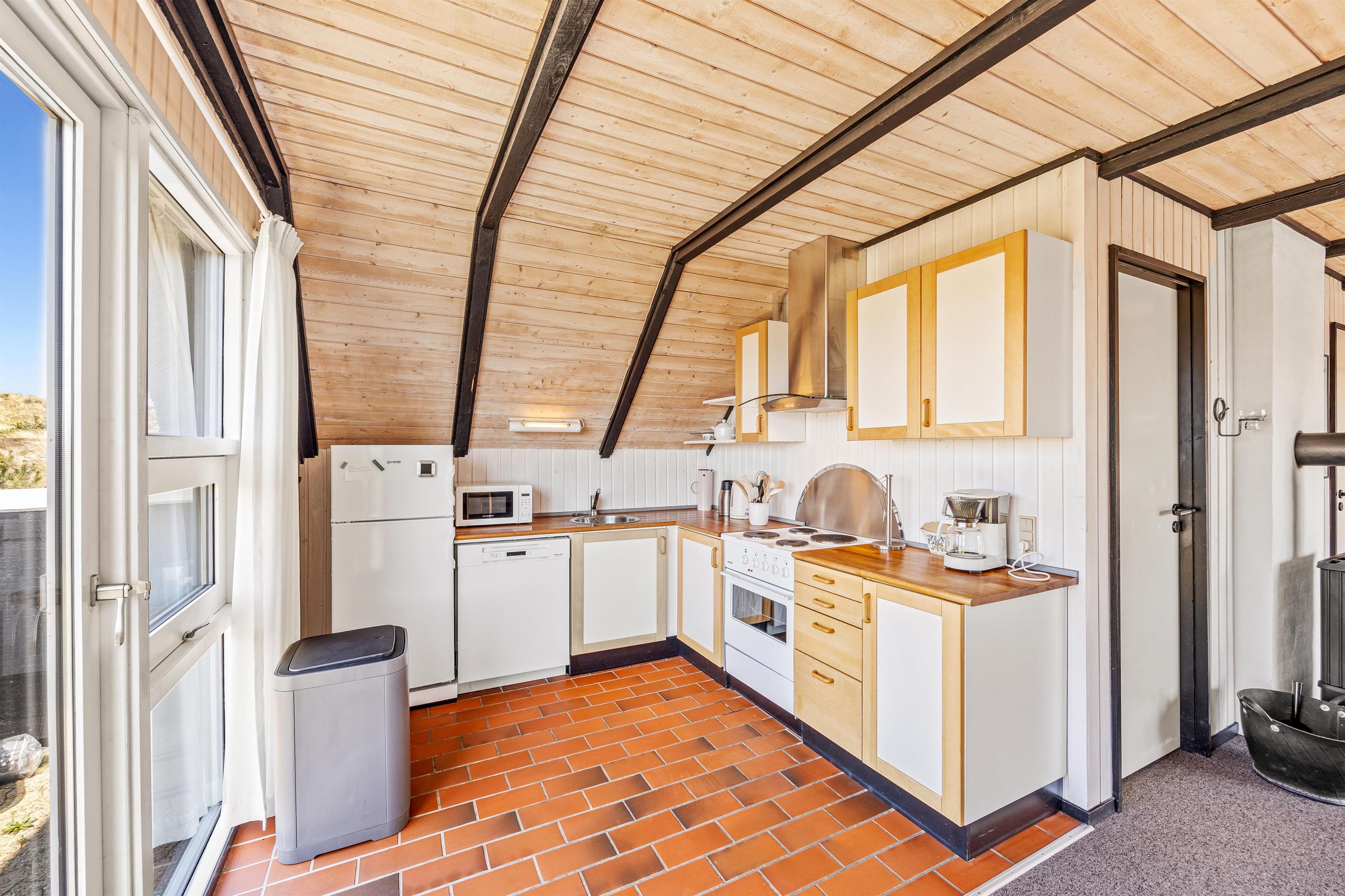 Stuen er hyggeligt indrettet med gulvtæppe og brændeovn. Det knitrende brænde skaber ikke blot en god varme, men sætter også prikken over i’et til feriestemningen. I sommerhuset er der også en energibesparende varmepumpe, som I med fordel kan benytte.