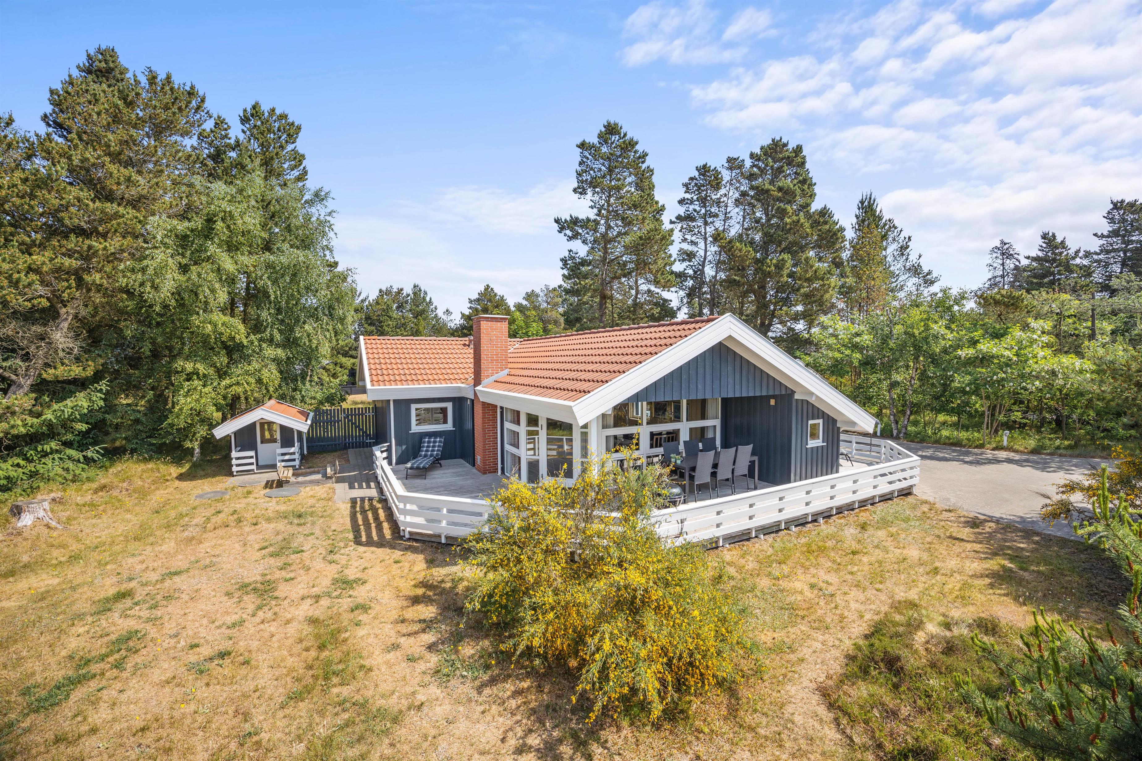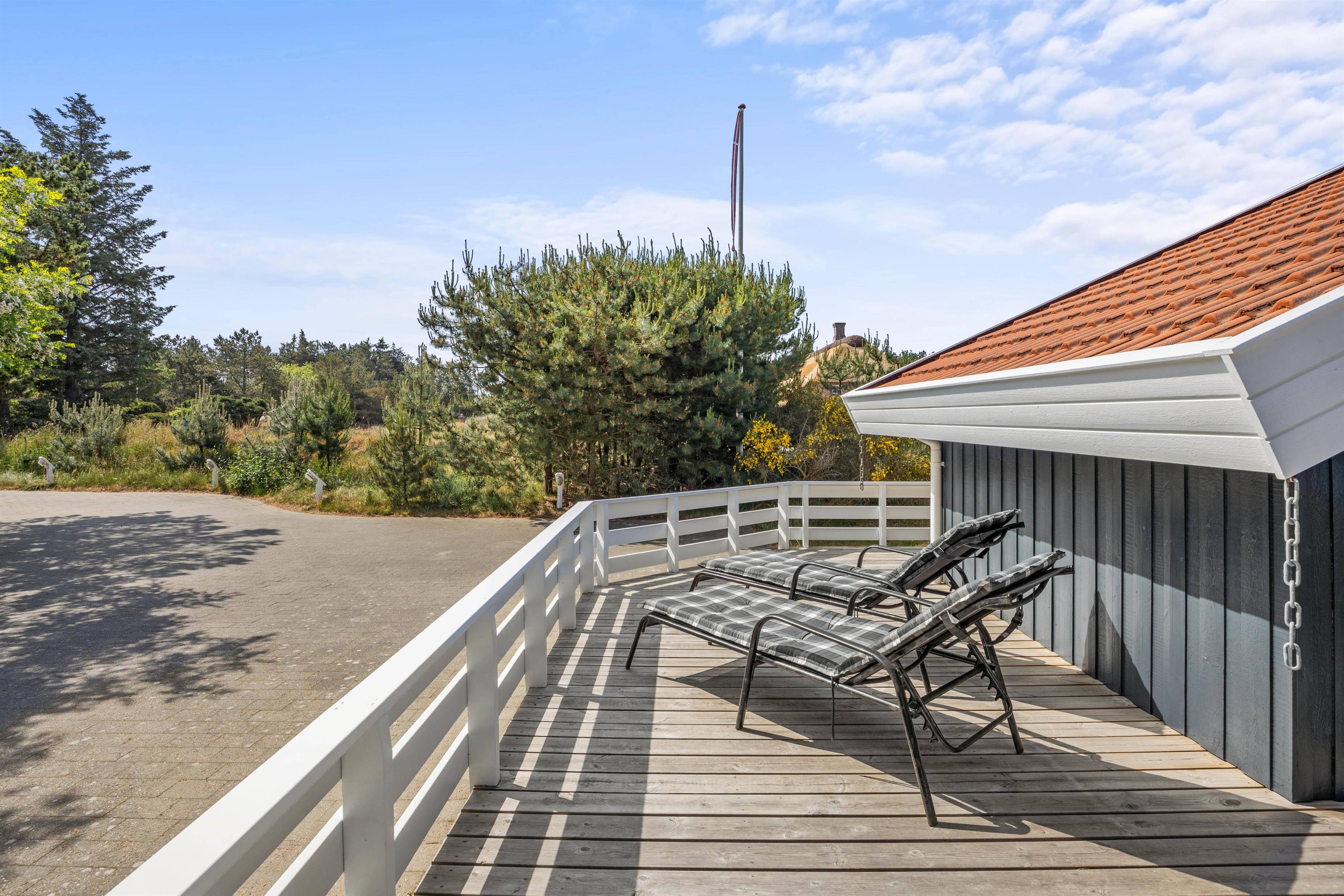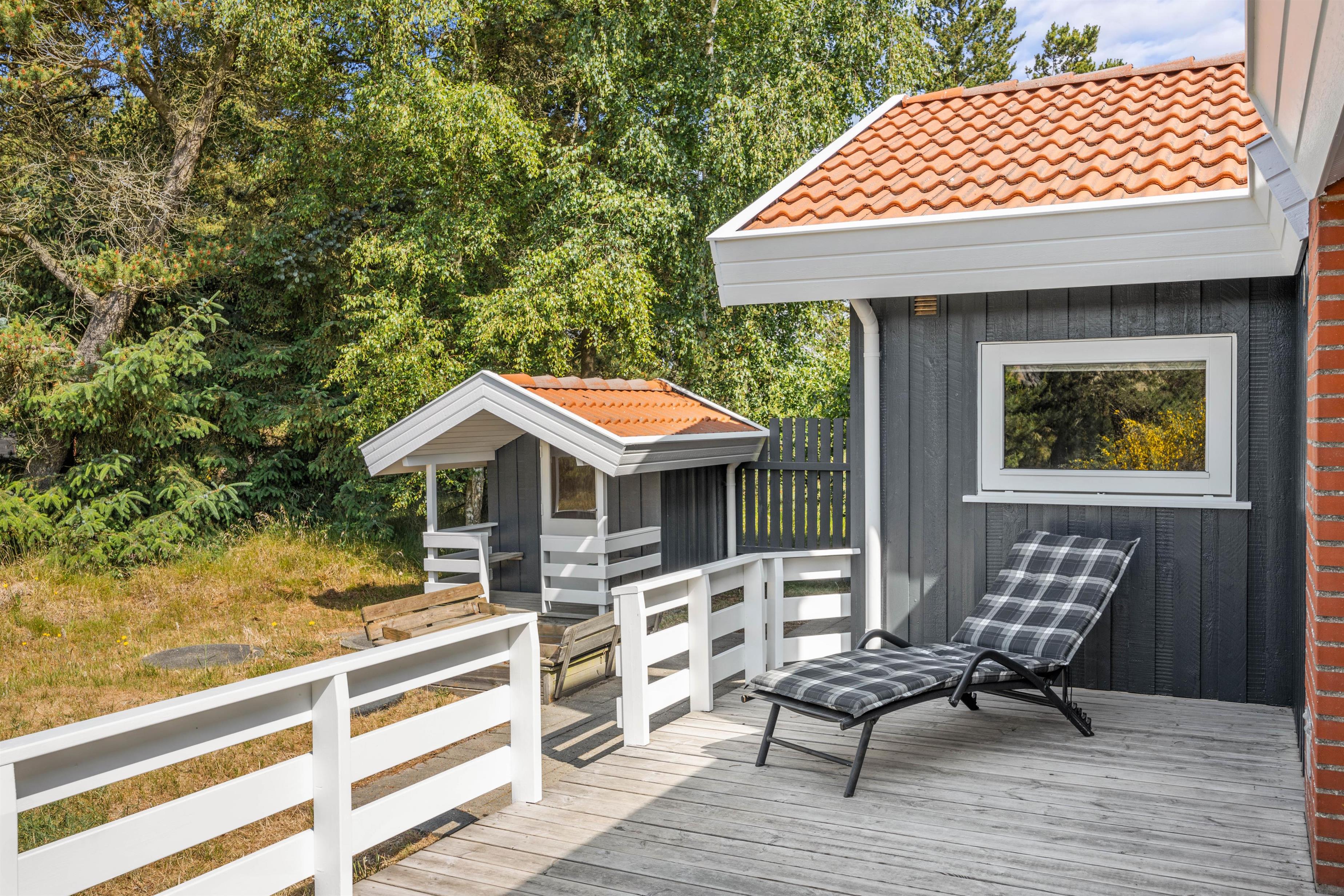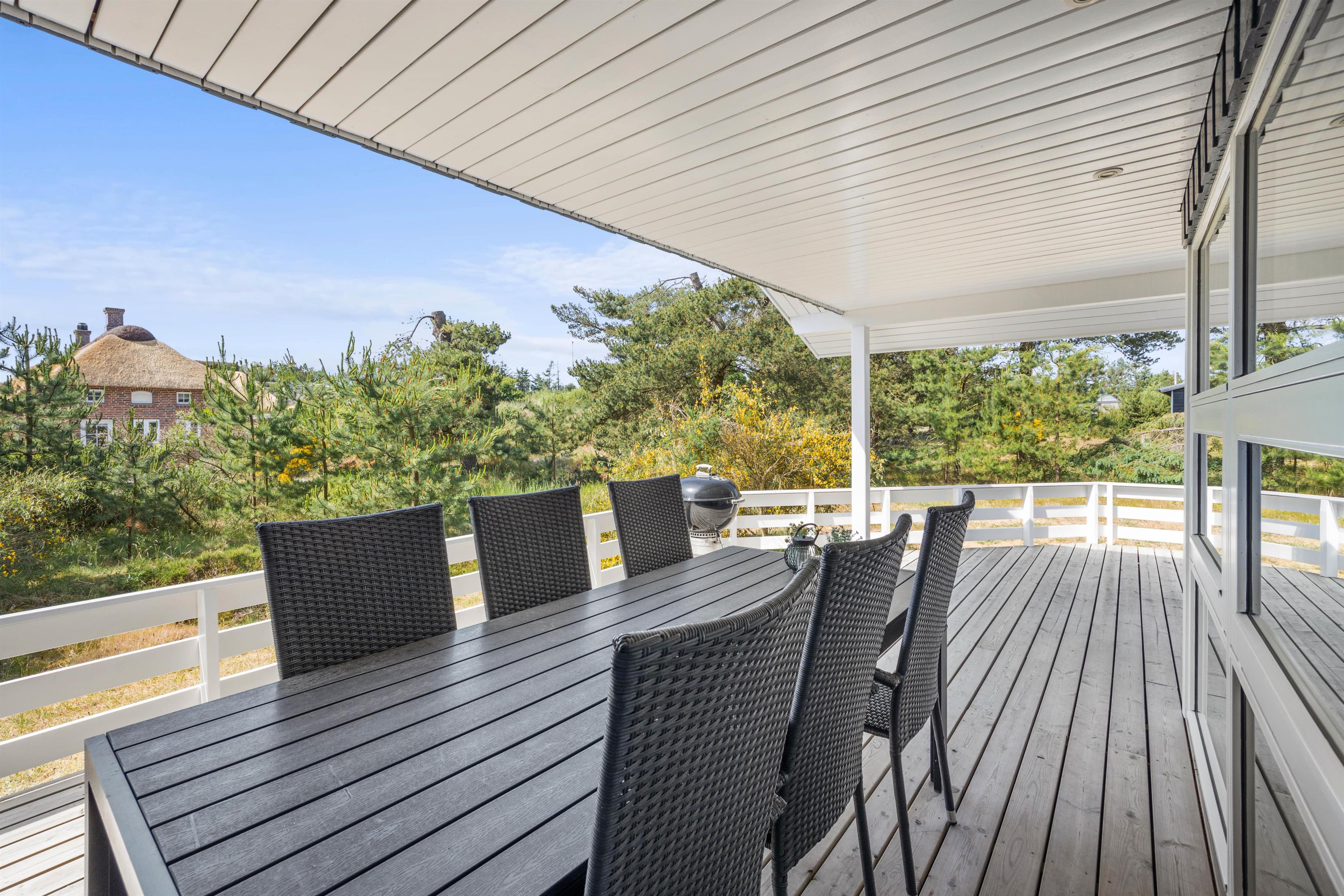 Udendørs har I en stor, skøn terrasse, som I kan nyde de solskinsfyldte feriedage på. På terrassen står der havemøbler og liggestole til rådighed for jer, så I kan finde jer godt til rette i solen. Terrassen er desuden delvist overdækket, så hvis I skulle få brug for en pause i skyggen, har I også mulighed for det.
