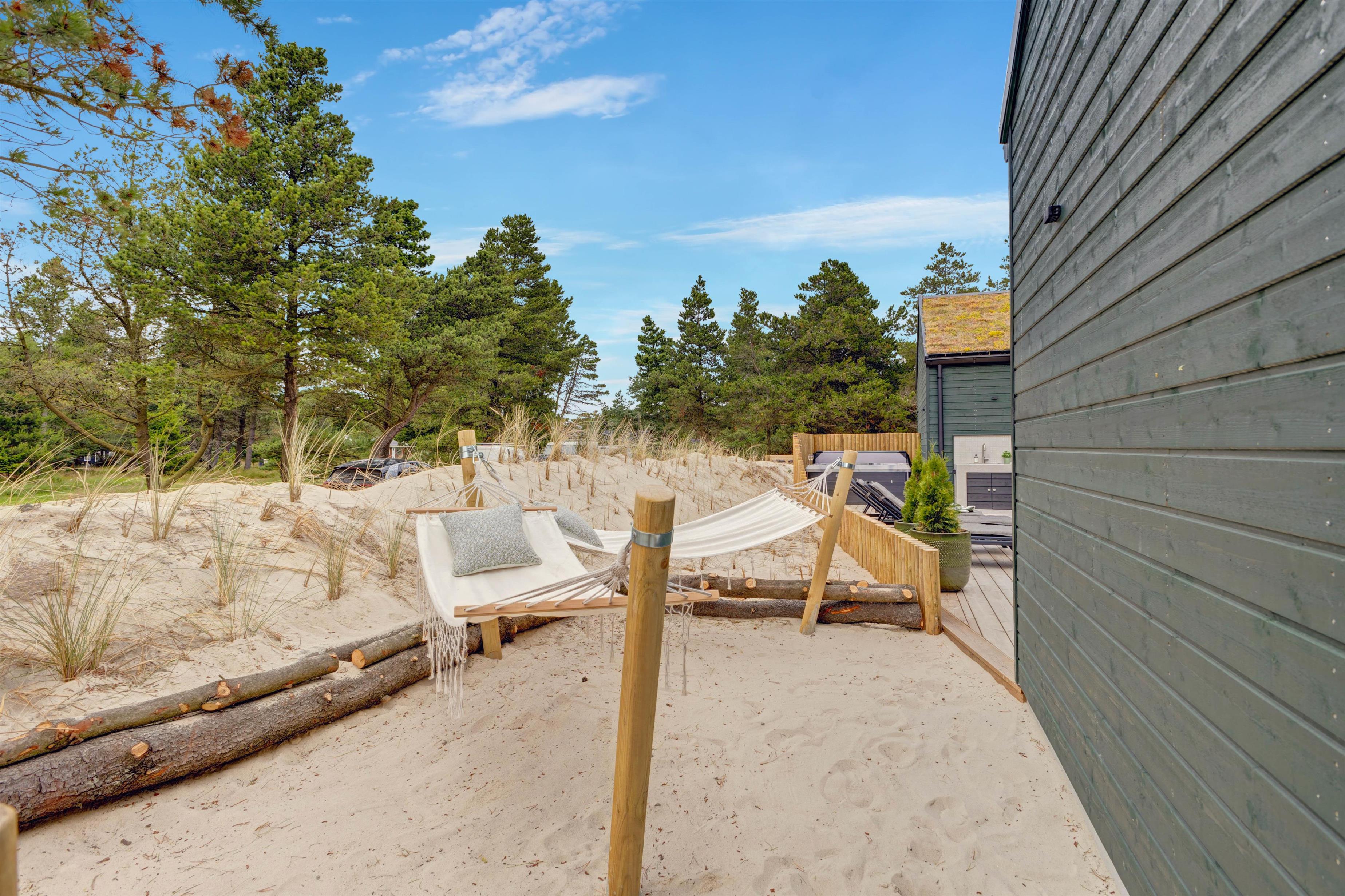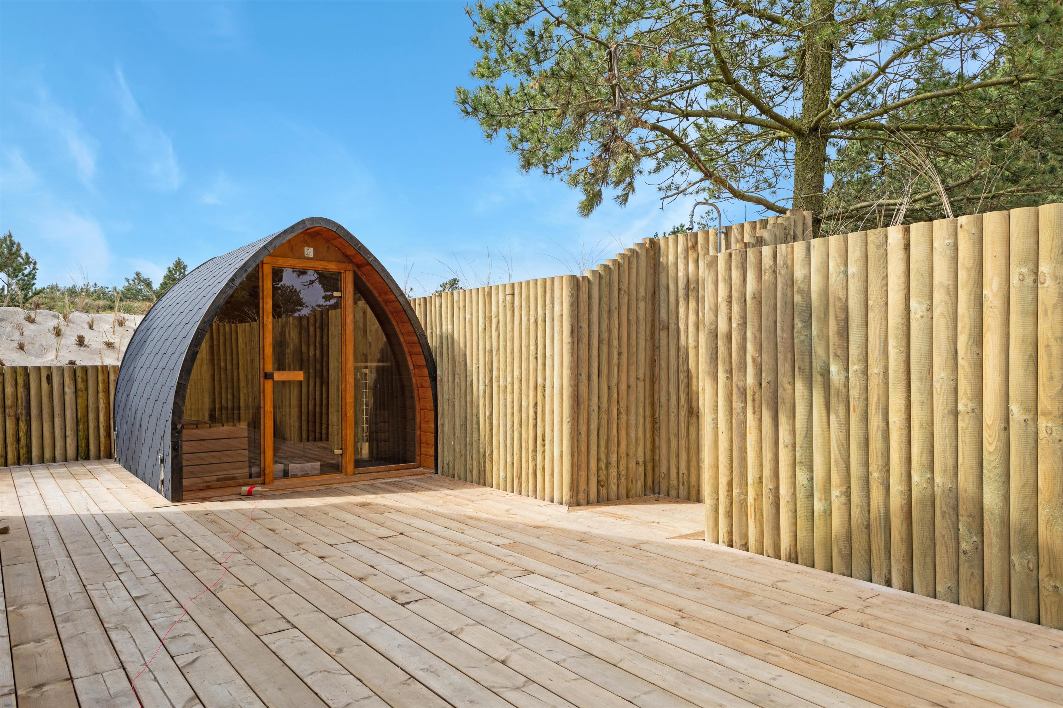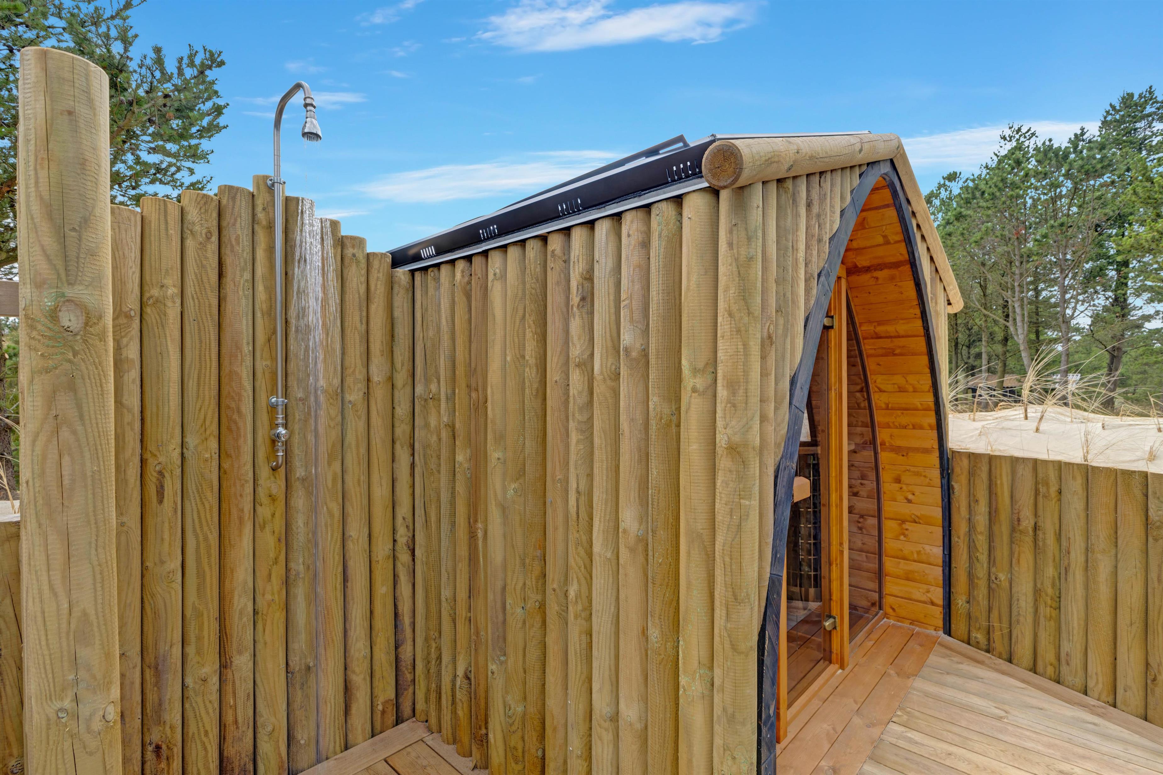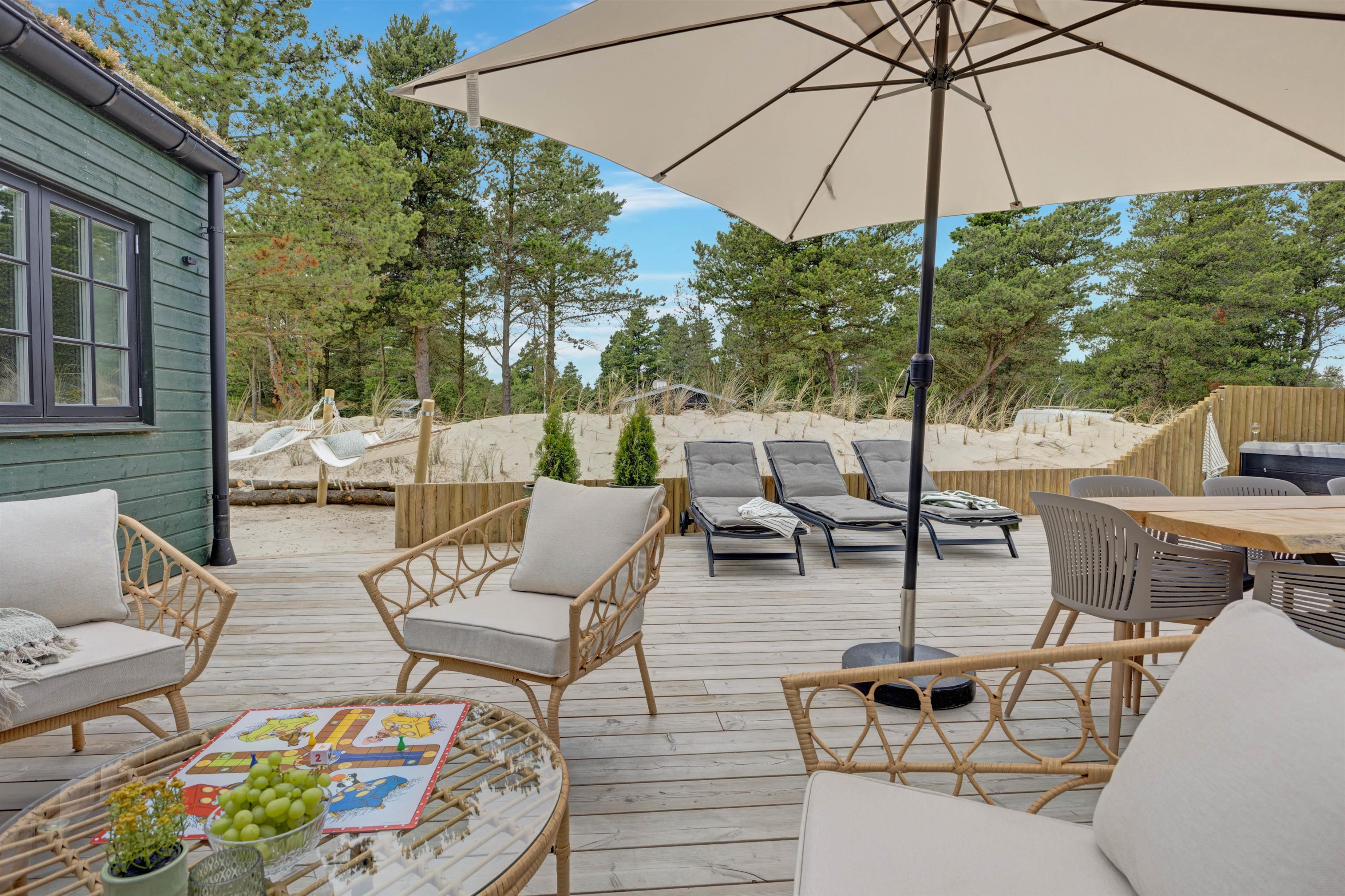Terrassen er delvist lukket og afskærmet, og udeområdet rummer også en udebruser, en udesauna, en spa til 5 personer samt sandkasse og gynge m.m., så der er rig lejlighed til, at ung som gammel såvel som hunde kan få et skønt ophold i det dejlige, grønne hus i den betagende vestjyske natur. Udebruseren kan benyttes fra 1. april til 31. oktober.