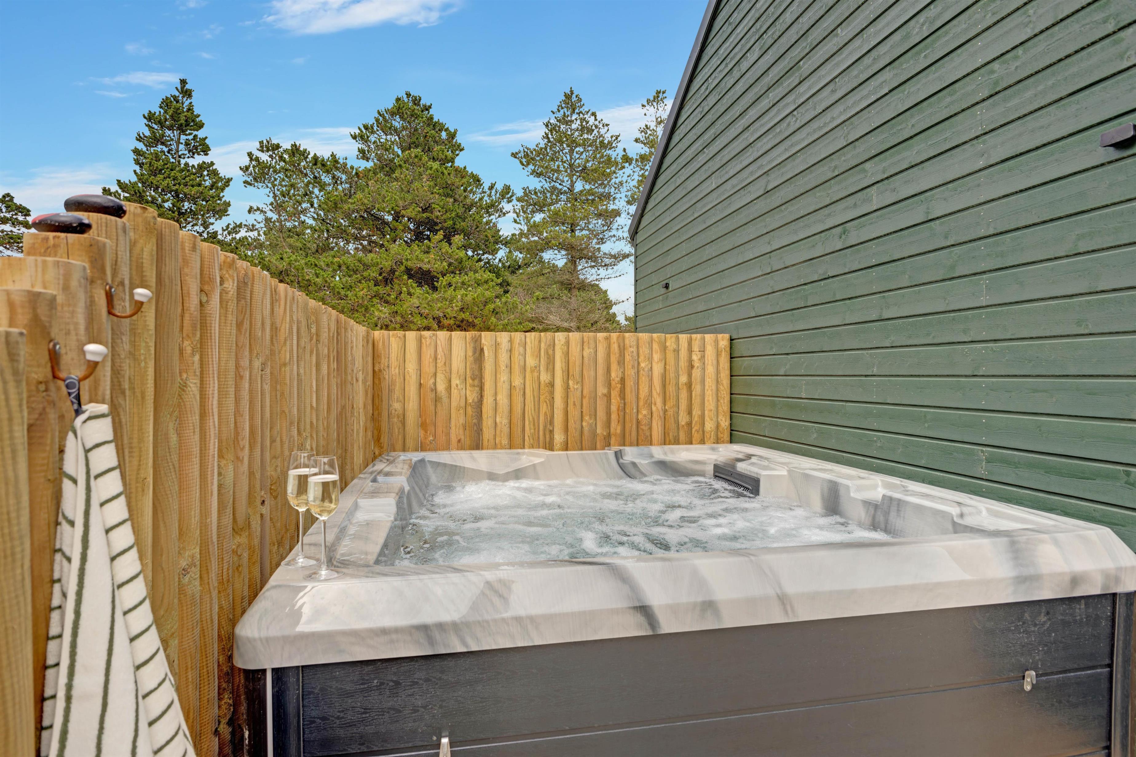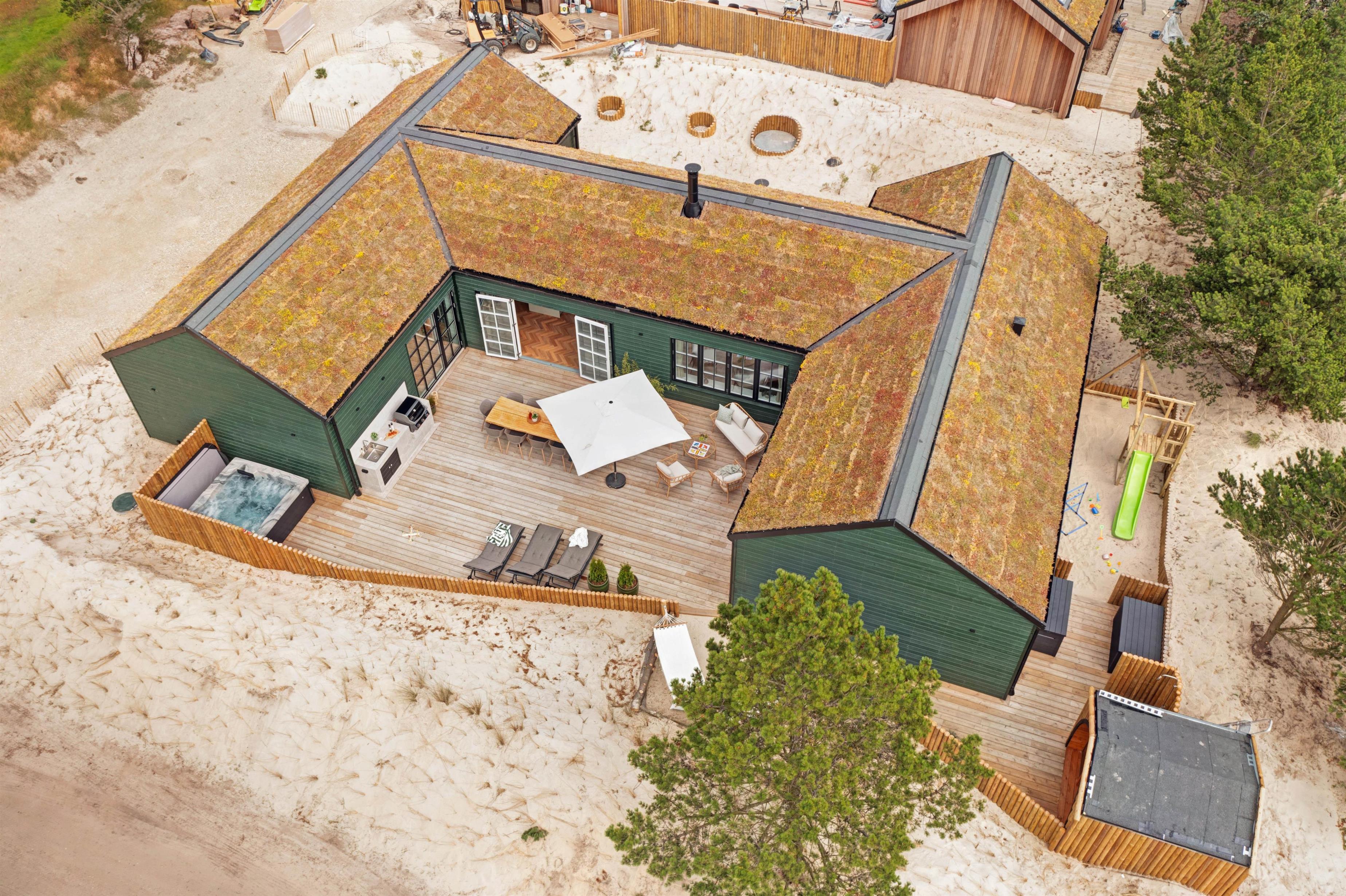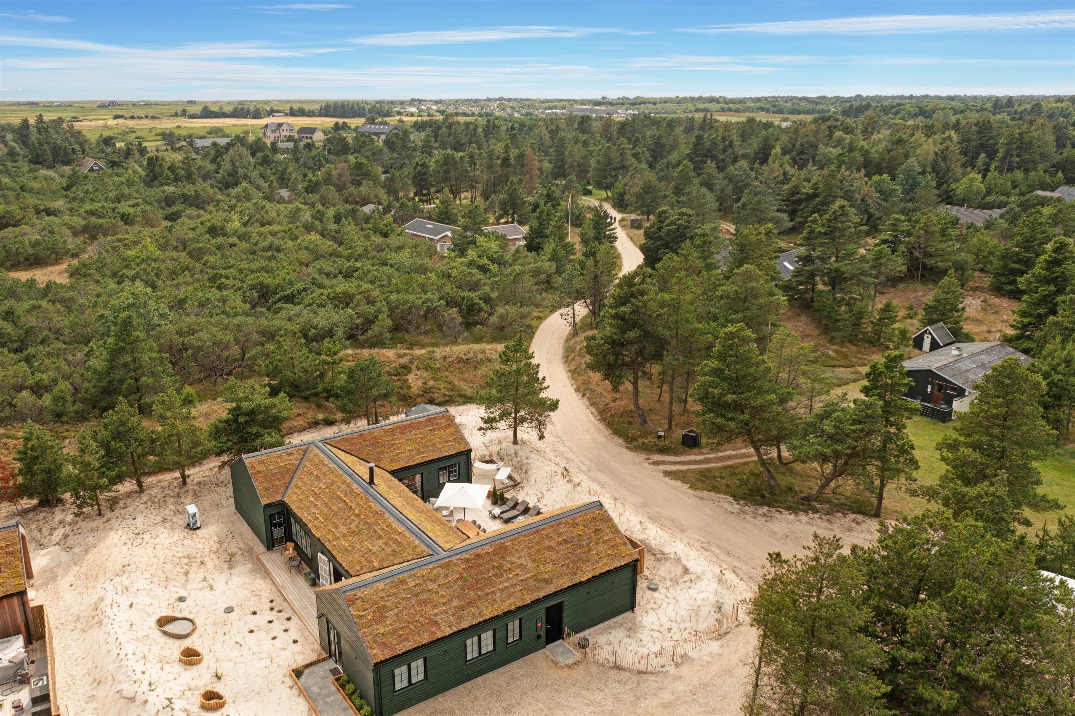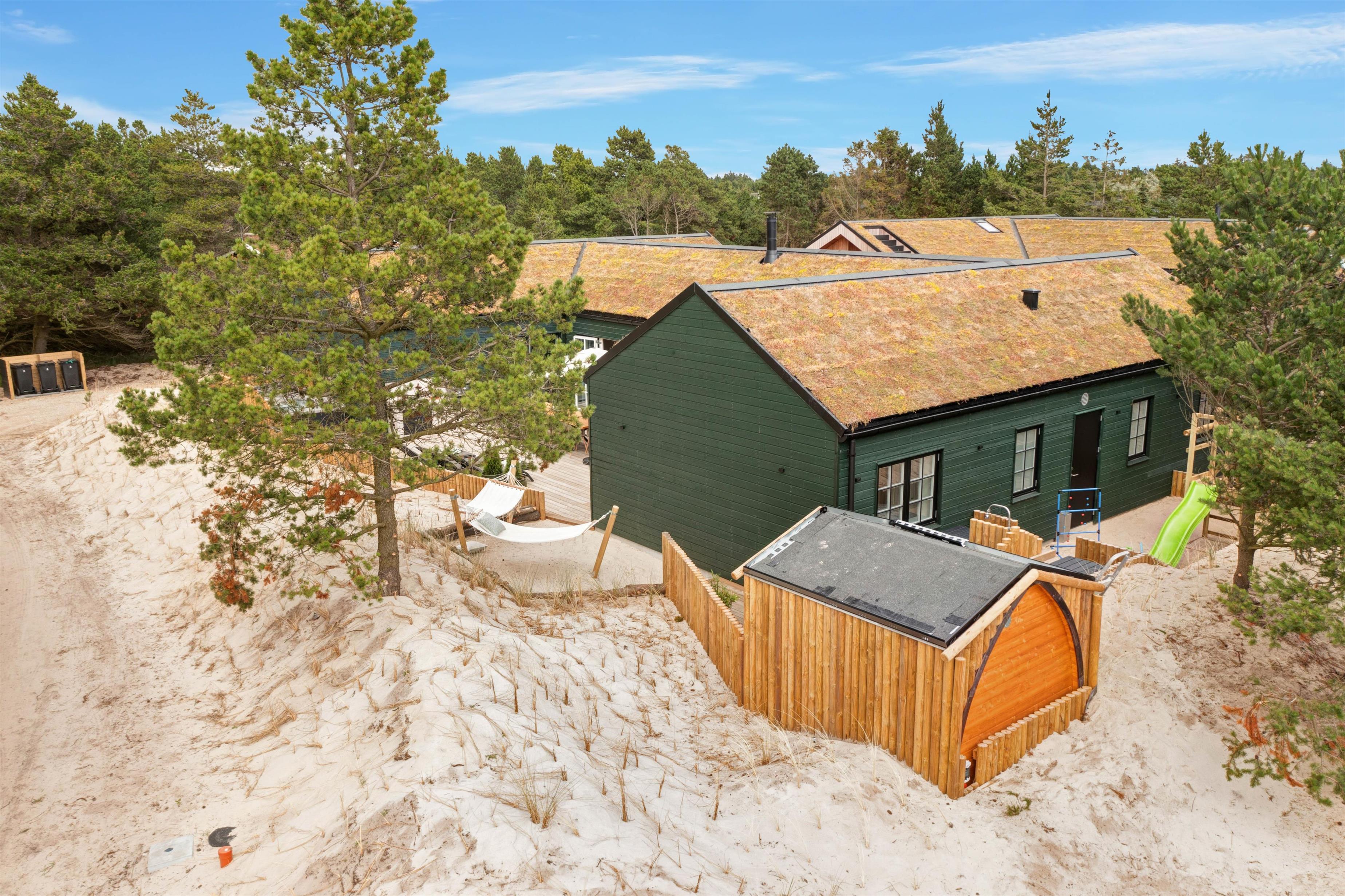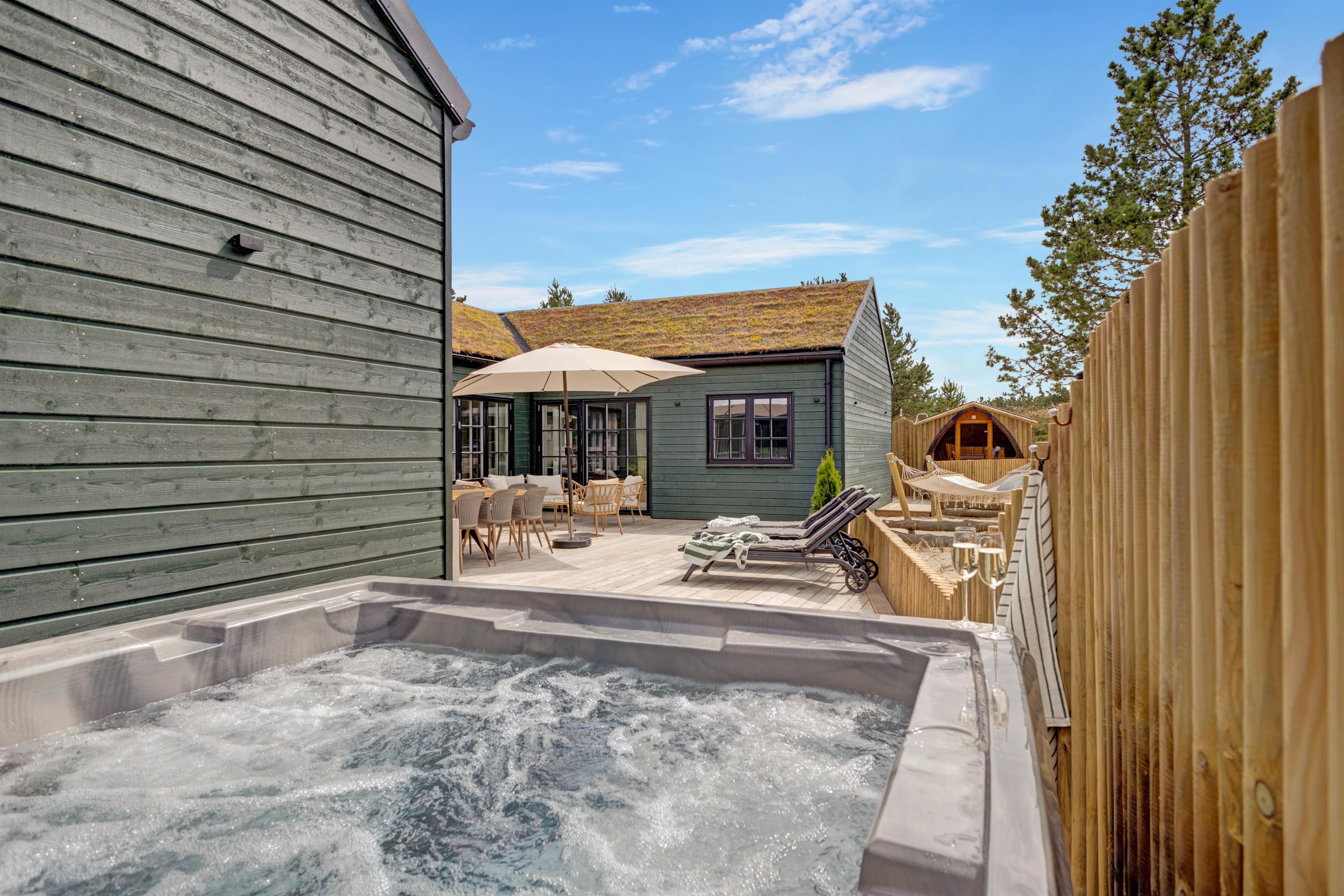 Terrassen er delvist lukket og afskærmet, og udeområdet rummer også en udebruser, en udesauna, en spa til 5 personer samt sandkasse og gynge m.m., så der er rig lejlighed til, at ung som gammel såvel som hunde kan få et skønt ophold i det dejlige, grønne hus i den betagende vestjyske natur. Udebruseren kan benyttes fra 1. april til 31. oktober.