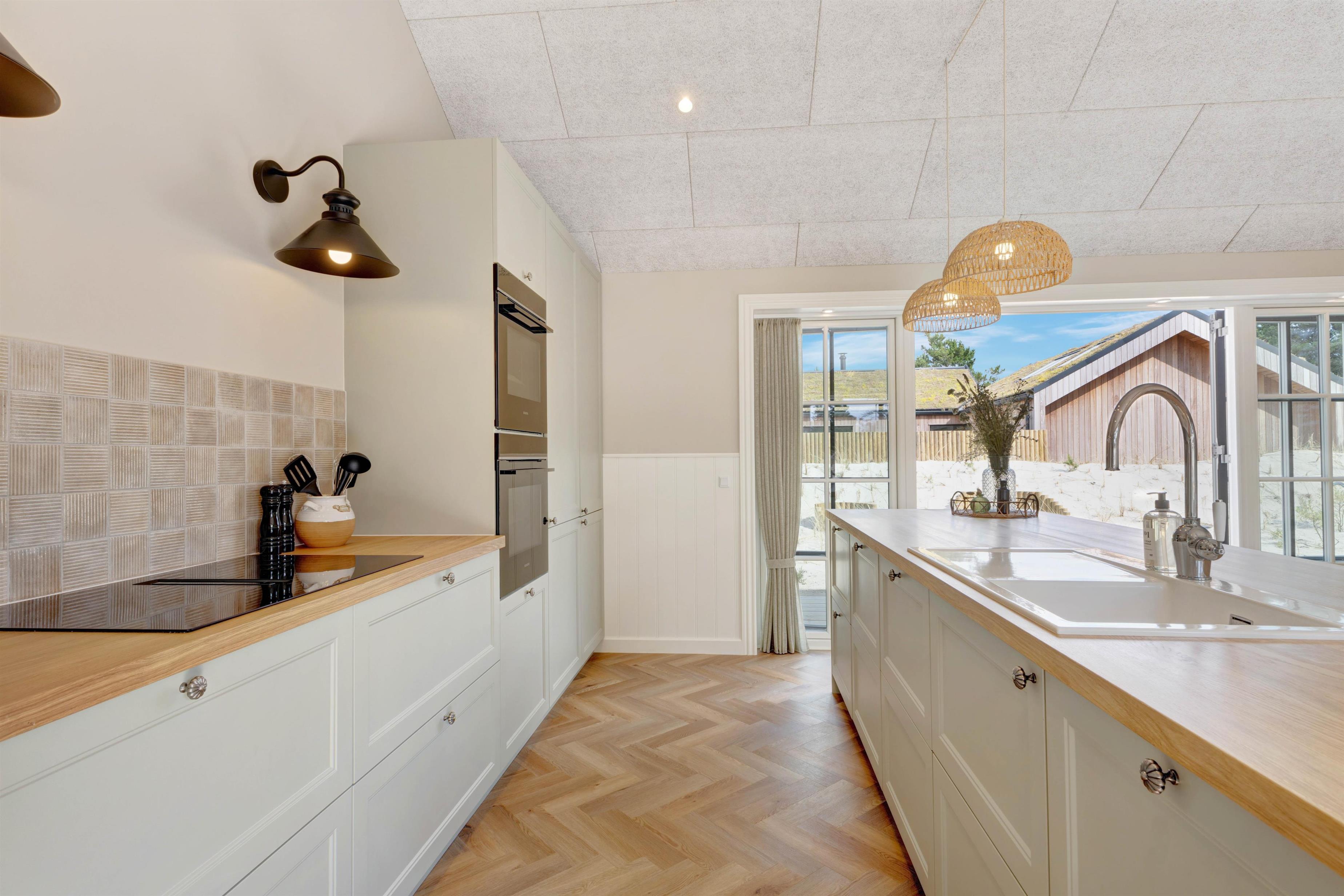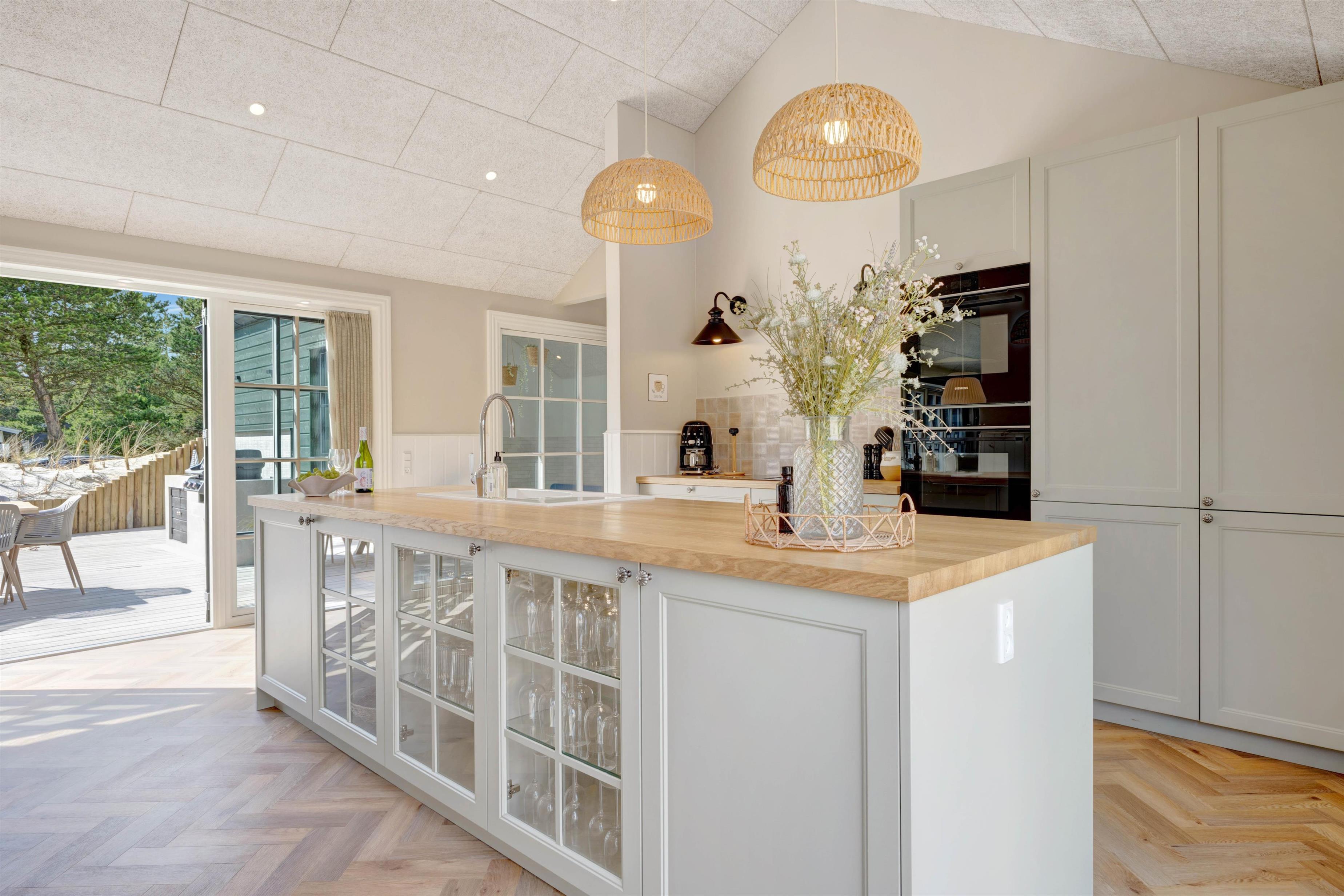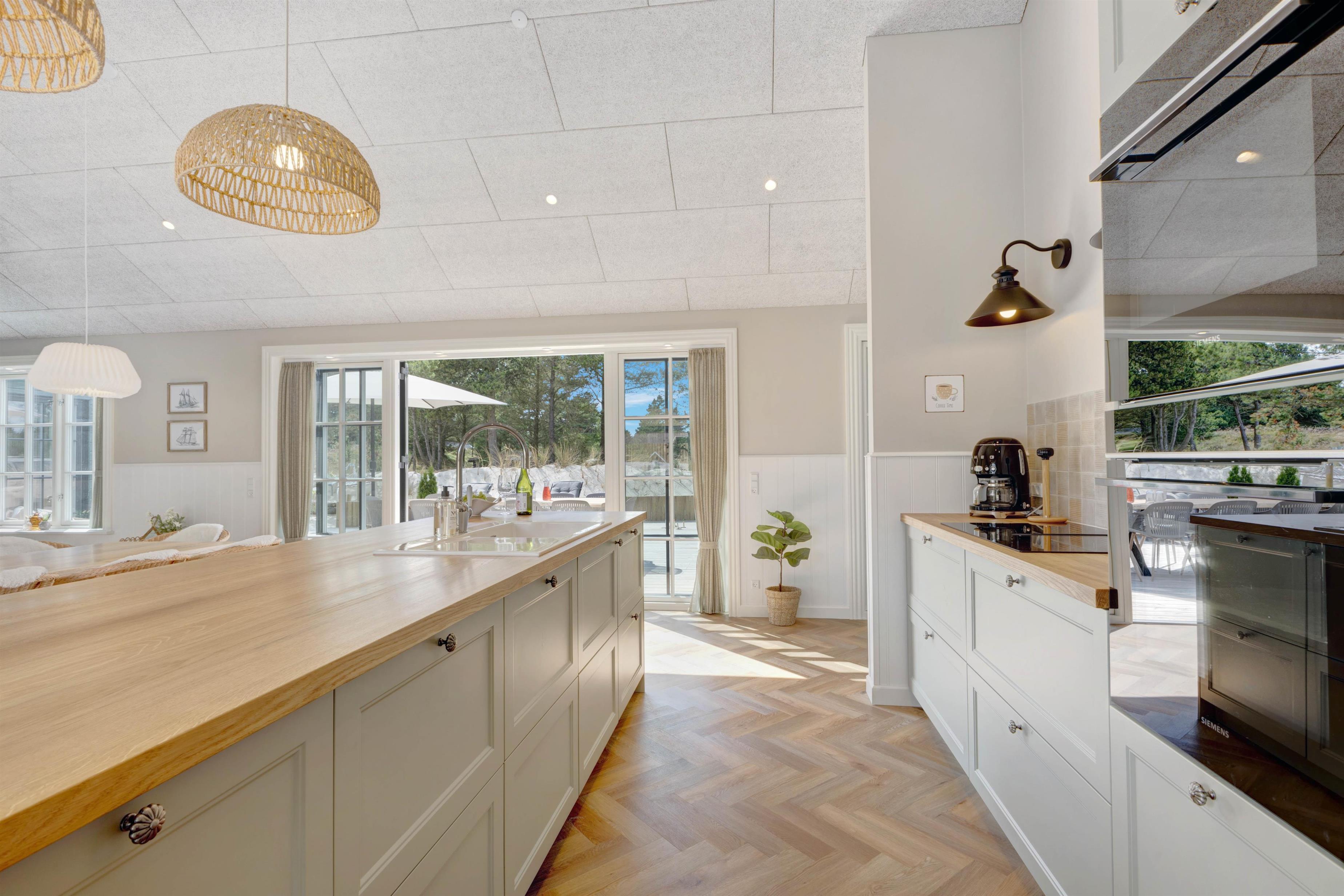 Alt er gennemført til mindste detalje lige fra det smukke køkken, hvor I kan lave dejlig feriemad og stadig følge med i aktiviteterne inde og ude, til stuen og resten af huset. Køkkenet har både mikroovn og opvaskemaskine og er desuden udstyret med en 70 liters separat fryser, så I kan opbevare indkøbte madvarer.