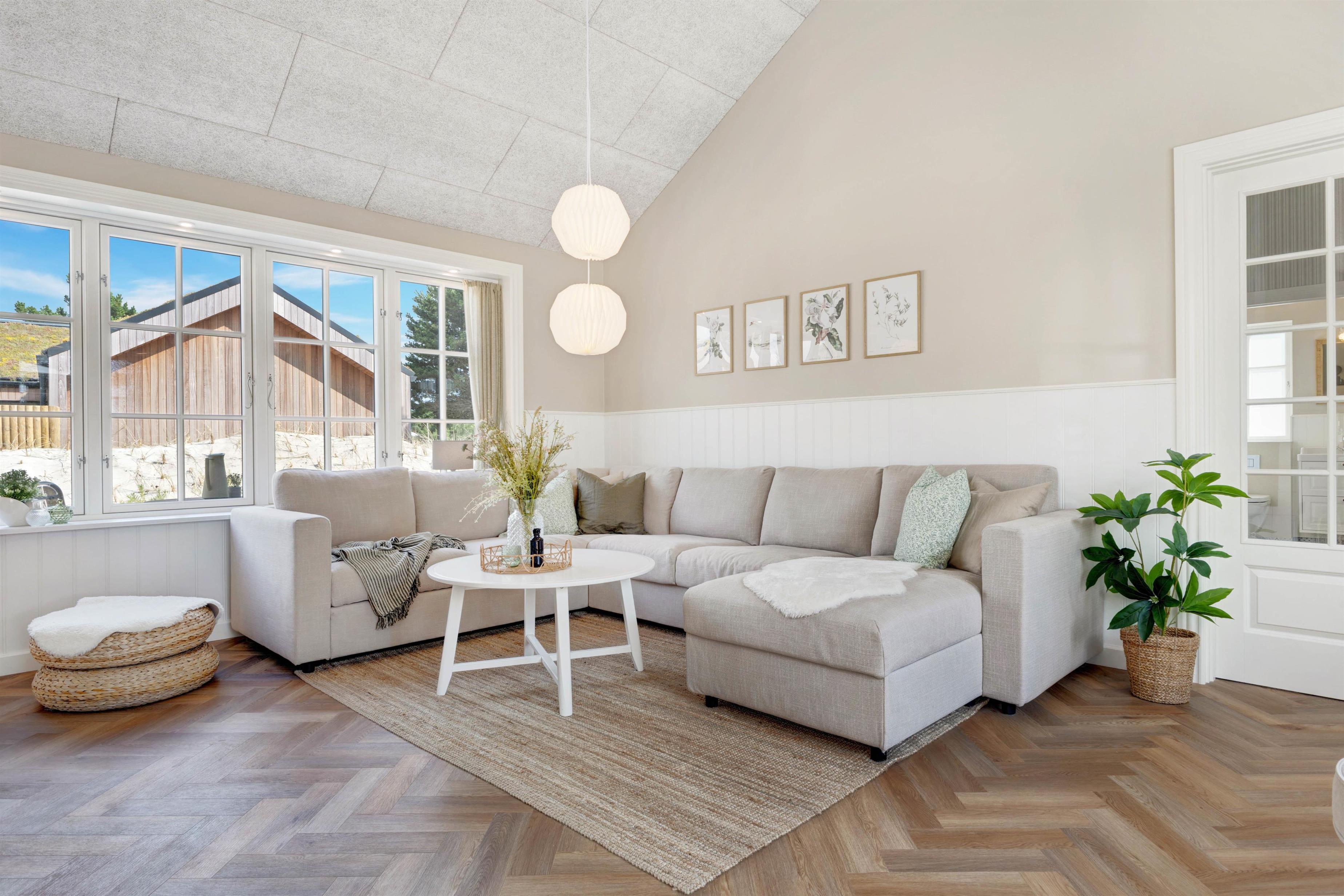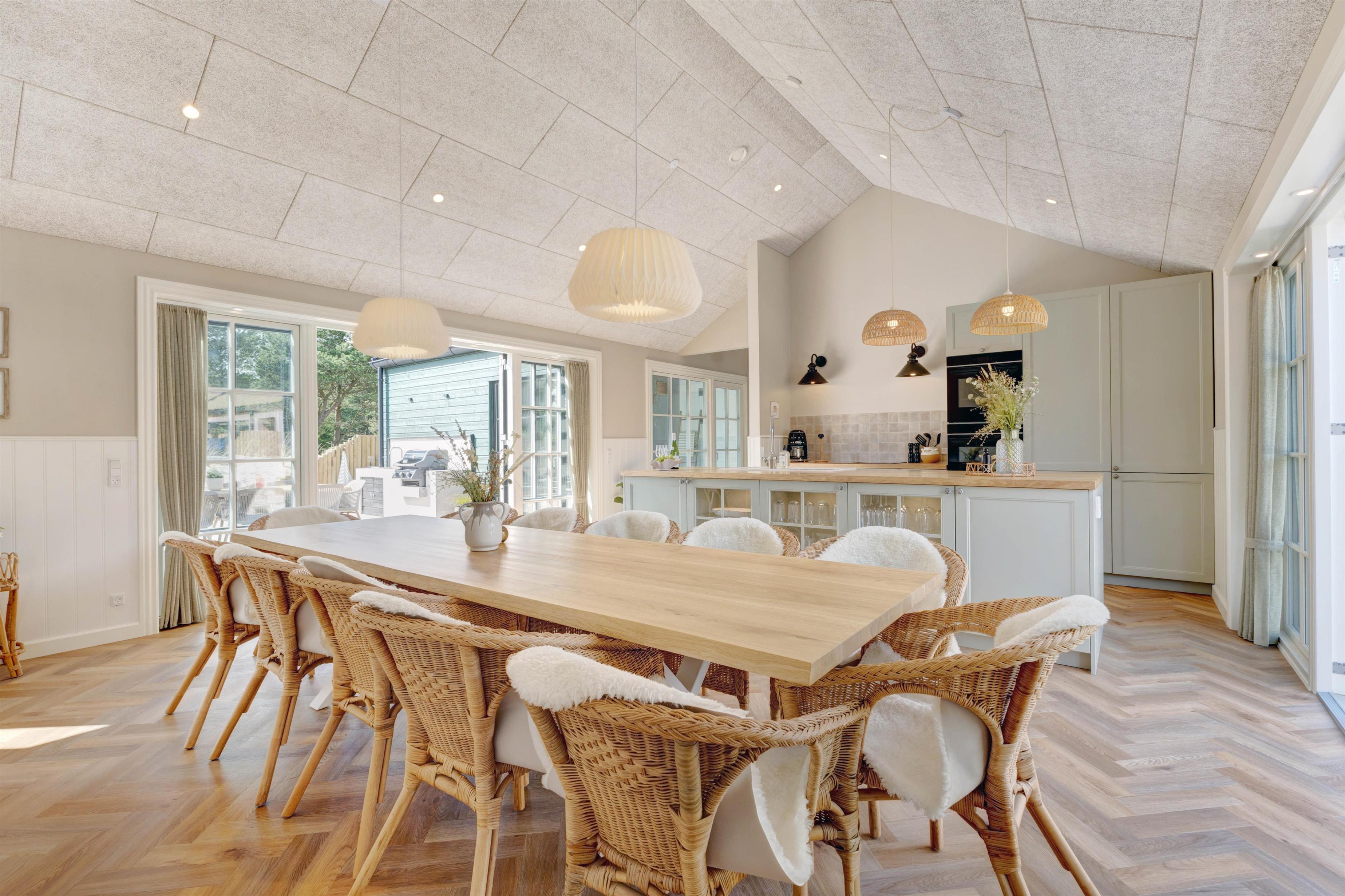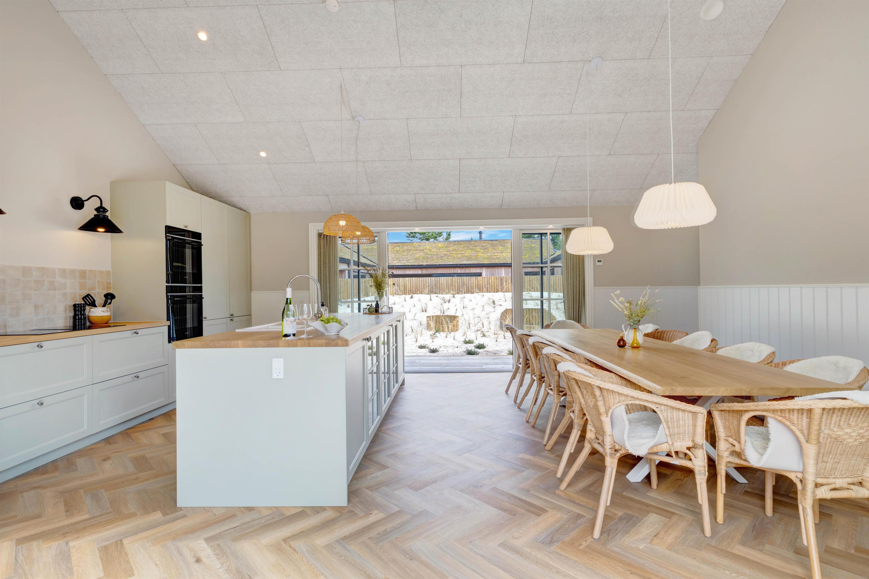 Alt er gennemført til mindste detalje lige fra det smukke køkken, hvor I kan lave dejlig feriemad og stadig følge med i aktiviteterne inde og ude, til stuen og resten af huset. Køkkenet har både mikroovn og opvaskemaskine og er desuden udstyret med en 70 liters separat fryser, så I kan opbevare indkøbte madvarer.