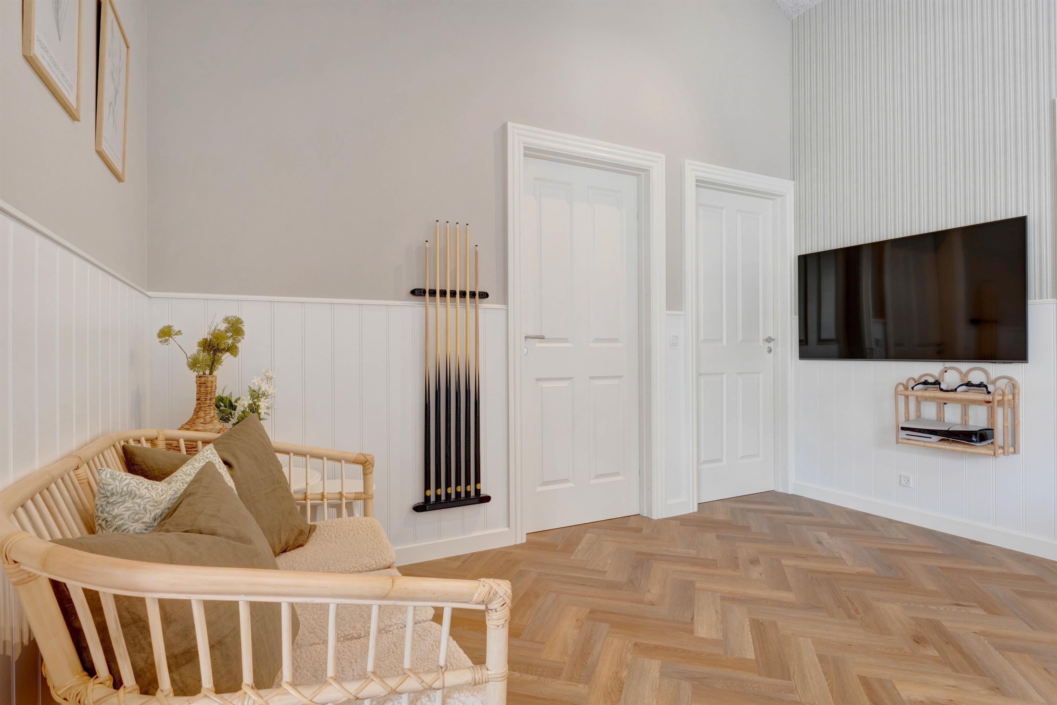 I alle de seks soveværelser er der magelige dobbeltsenge og gode garderobeskabe, så I virkelig kan flytte ind i huset og få hvilet godt ud i ferien, og ferietøjet tager vaskemaskine og tørretumbler sig af, ligesom varmepumpen sørger for et altid behageligt indeklima, uanset vejret udenfor.