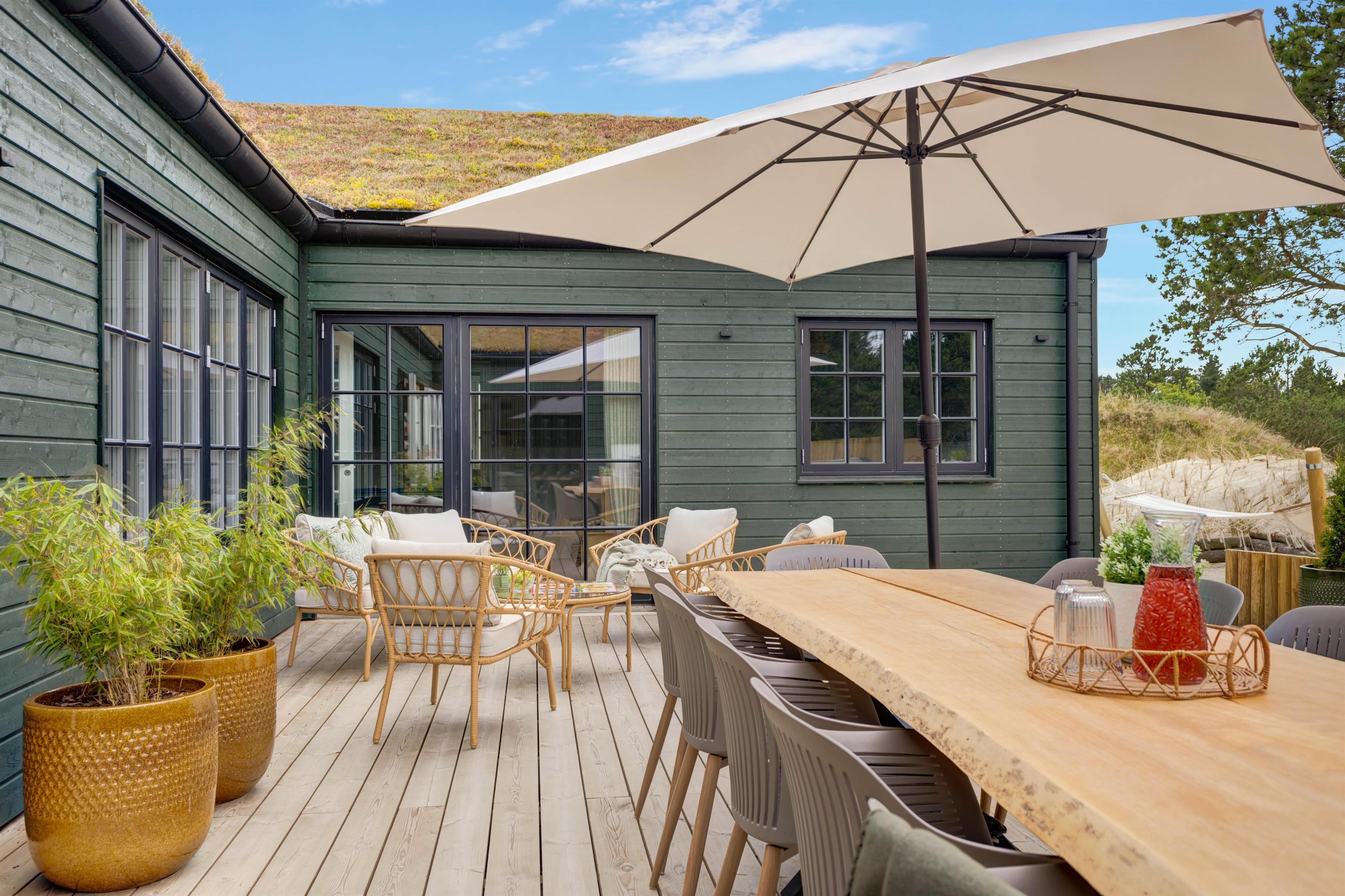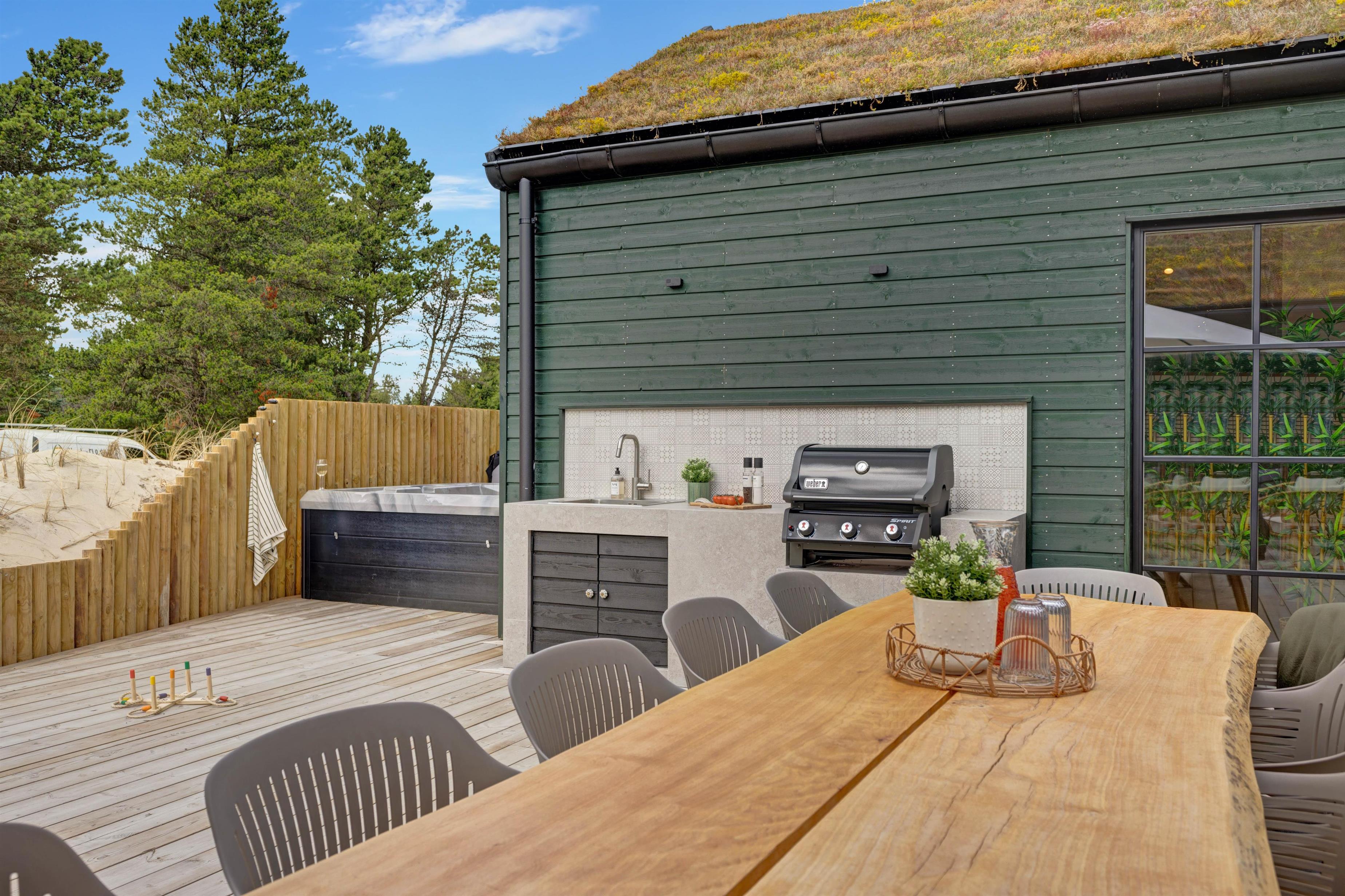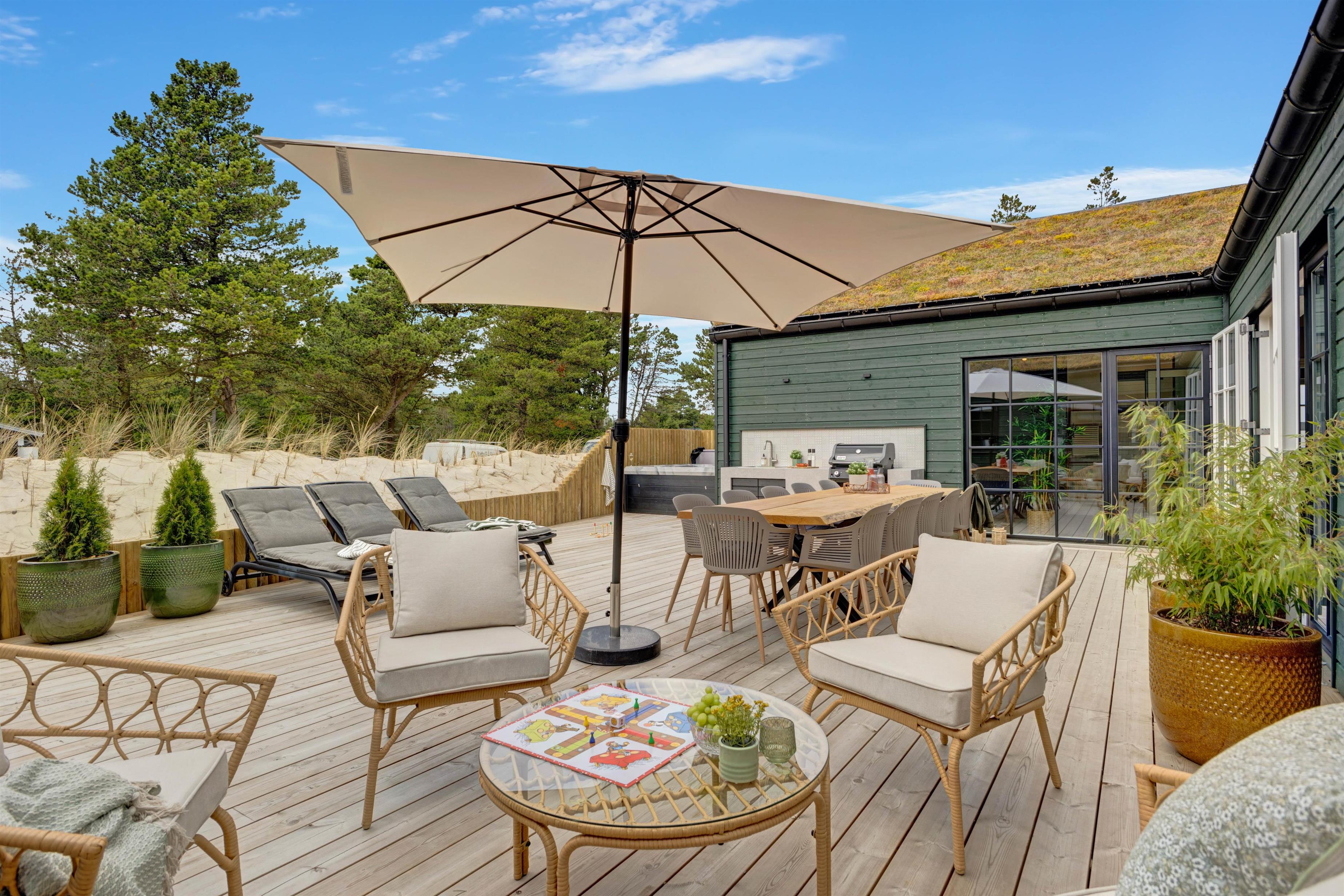 Også terrasseområdet forkæler alle sanser. Her kan I samles omkring langbordet, nyde solen fra liggestolene og få gode samtaler i havemøblerne over lidt godt til ganen, som I kan lave på gasgrillen i udekøkkenet.
