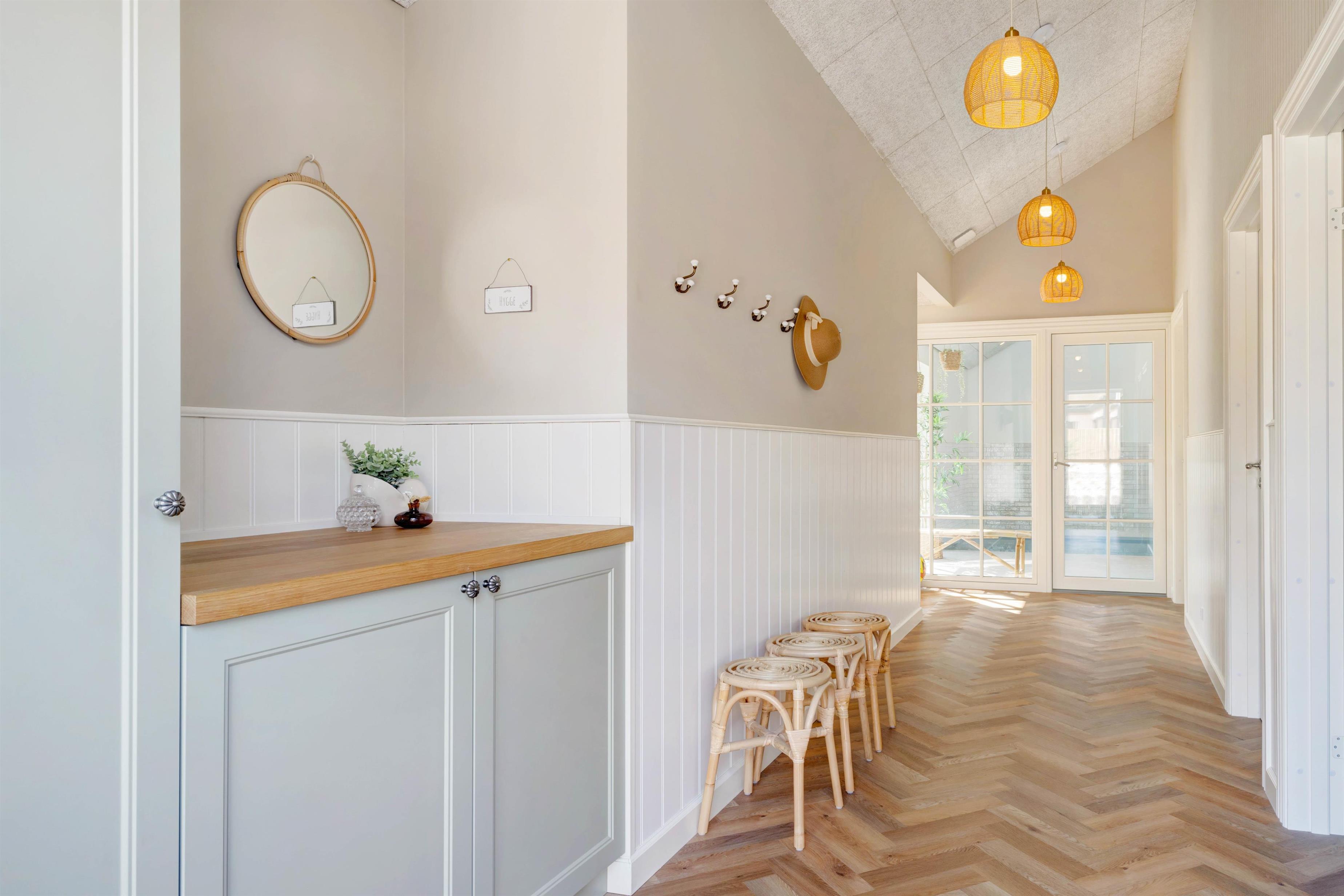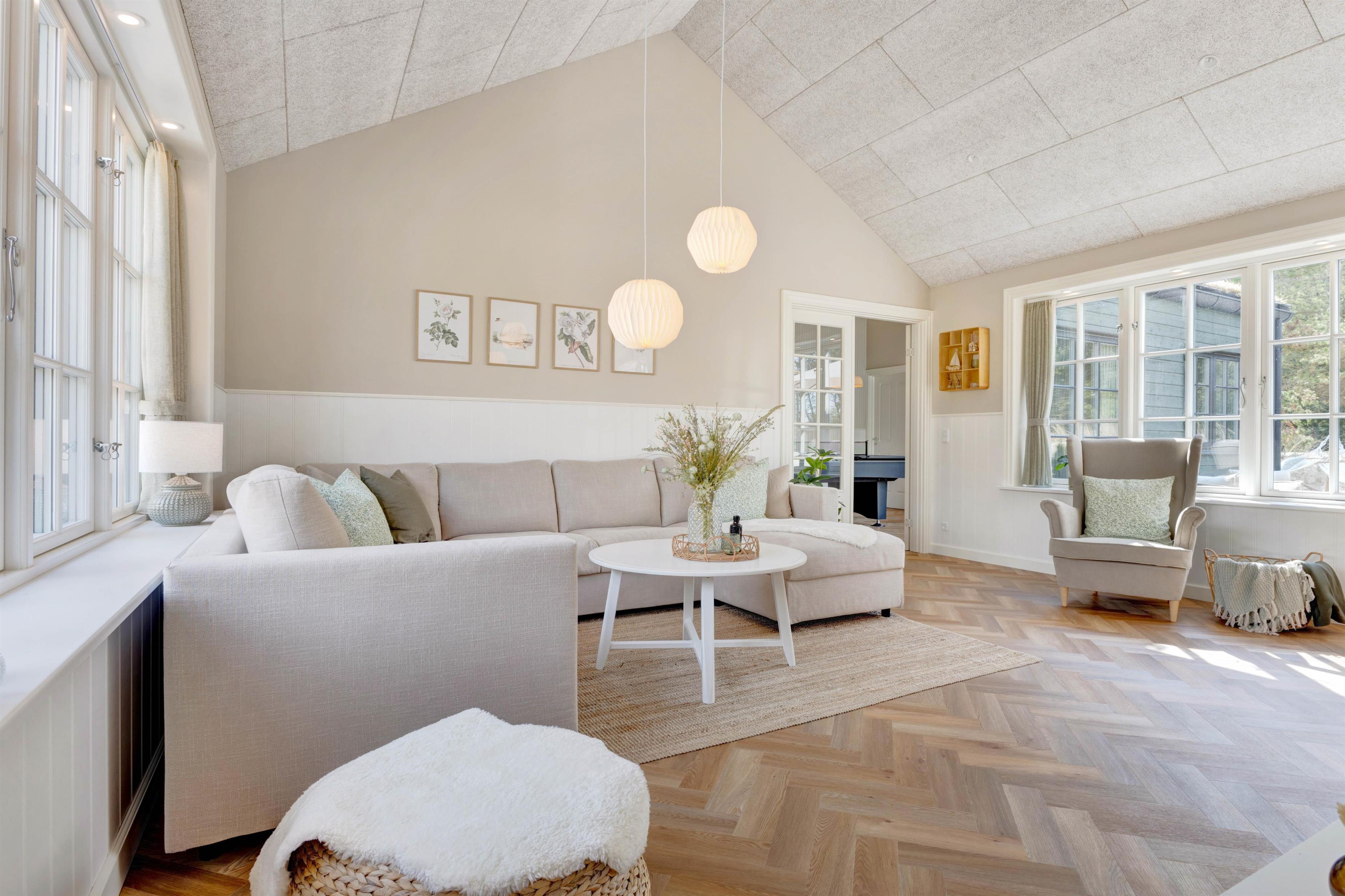 Huset møder jer i al sin skønhed, fra I træder ind ad døren, med smagfuldt indrettede rum i fine farver og en stemning lidt á la badehotel. Lyset strømmer ind ad de store vinduer og døre, så sindet løftes på selv en mørk vinterdag.