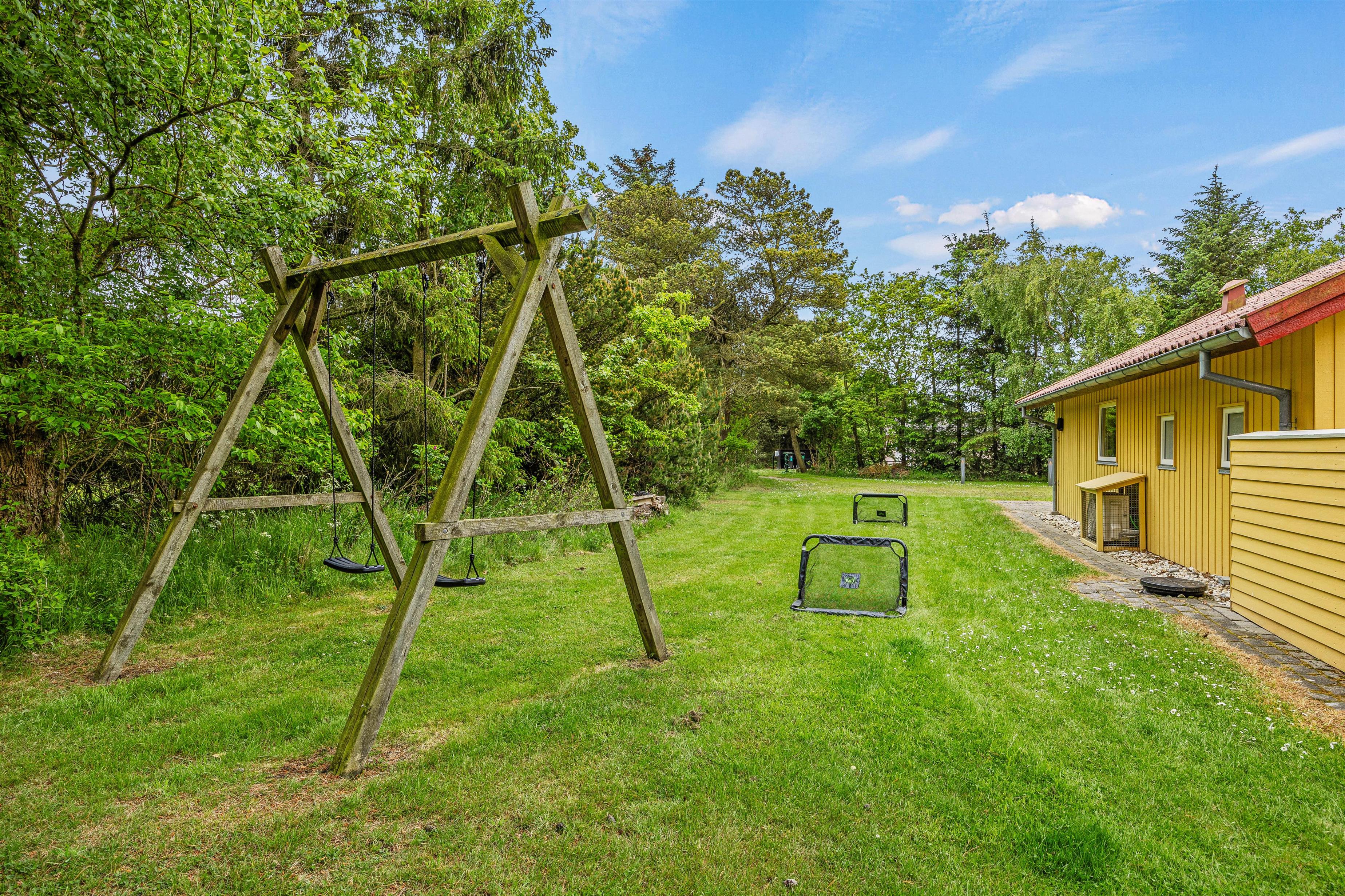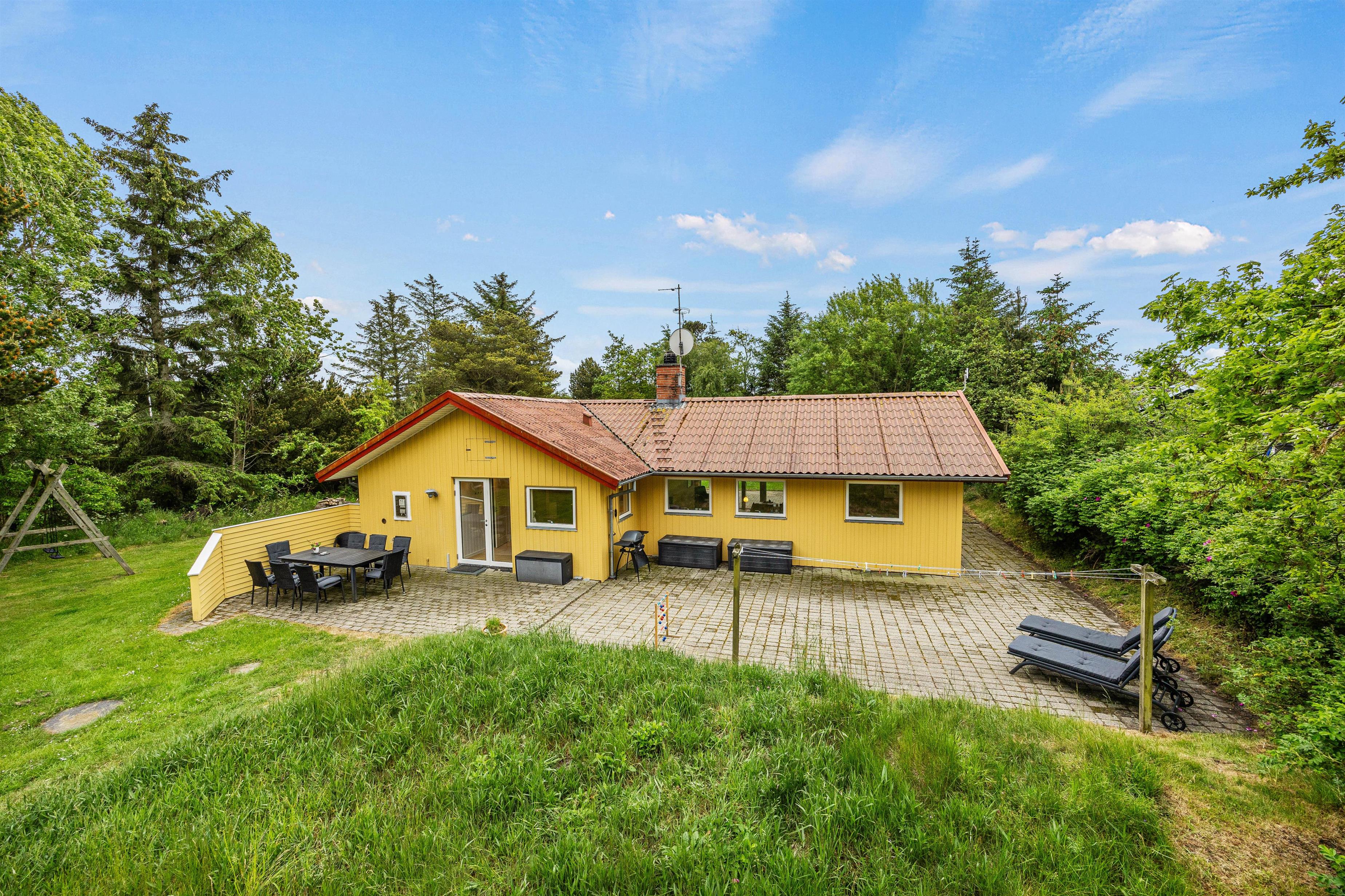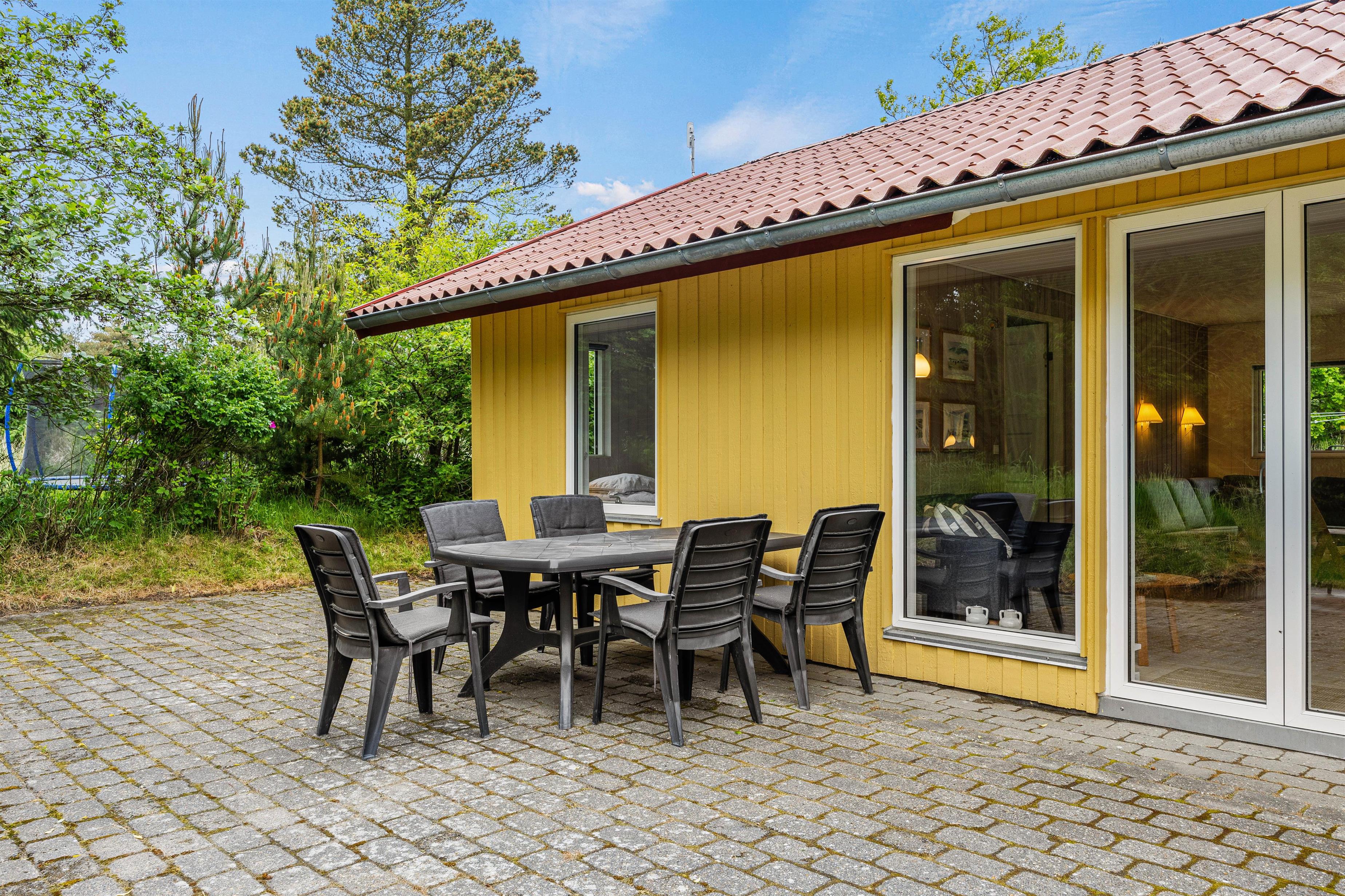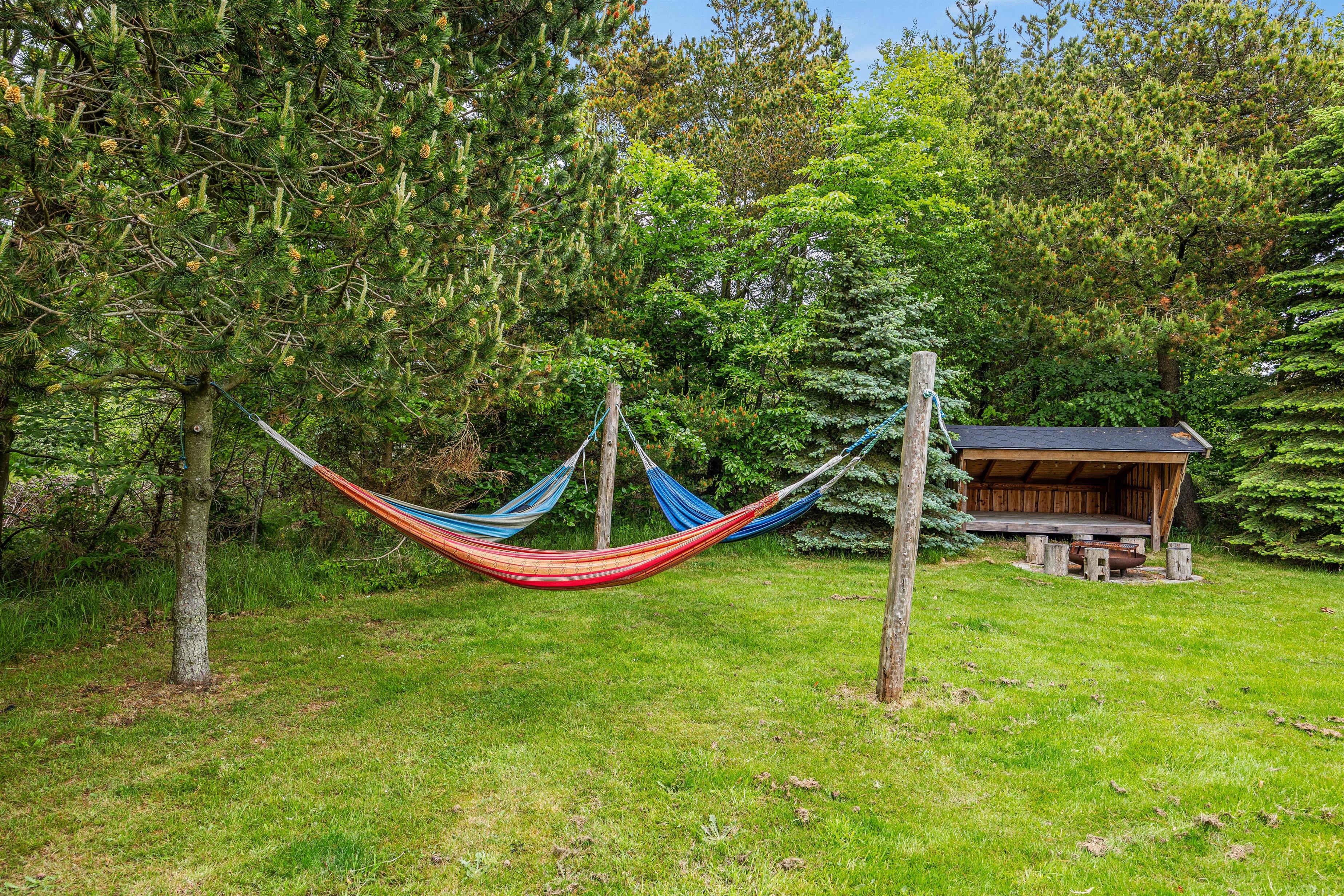 På sommerhusets terrasse står havemøbler og liggestole klar til jer, så I komfortabelt kan nyde sommersolen, mens børnene leger på naturgrunden, og i dette hus vil I også kunne få en lur i en hængekøje udenfor på dage med dejligt vejr - hængekøjerne står klar til jer i en kurv i gangen i huset.
