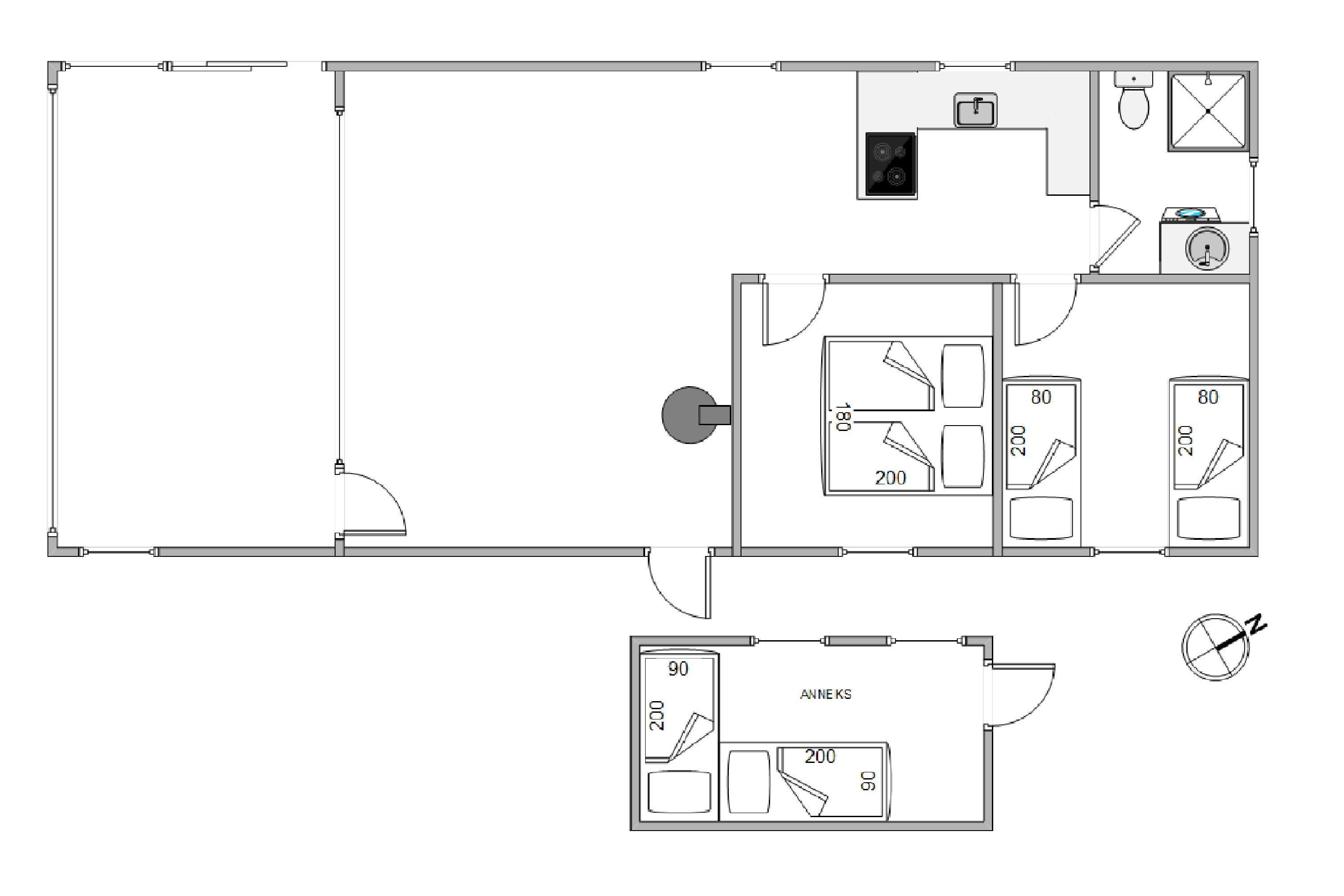 Ud over hovedhuset, som indeholder 2 soveværelser, et badeværelse med gulvvarme og et køkkenalrum med integreret stueområde, findes der et anneks med yderligere 2 sovepladser. Især et oplagt valg til familiens teenagere, der holder af at kunne trække sig tilbage og have lidt privatliv på ferien.