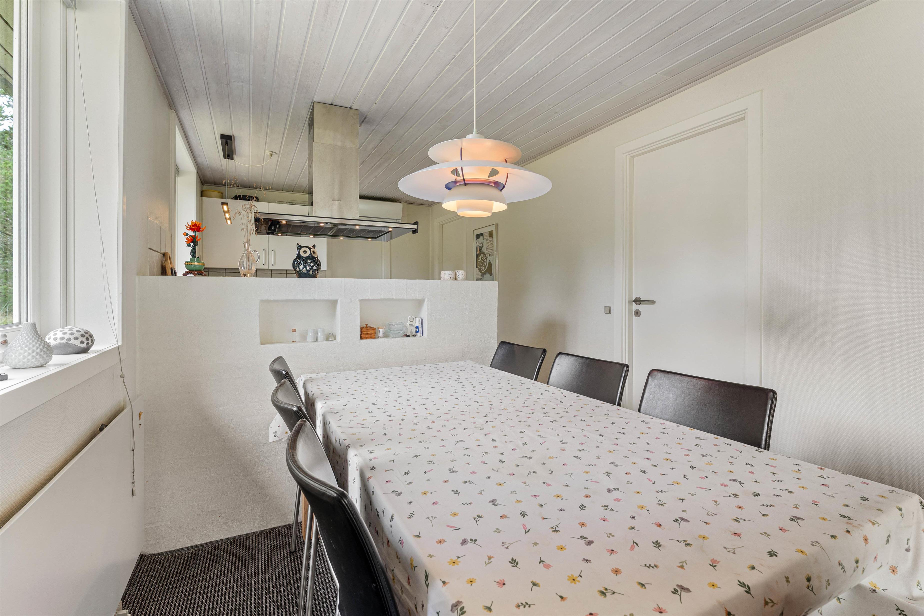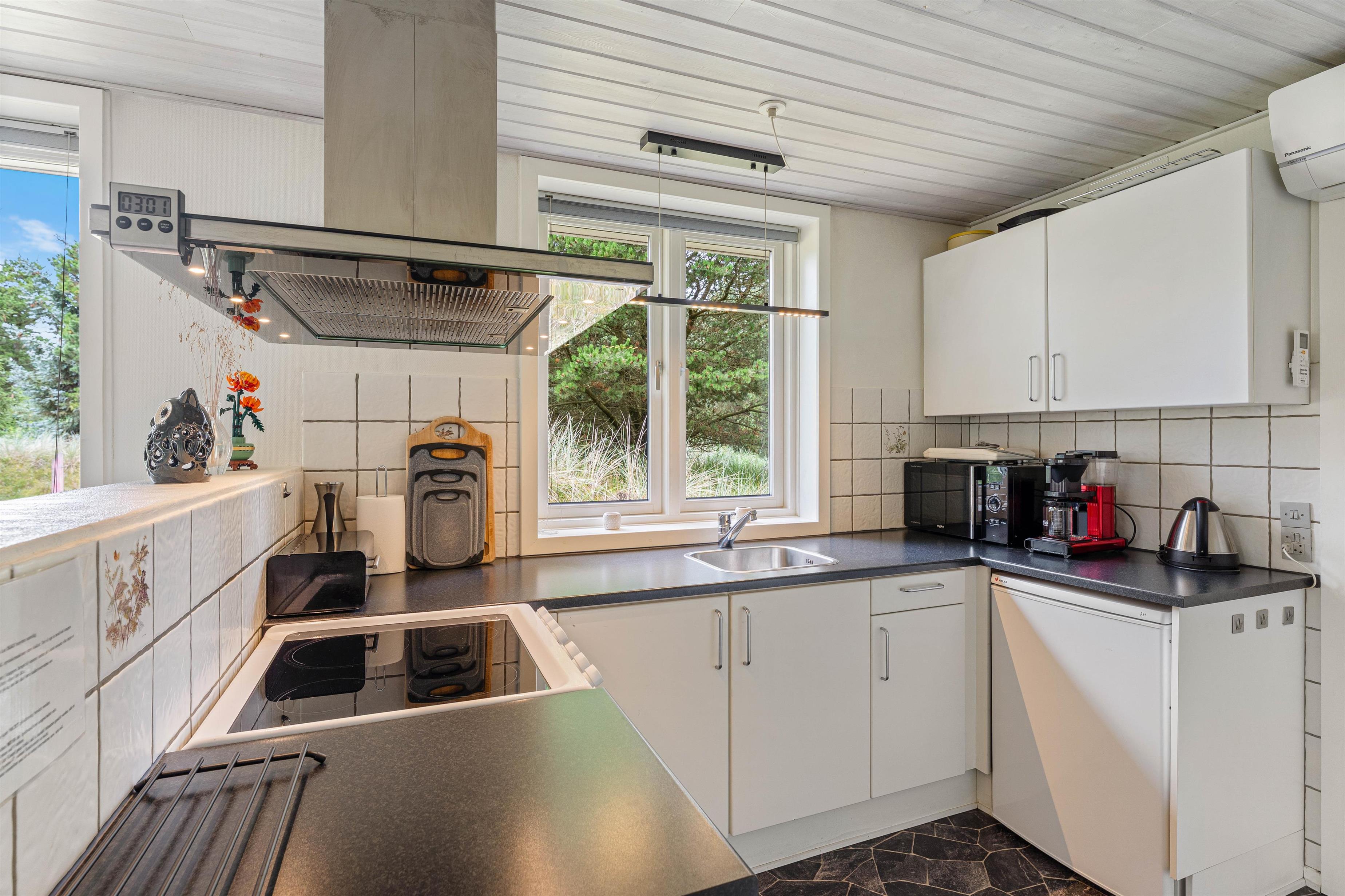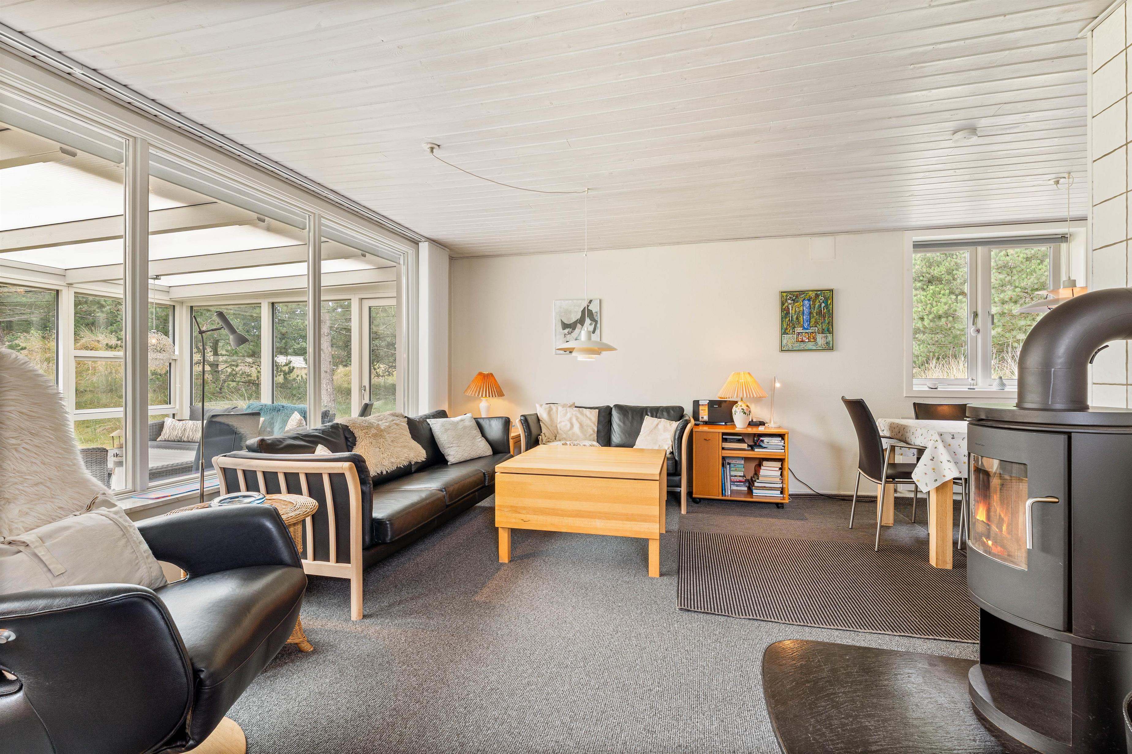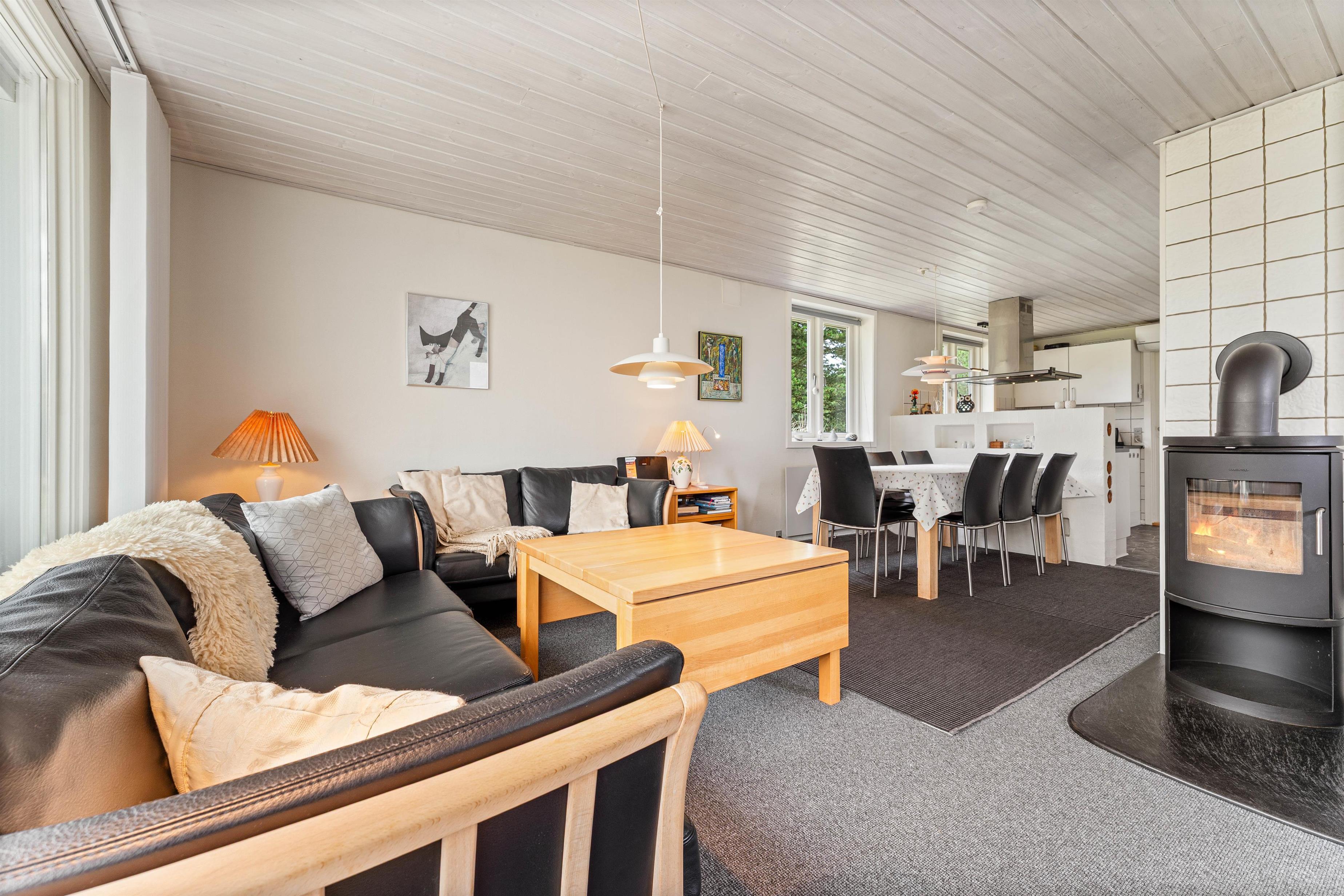 Varmepumpen sørger for, at I året rundt har et behageligt rumklima, og på de kolde dage kan I tænde op i brændeovnen, som sørger for god varme og feriestemning.