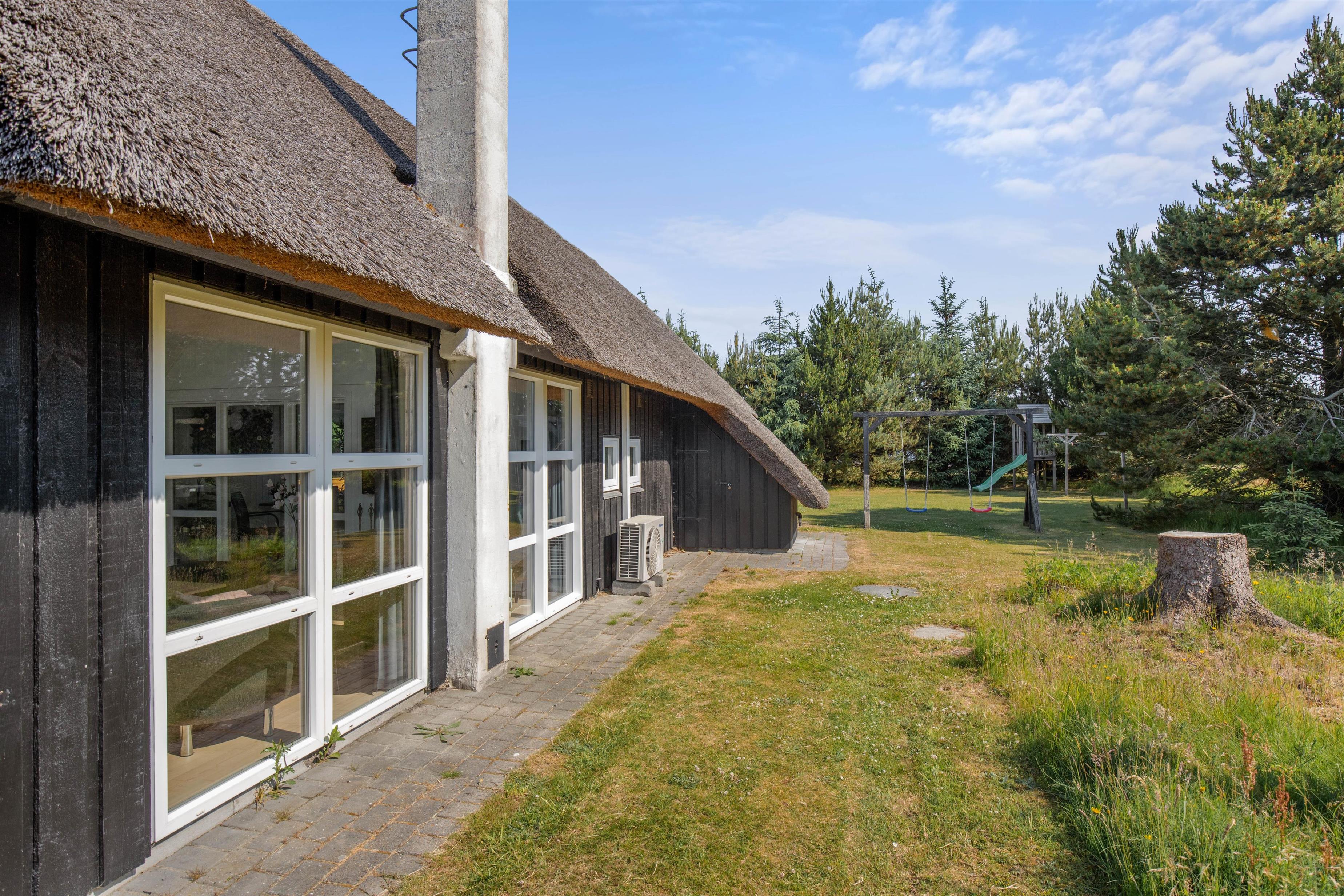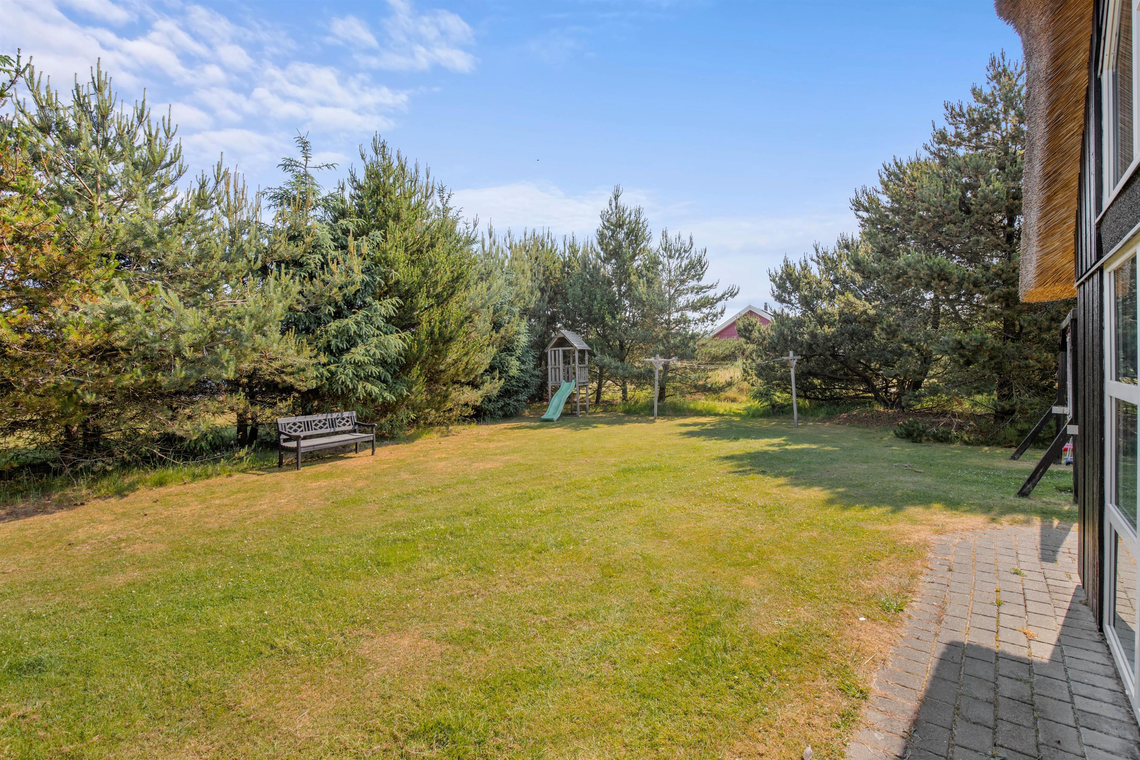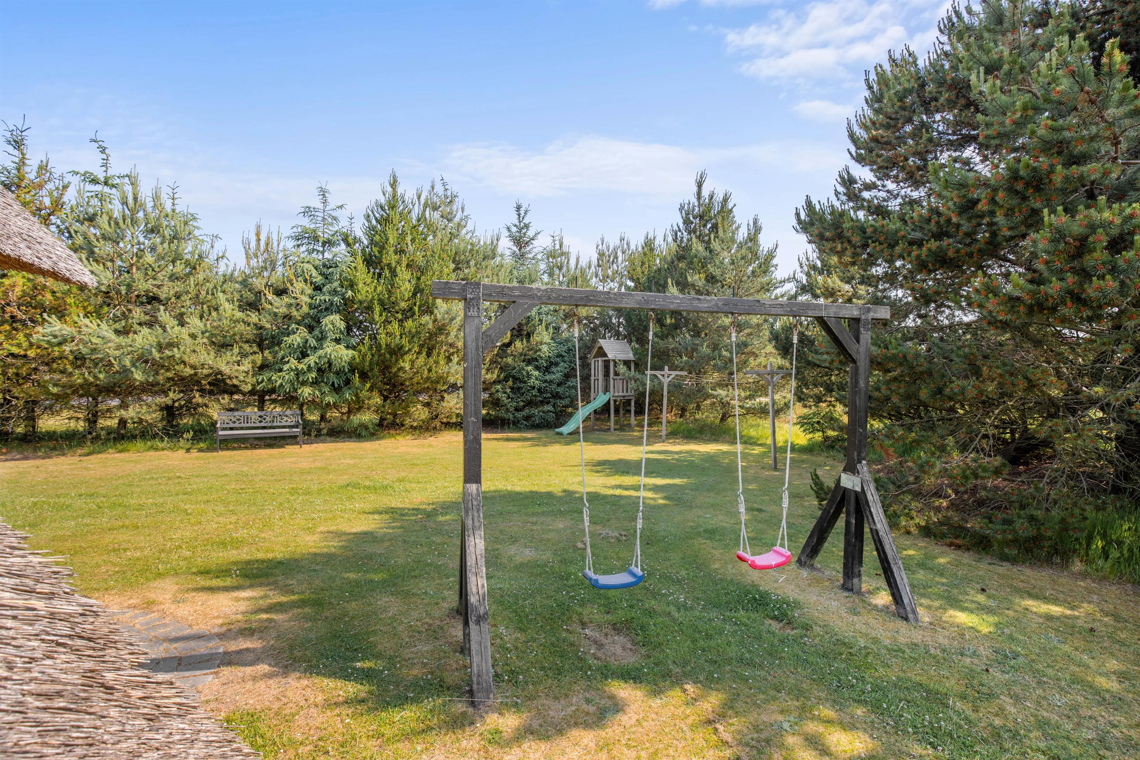 Udenfor omgiver terrassen sommerhuset, og her kan I nyde solen i diverse havemøbler og liggestole. Læn dig tilbage i din valgte liggestol med et godt glas vin i hånden, mens du ser på børnene, der leger i haven. Her er der både et legetårn med rutsjebane og et gyngestativ. I kan også hive grillen frem og tilberede et lækkert måltid.