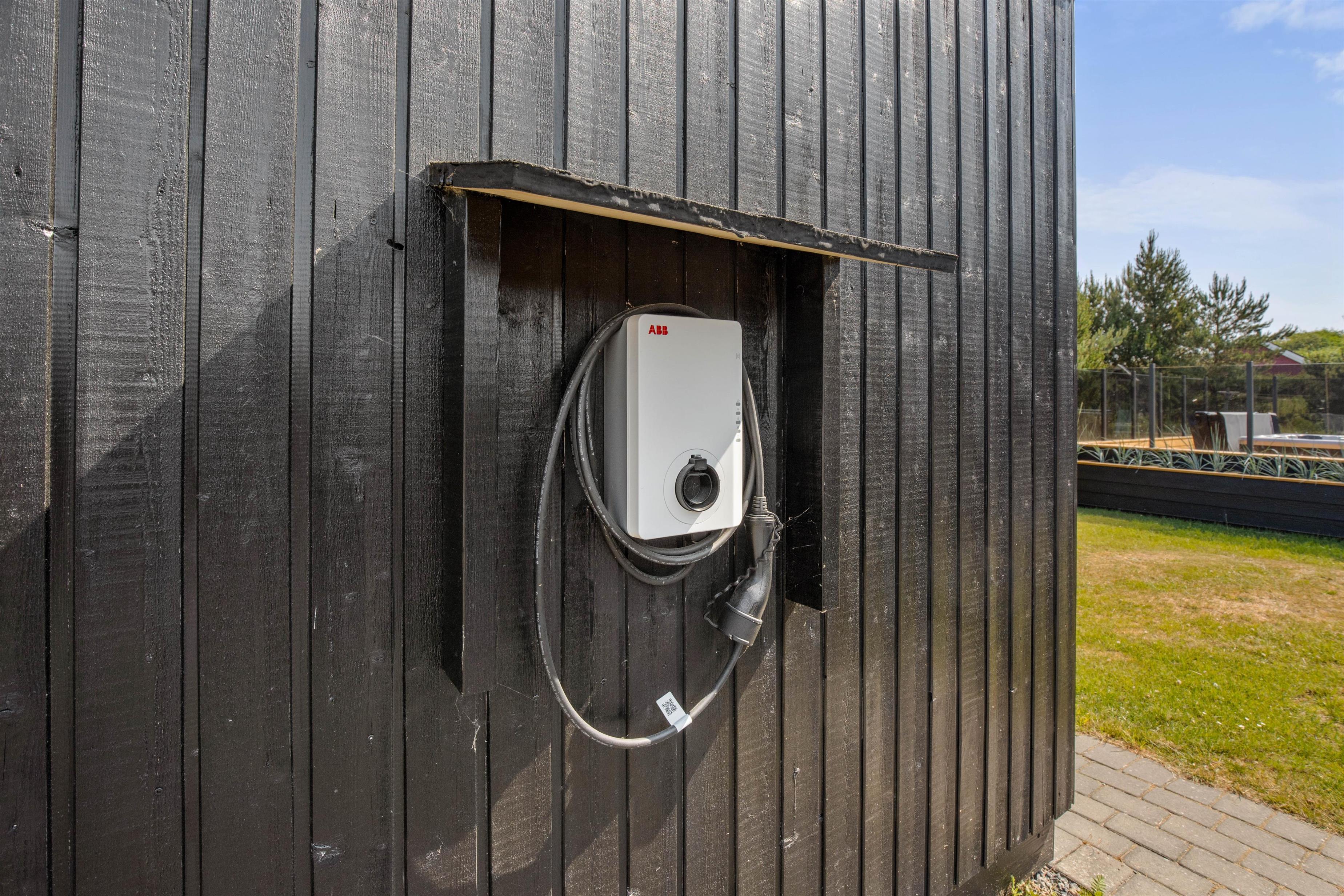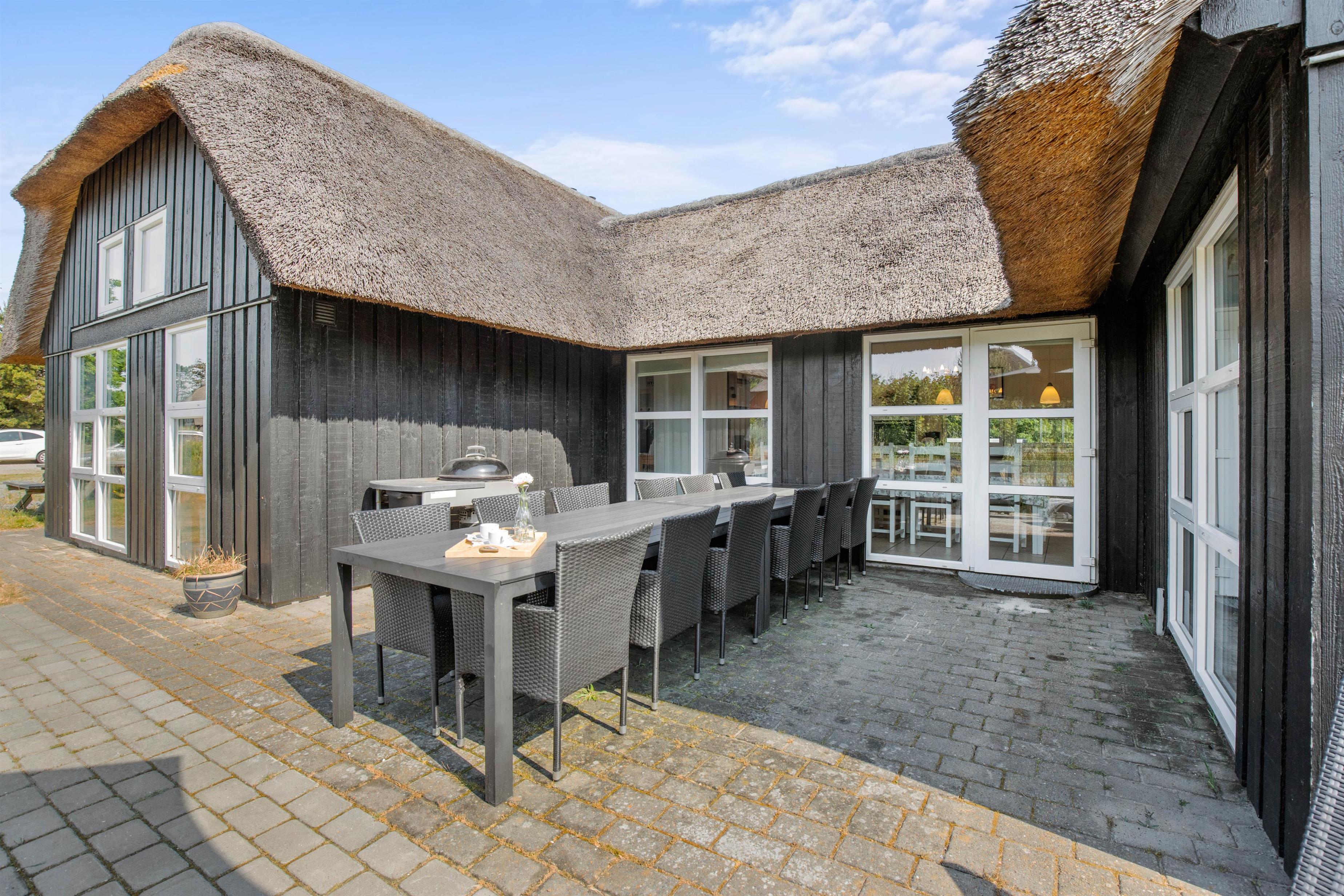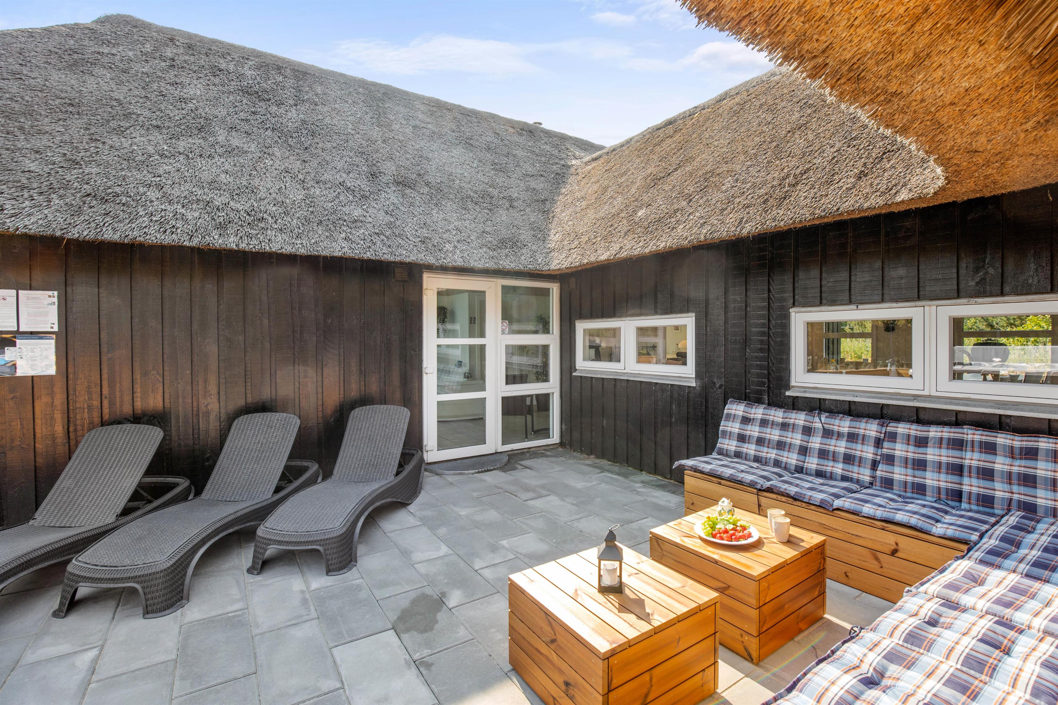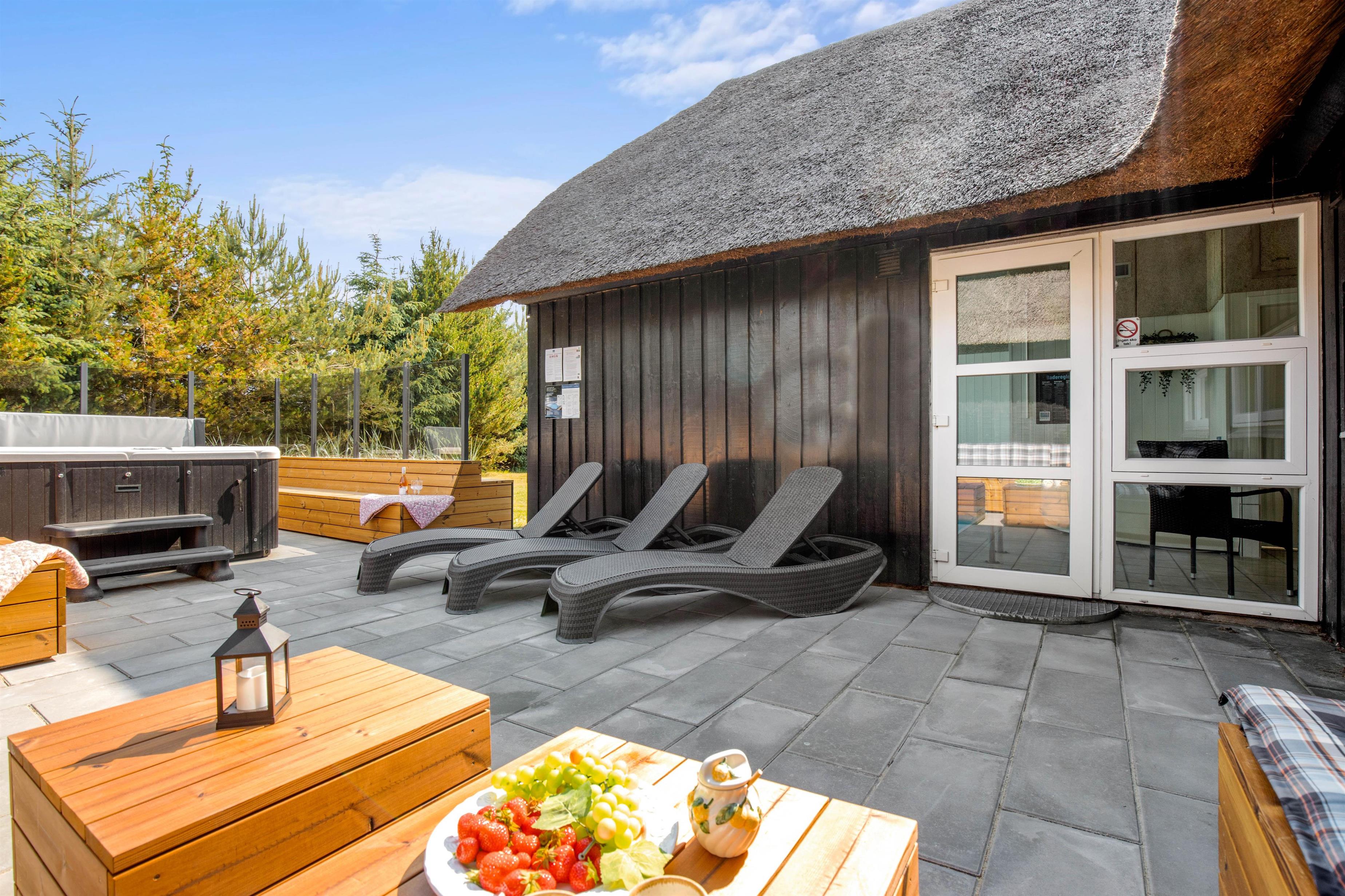 Udenfor omgiver terrassen sommerhuset, og her kan I nyde solen i diverse havemøbler og liggestole. Læn dig tilbage i din valgte liggestol med et godt glas vin i hånden, mens du ser på børnene, der leger i haven. Her er der både et legetårn med rutsjebane og et gyngestativ. I kan også hive grillen frem og tilberede et lækkert måltid.