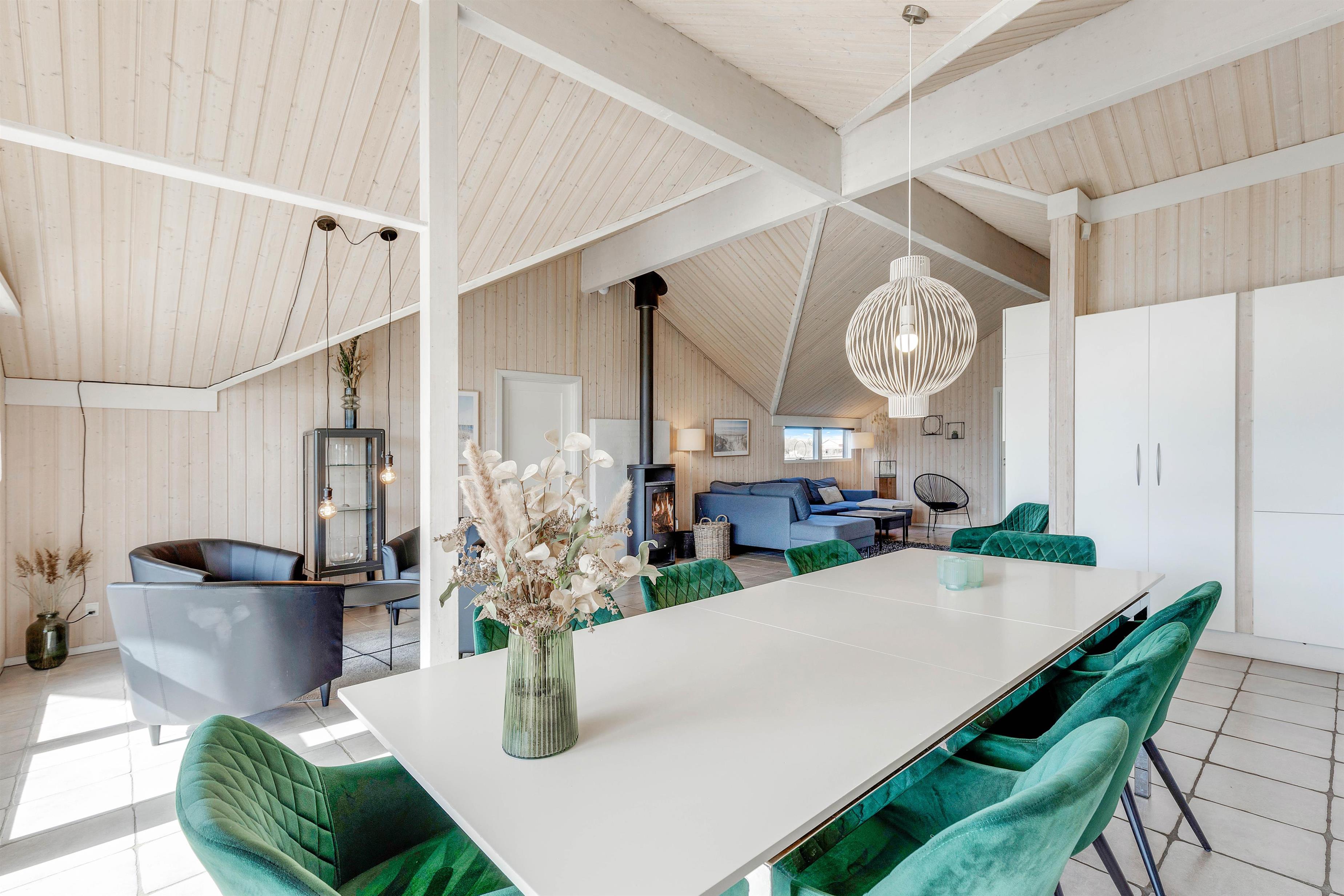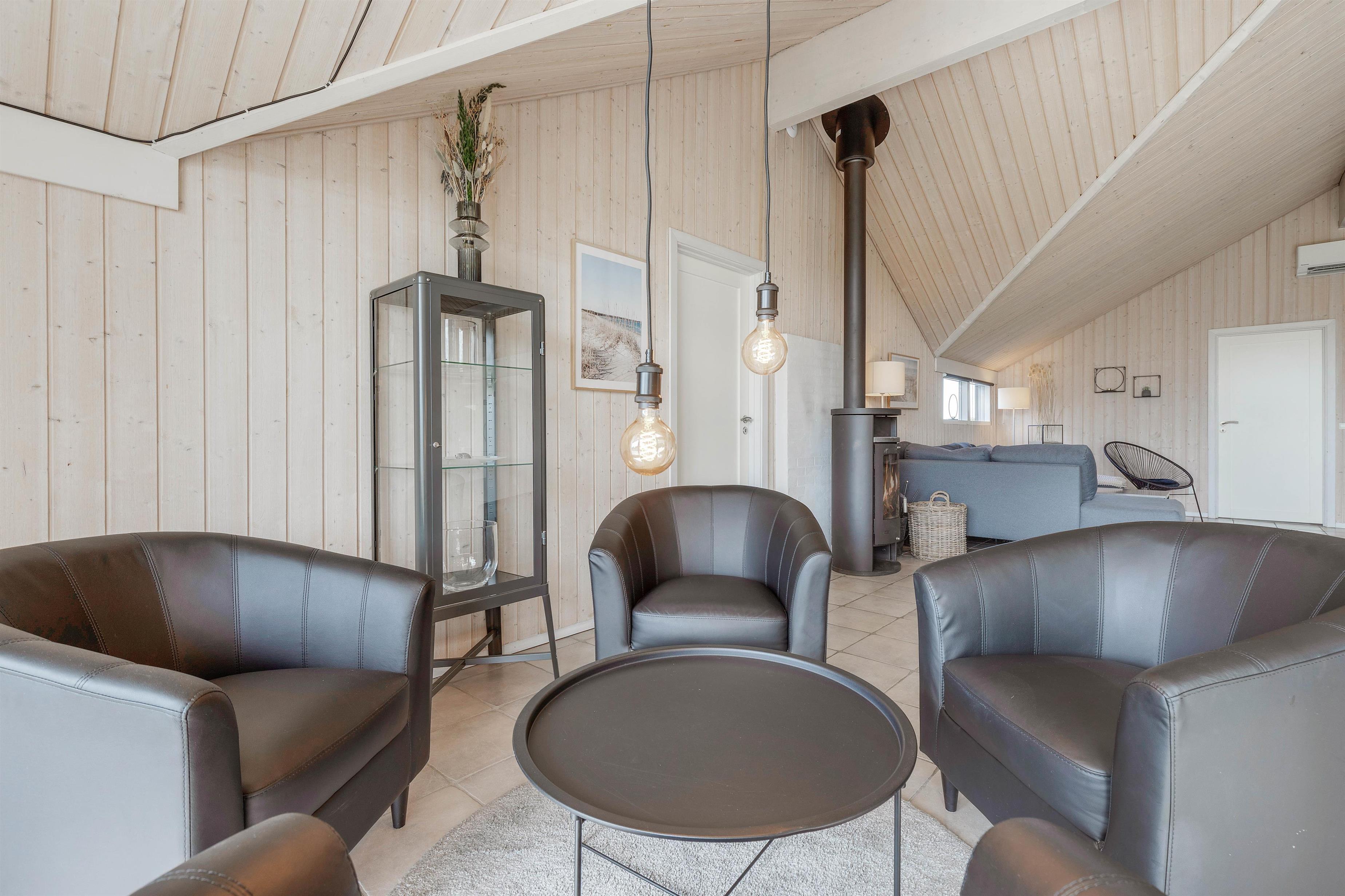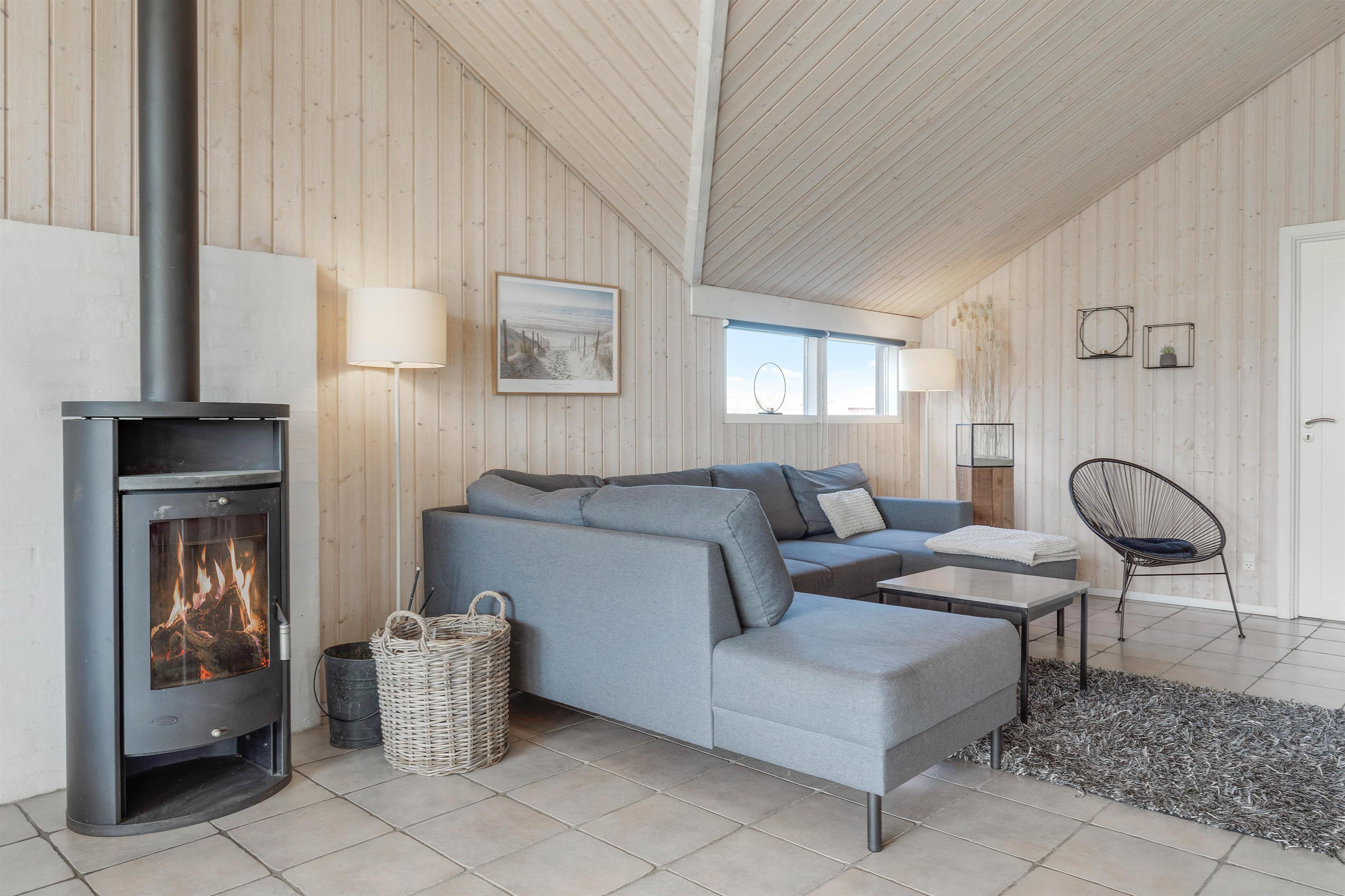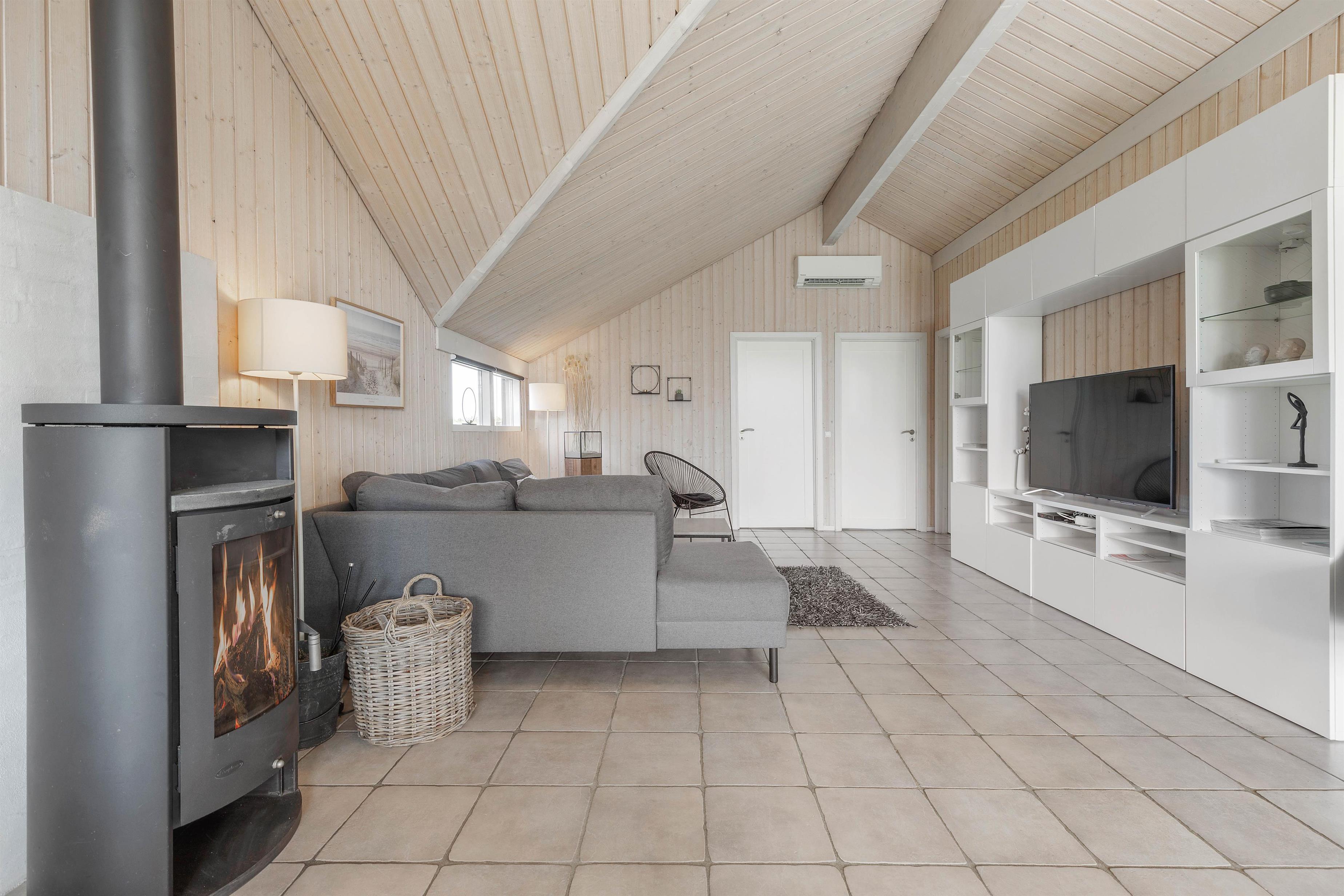 Hjertet i feriehuset er det store alrum, hvor køkken, spiseplads og stue er forenet. Her er der rig mulighed for, at I kan nyde hinandens selskab. Brændeovnen sætter prikken over i’et for feriestemningen med sin knitren og varme.